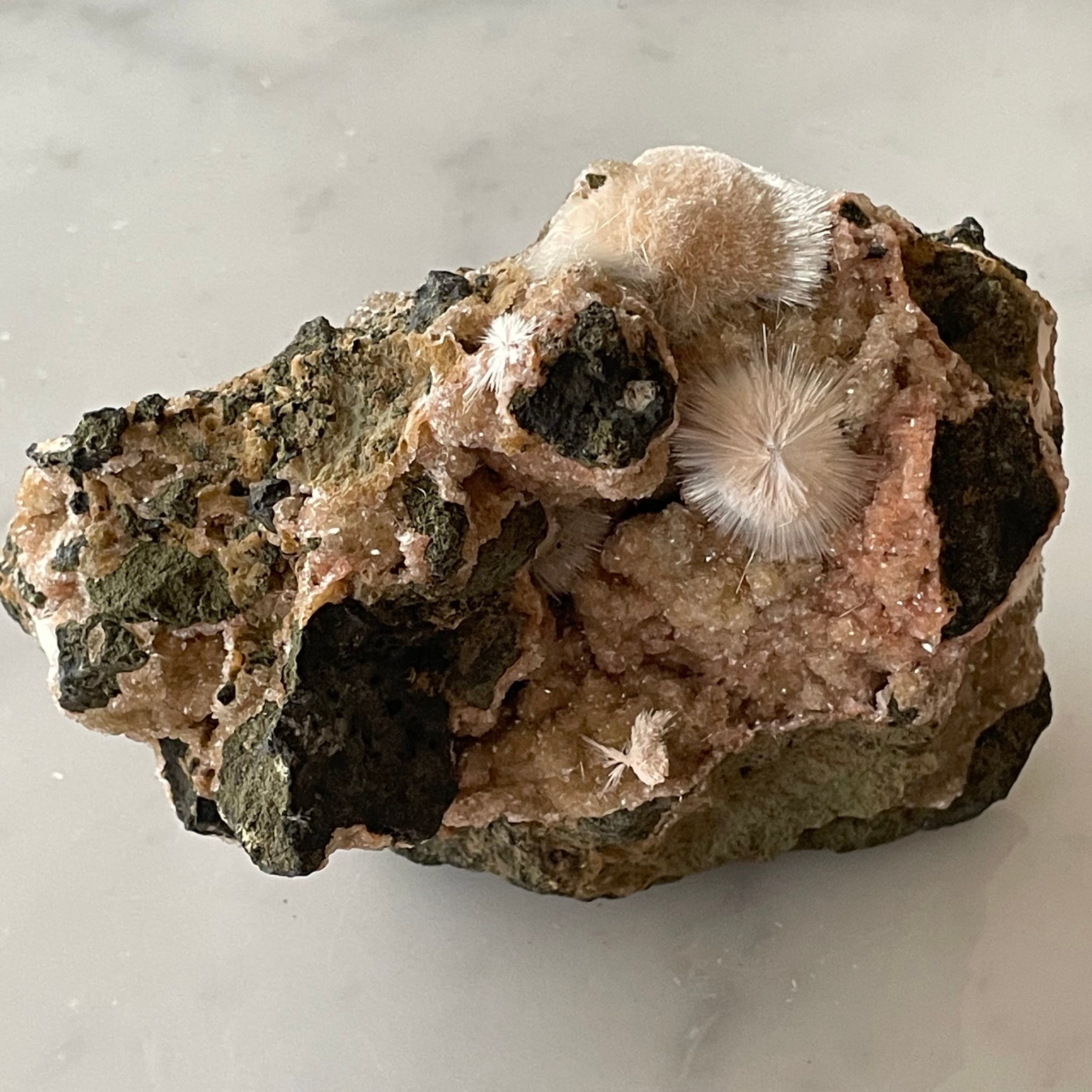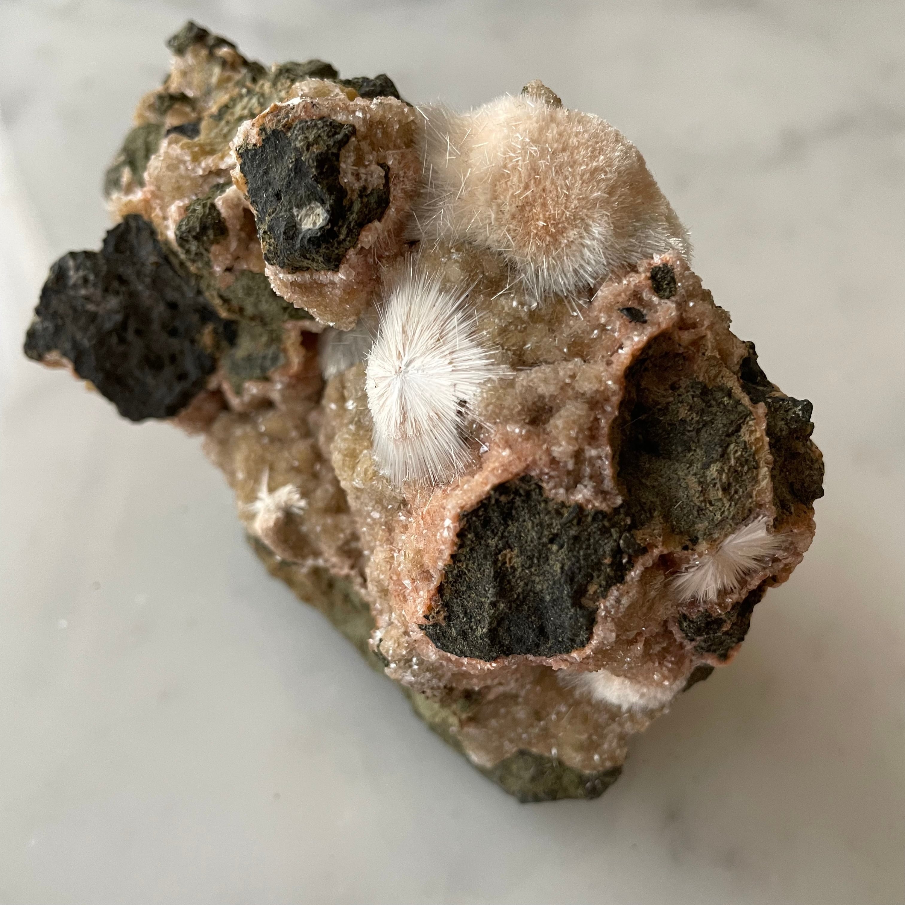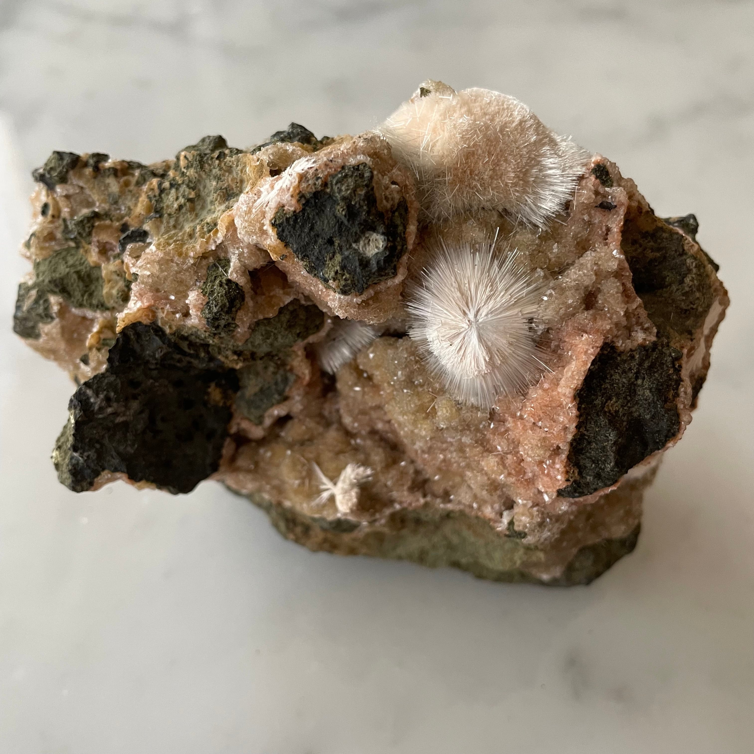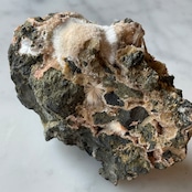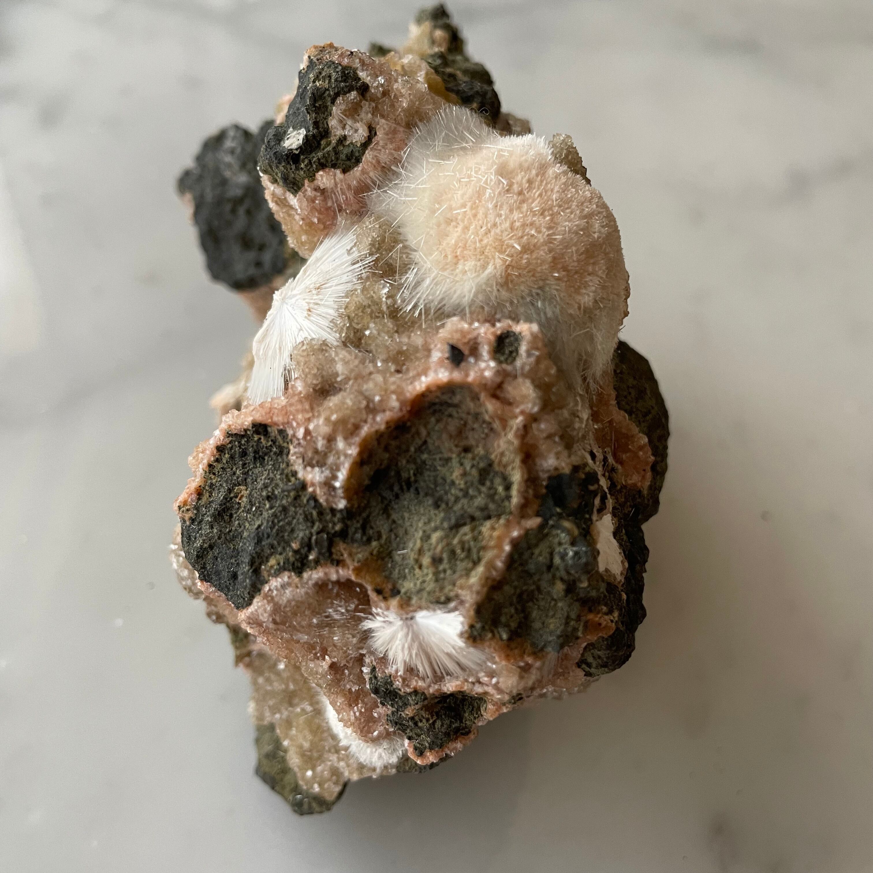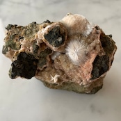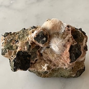 ピンクベージュのトムソナイトと白い毛状のメソライトの原石です。母岩にグラデーションの美しい微細なヒューランダイトが共生していて星のような輝きと相反して無骨で個性的な母岩のフォルムも魅力です。