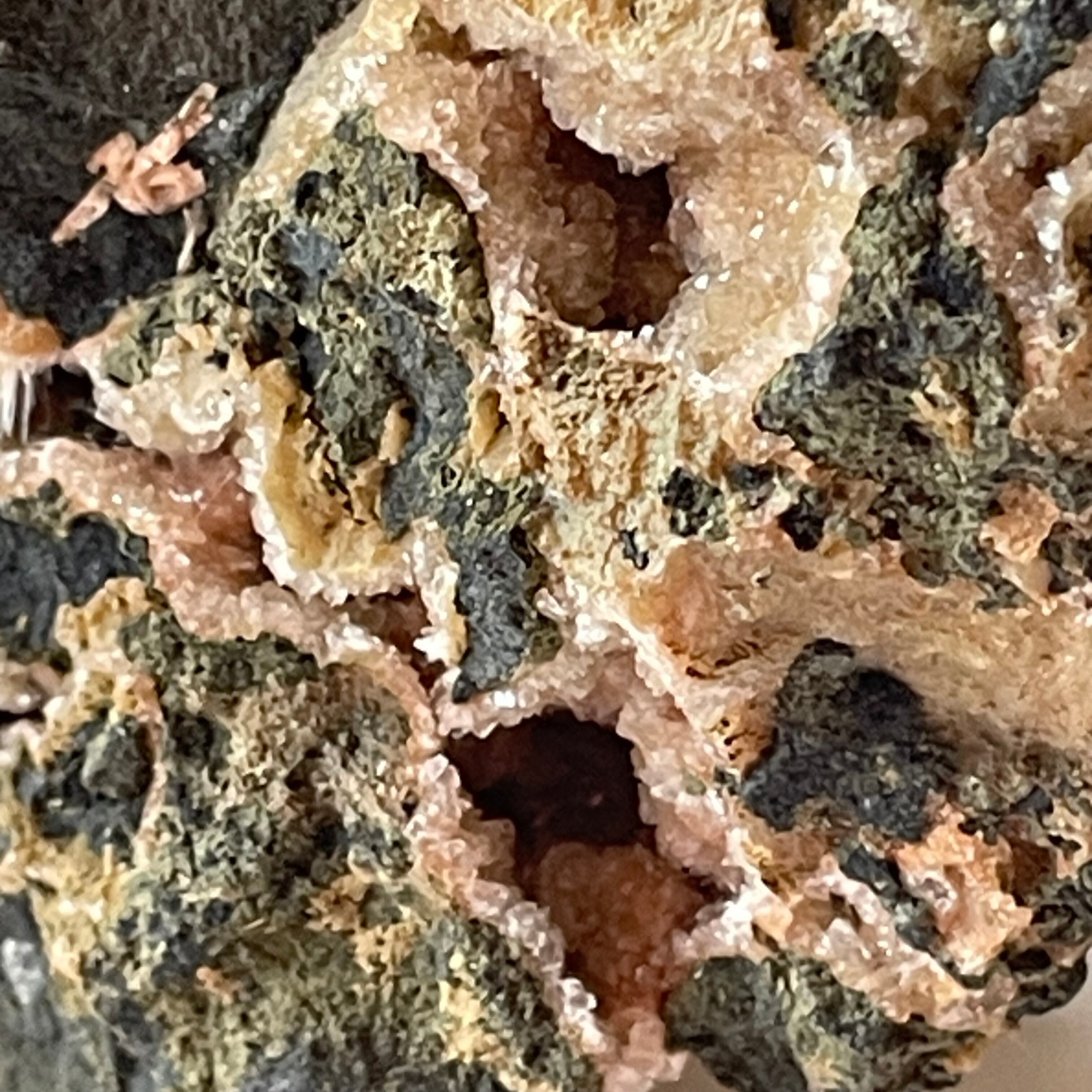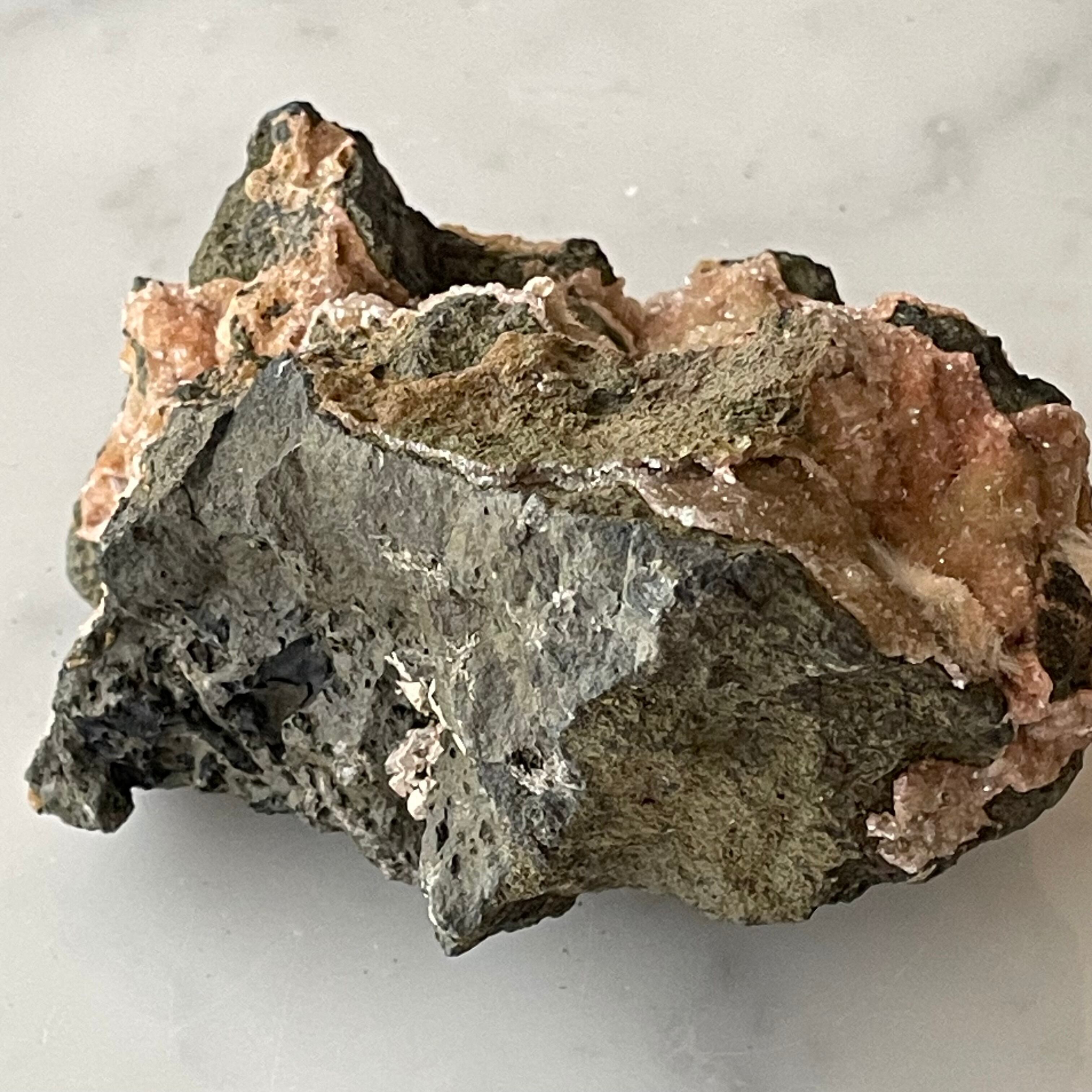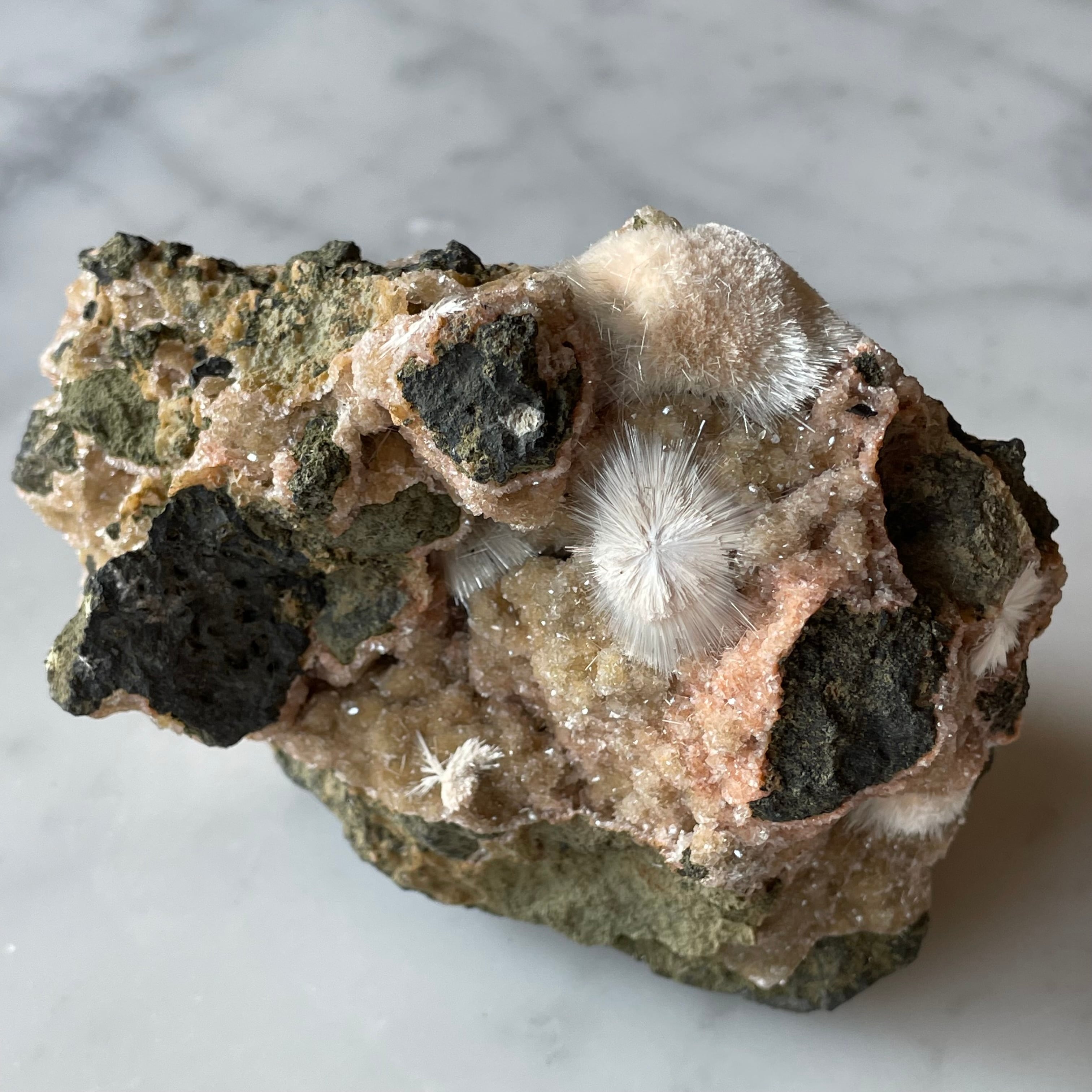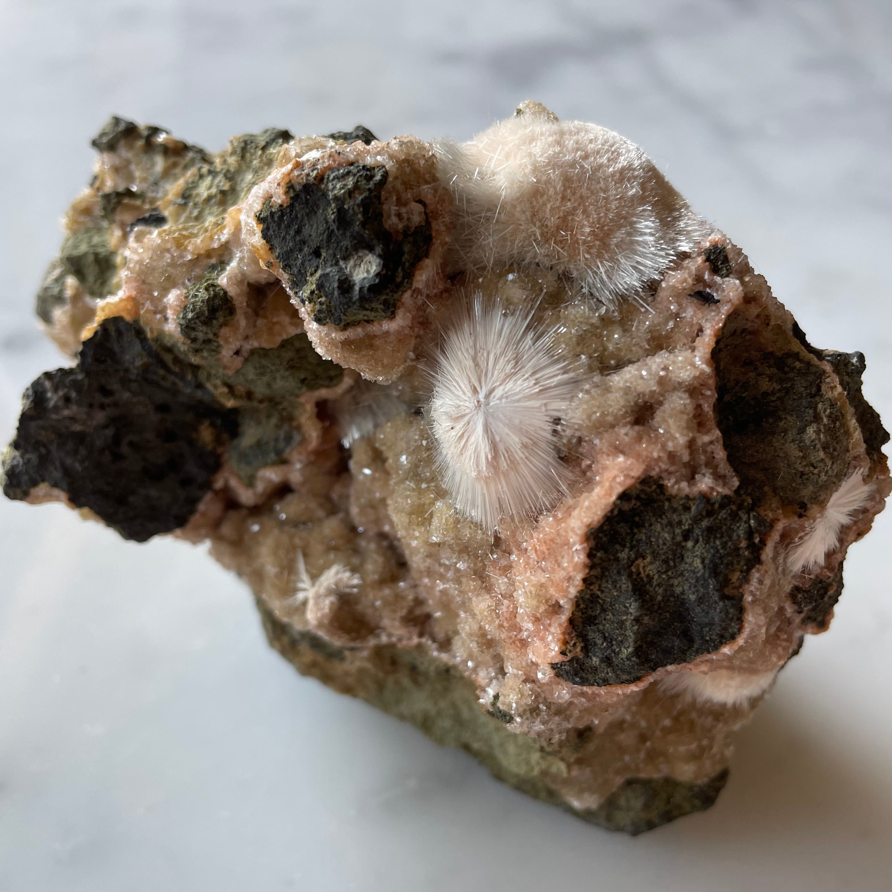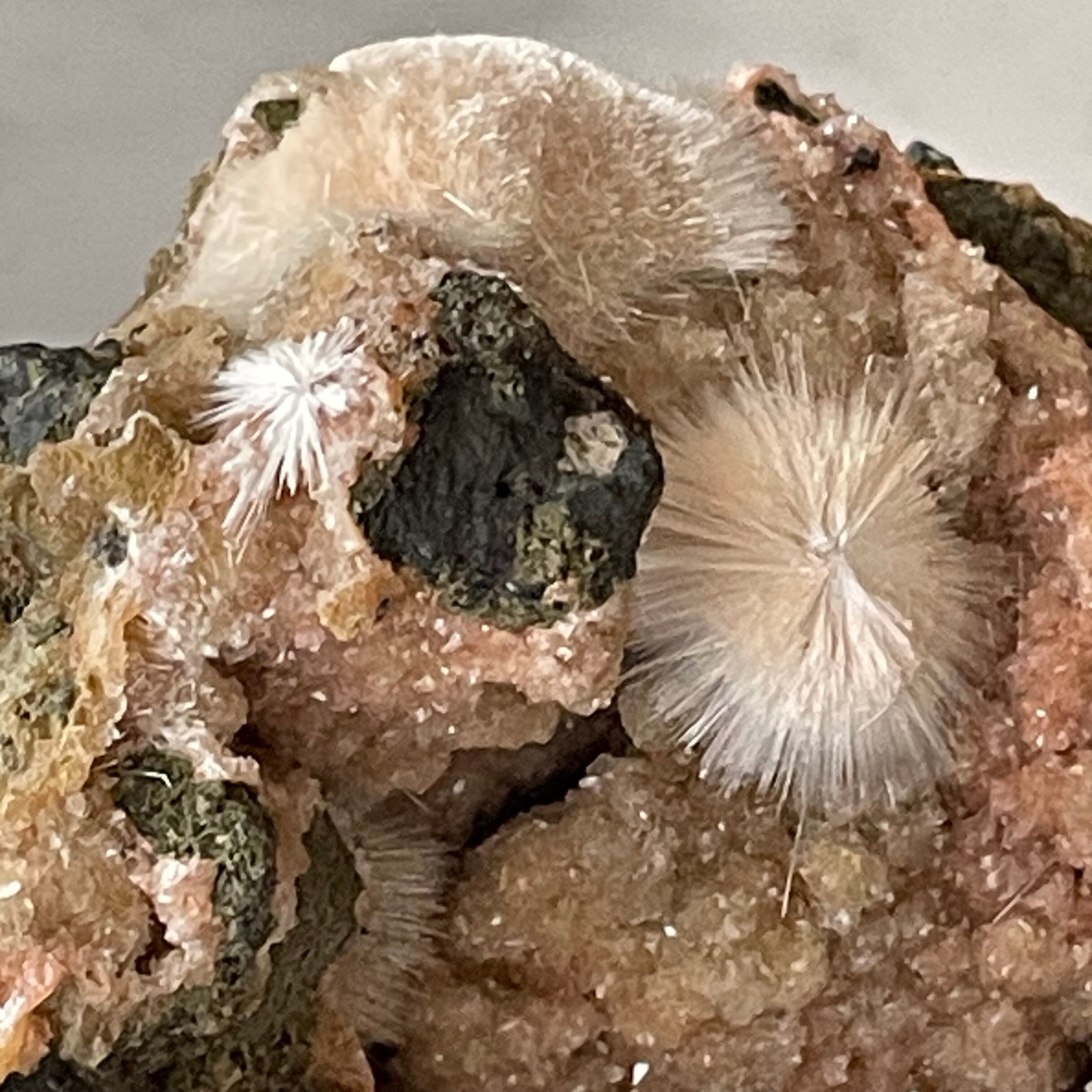 ピンクベージュのトムソナイトと白い毛状のメソライトの原石です。母岩にグラデーションの美しい微細なヒューランダイトが共生していて星のような輝きと相反して無骨で個性的な母岩のフォルムも魅力です。