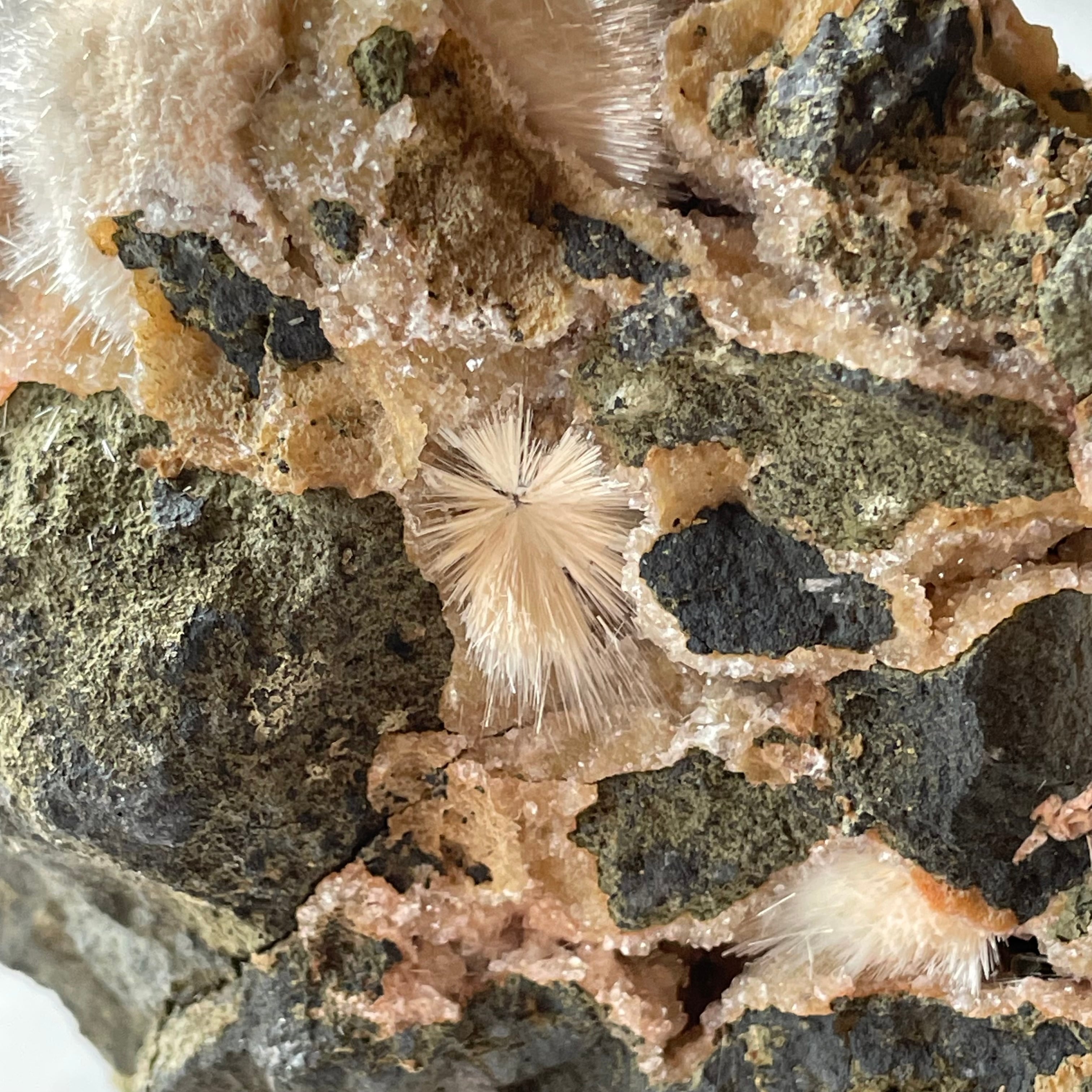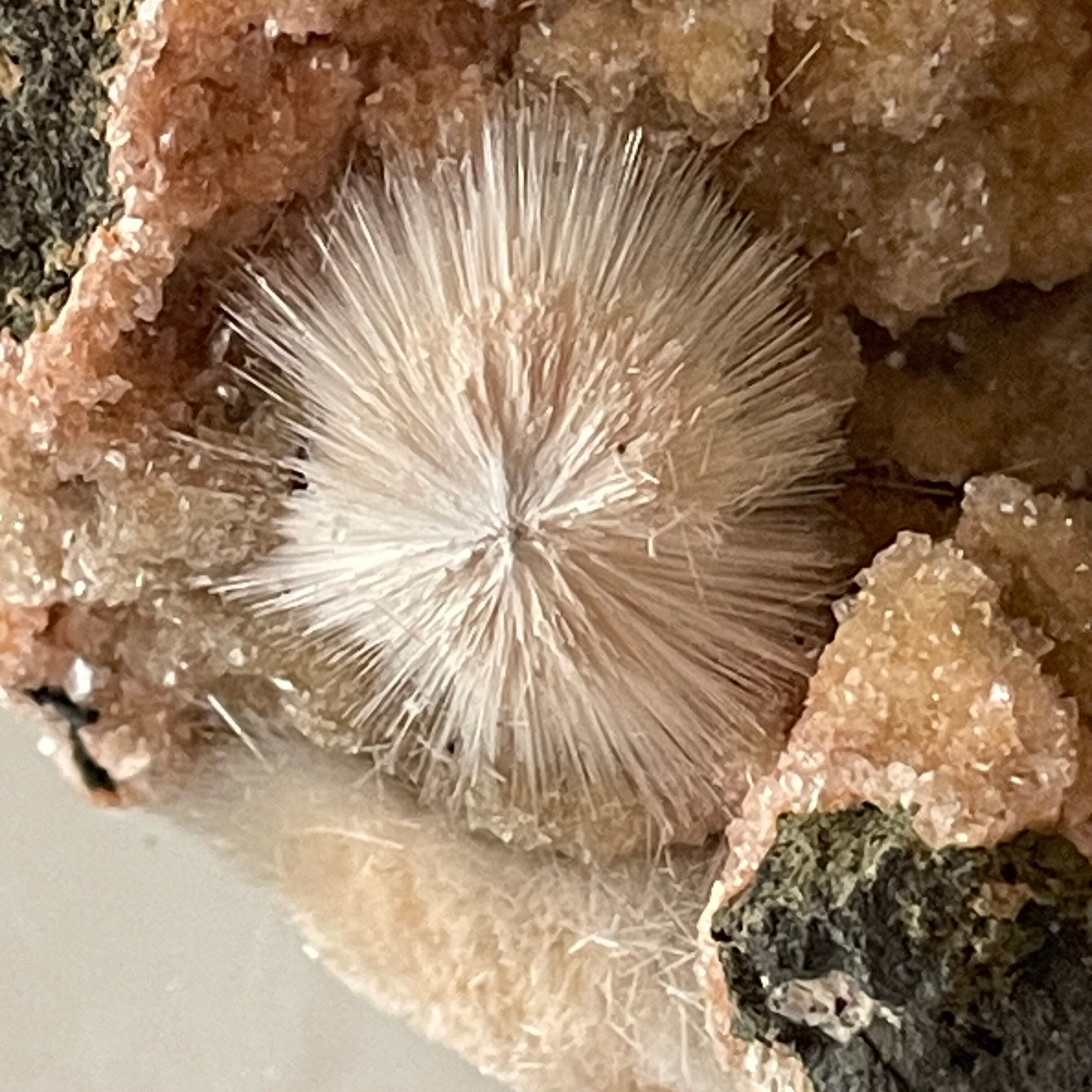 メソライトはゼオライト(沸石)グループの仲間で、多くは玄武岩の空洞内や熱水鉱脈に産出し、無色透明〜白色、淡黄色の針状〜柱状の結晶が放射状に密集したものや緻密な塊に形成されます。メソライトはスコレス沸石やソーダ沸石と形態的に似ていて、またこれら三種が結晶内に共存していることもあり肉眼では区別が難しいといわれています。