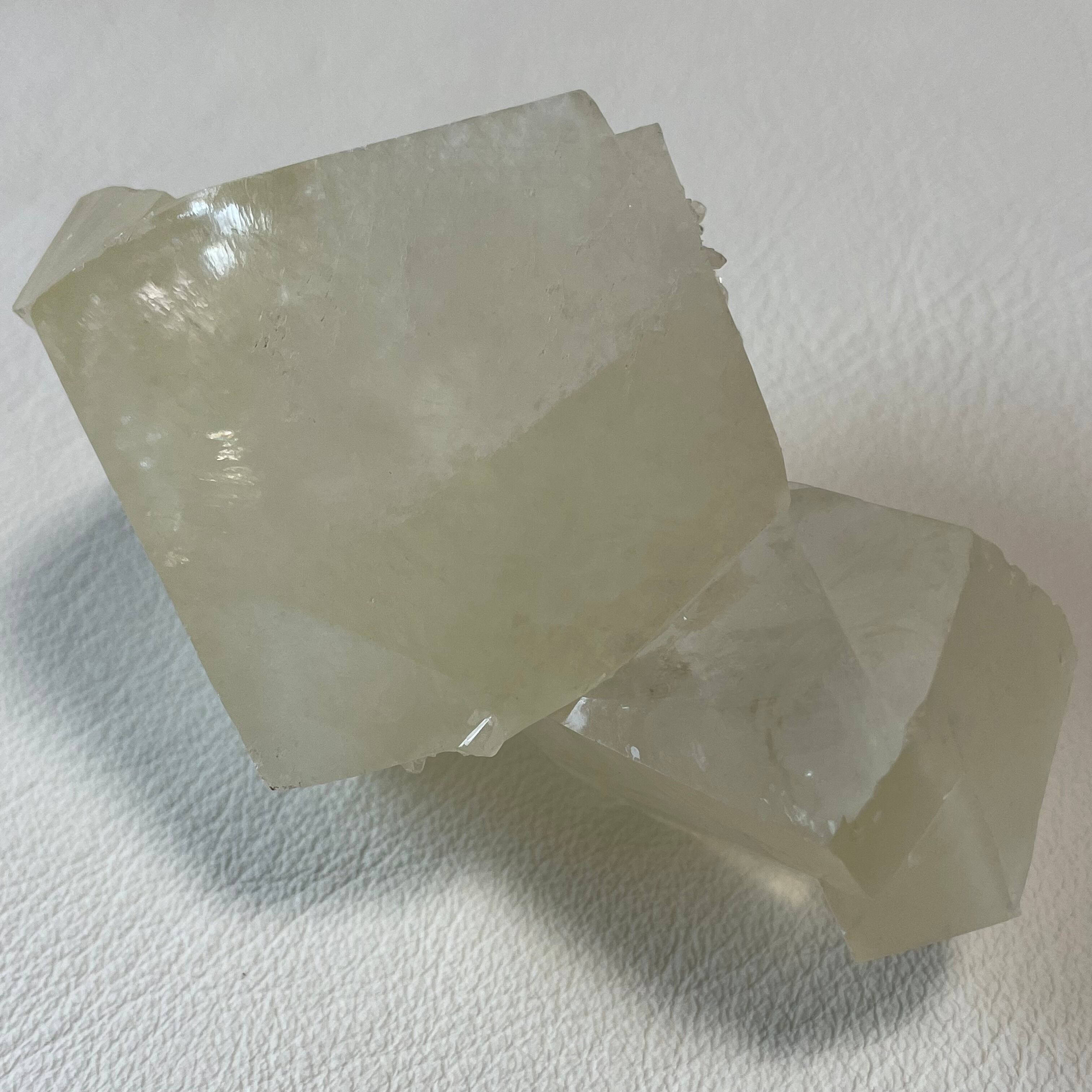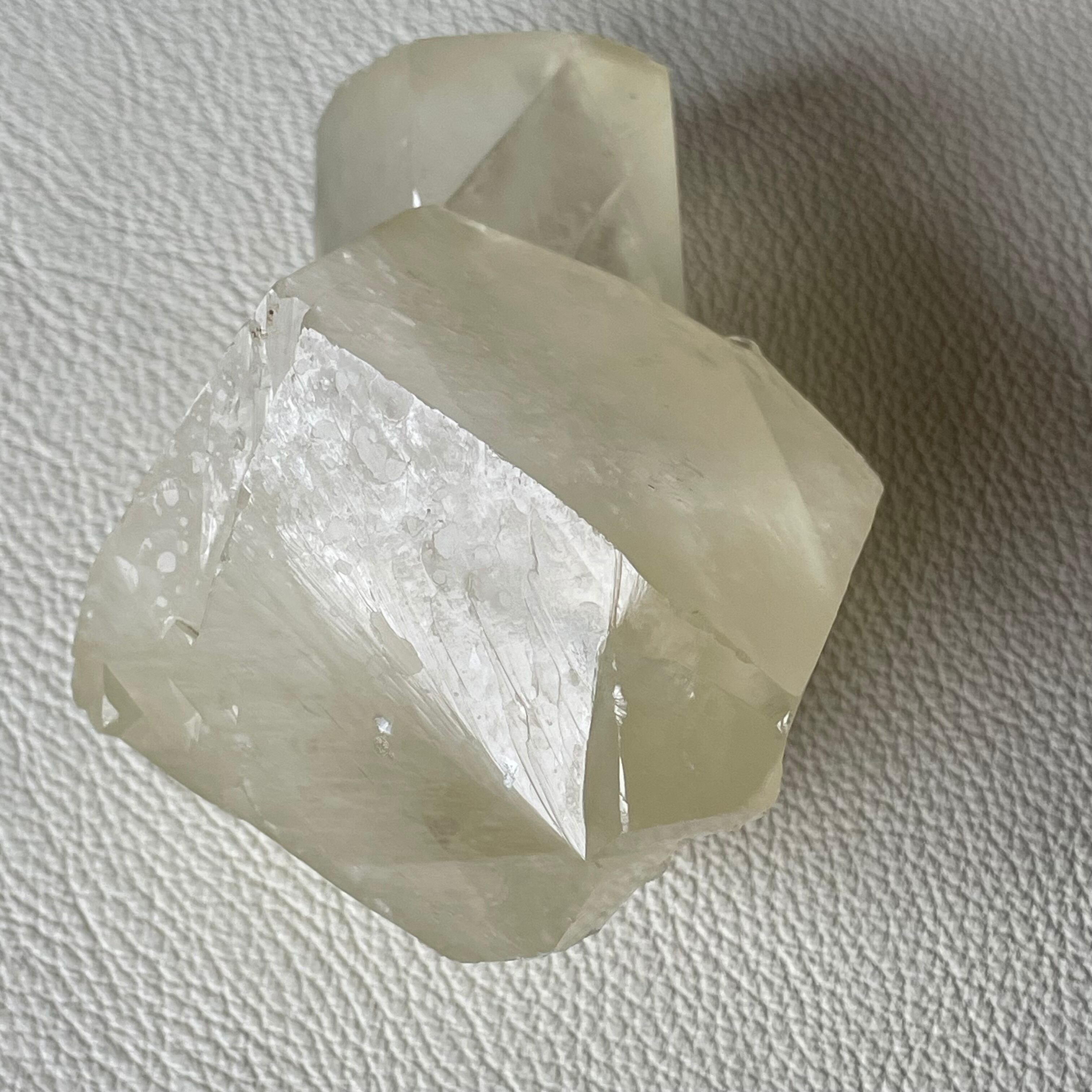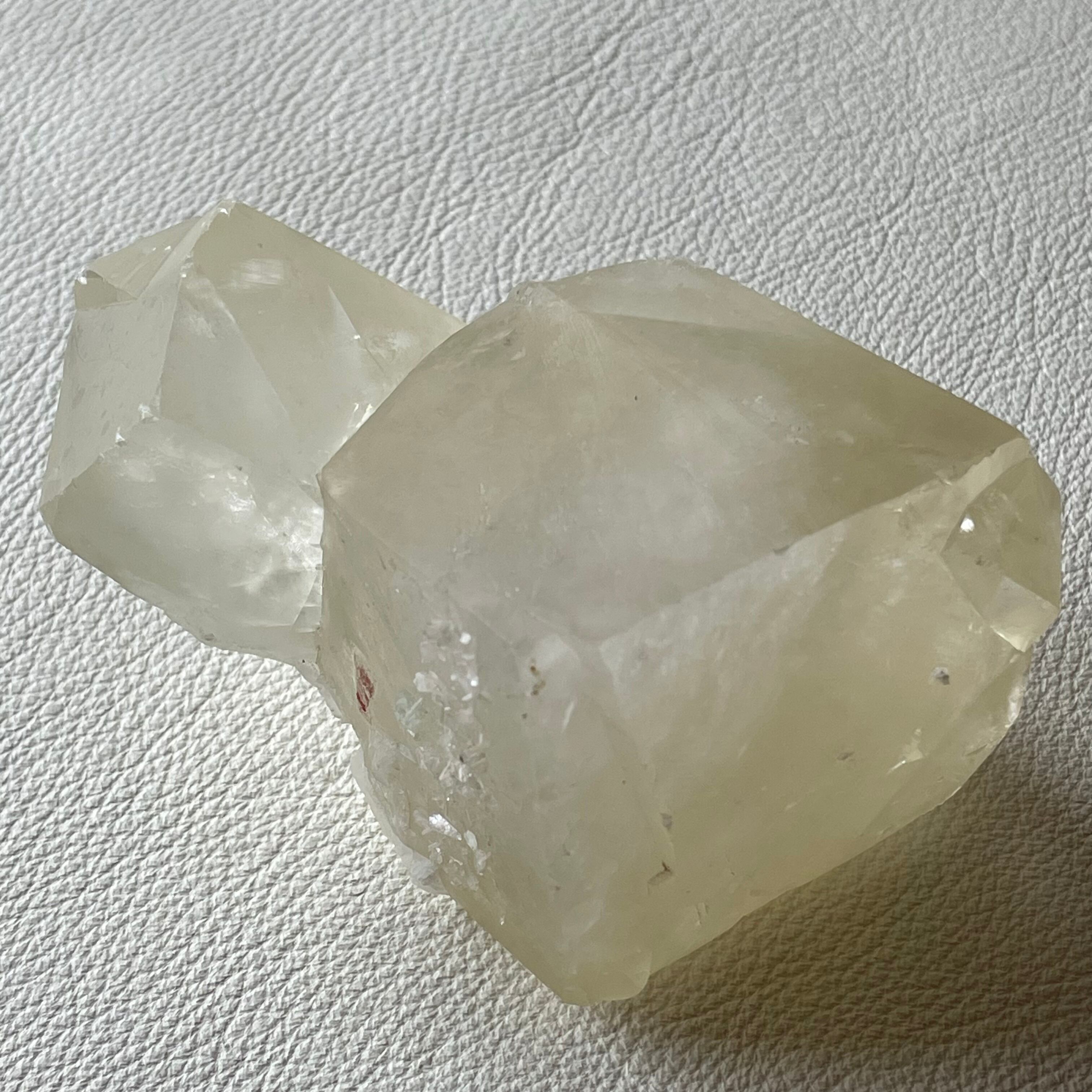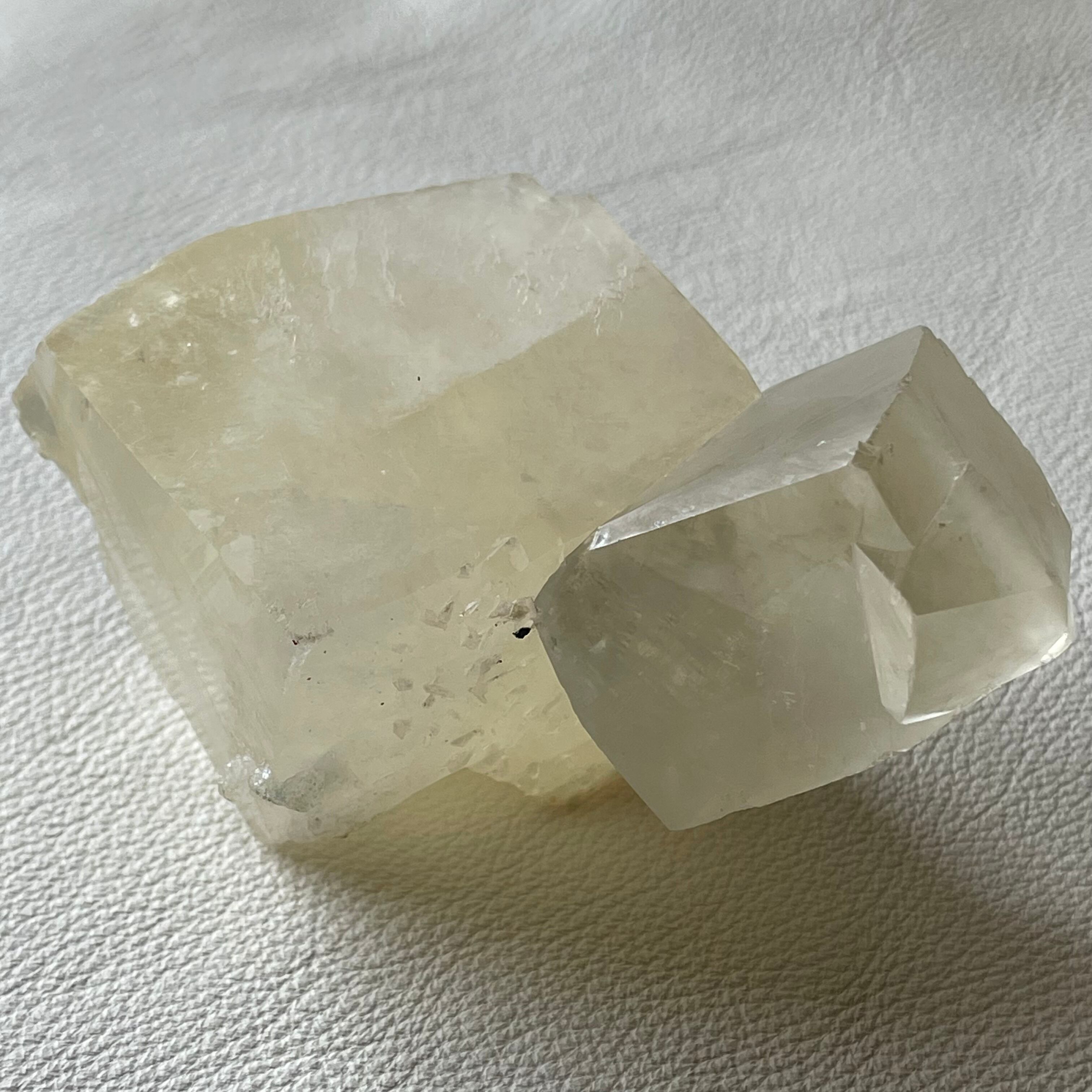 シルキーな光沢を持つイエローカルサイトです。親子のような佇まいの双晶で大きな結晶が存在感を放っています。