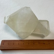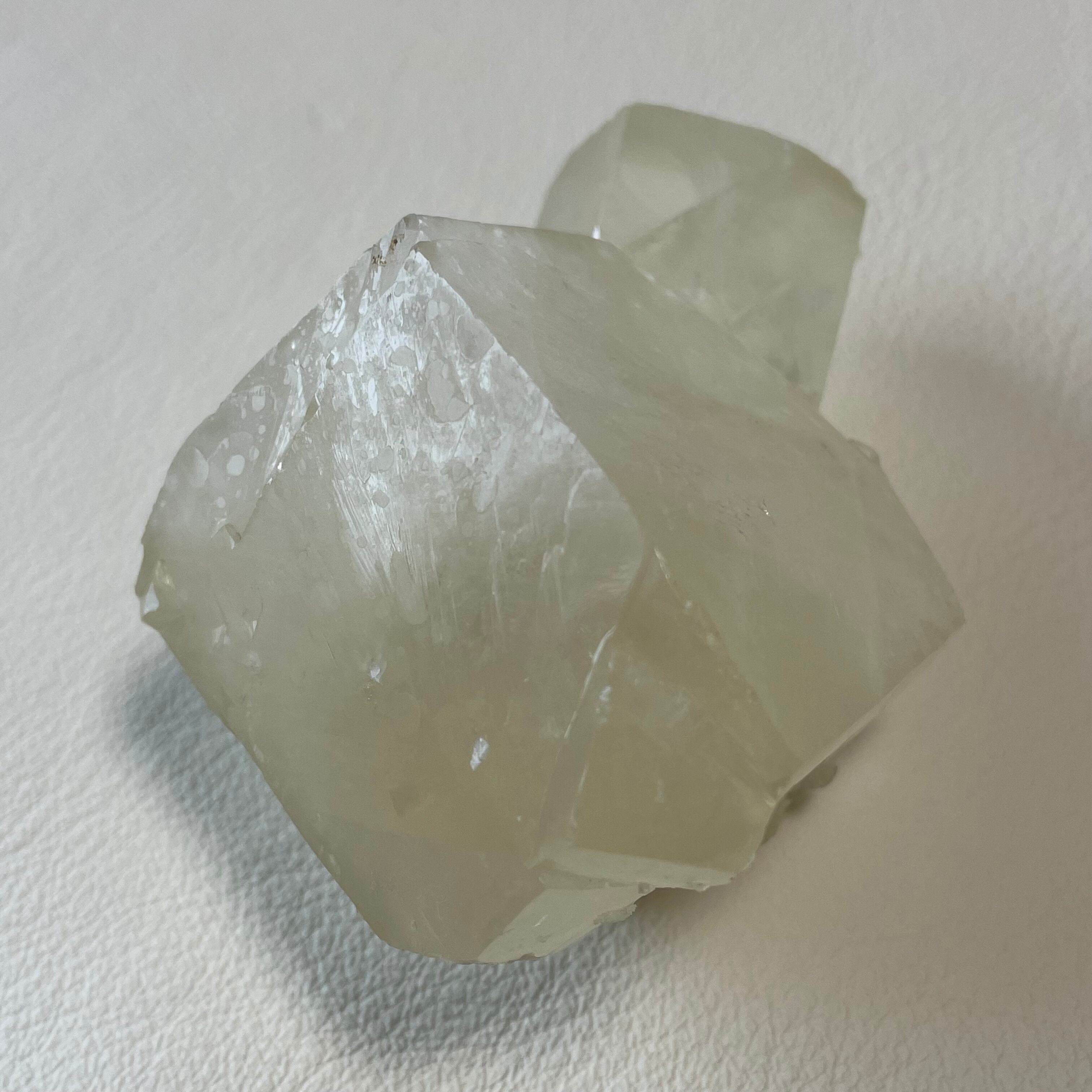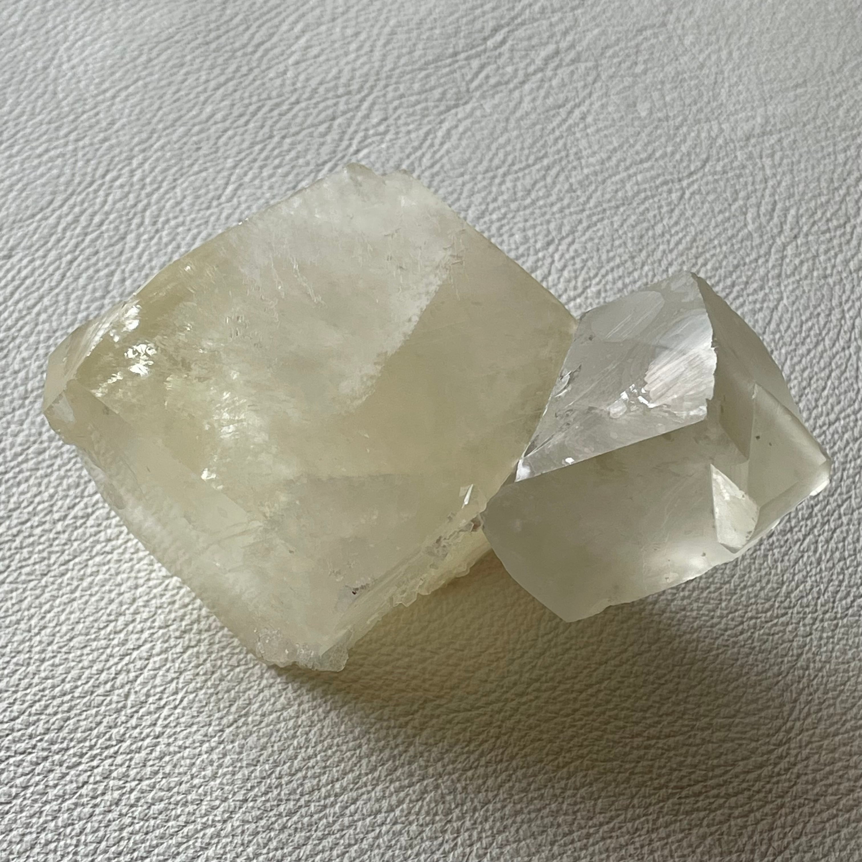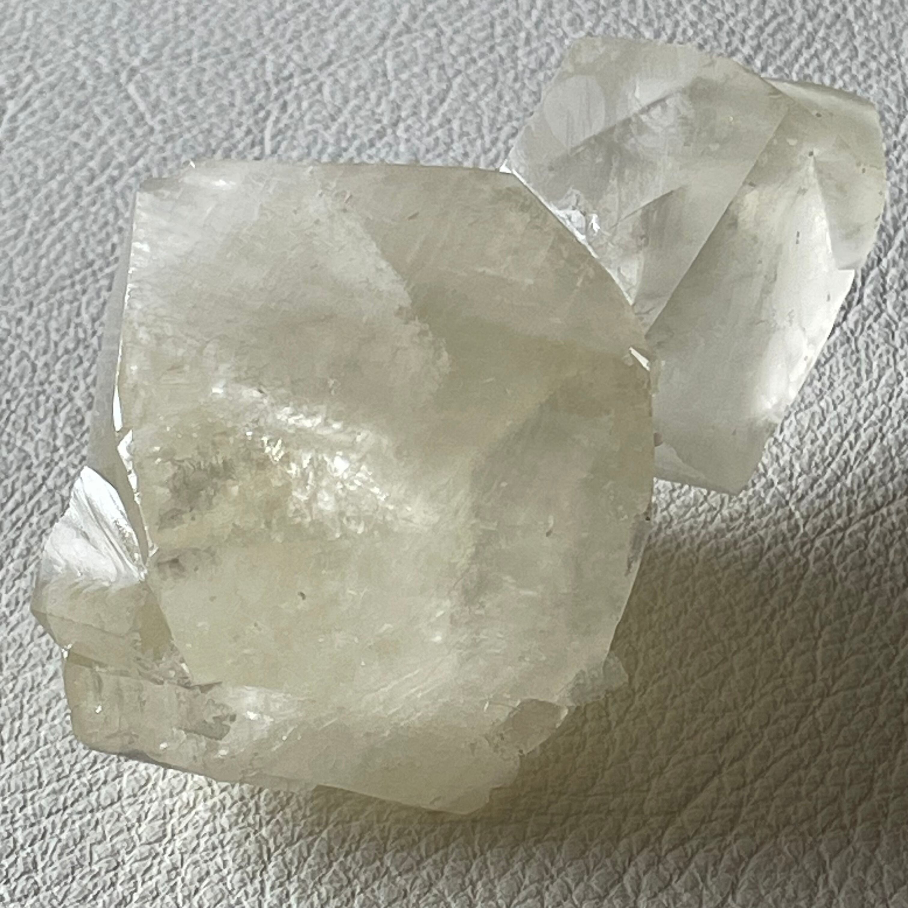 シルキーな光沢を持つイエローカルサイトです。親子のような佇まいの双晶で大きな結晶が存在感を放っています。