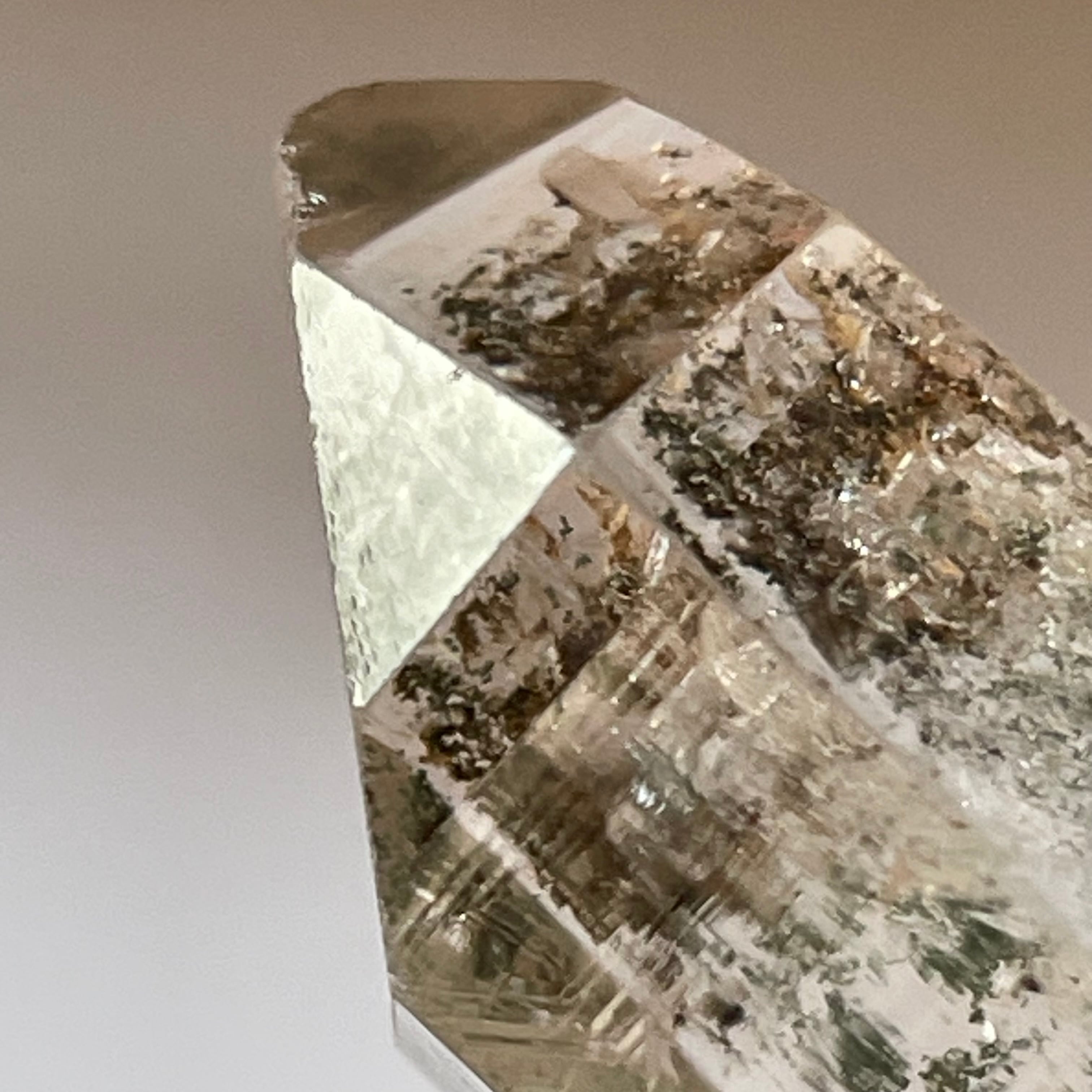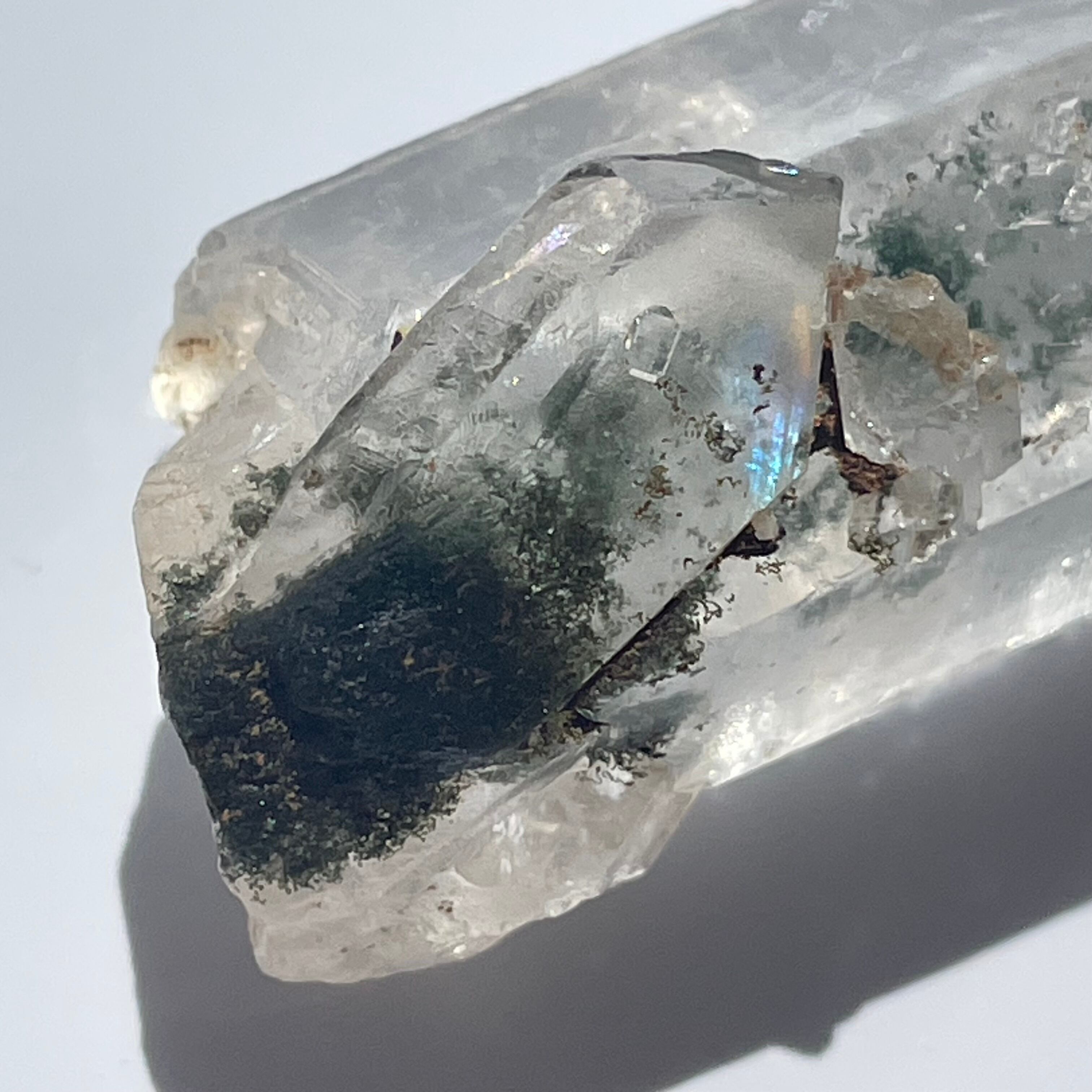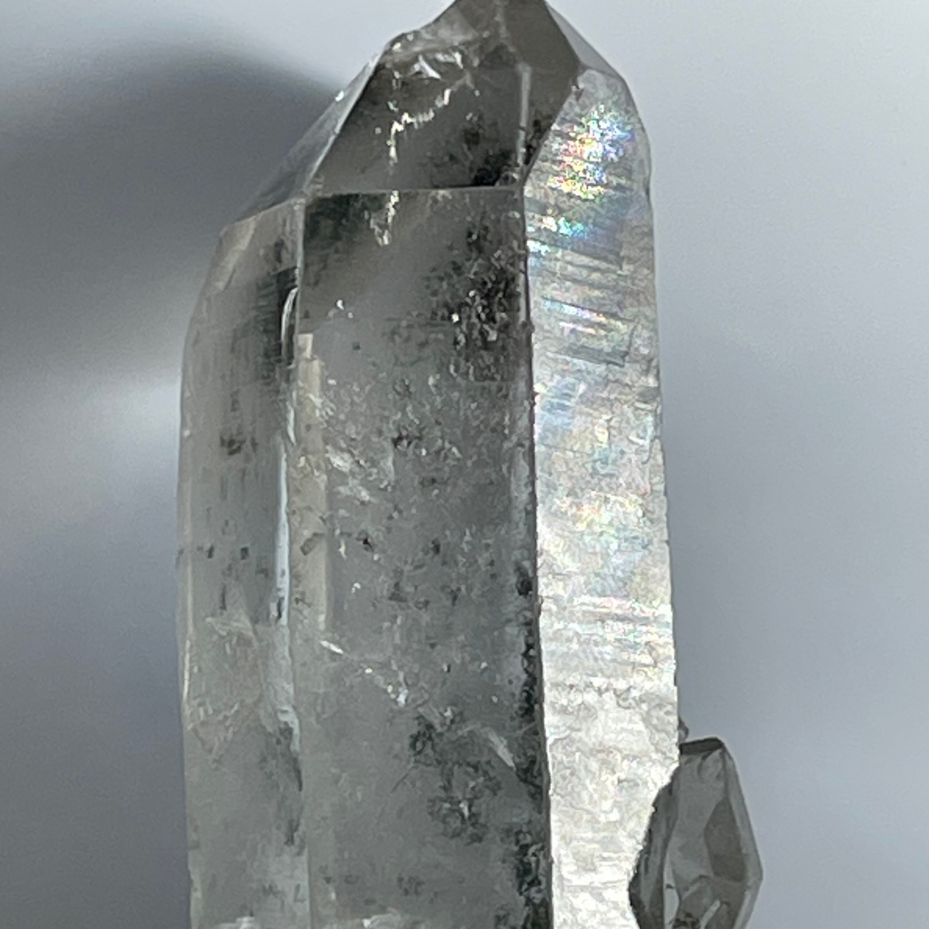 柱面に寄り添って小さな水晶が成長していますが、タイムリンクと綺麗なレインボーが現れています。