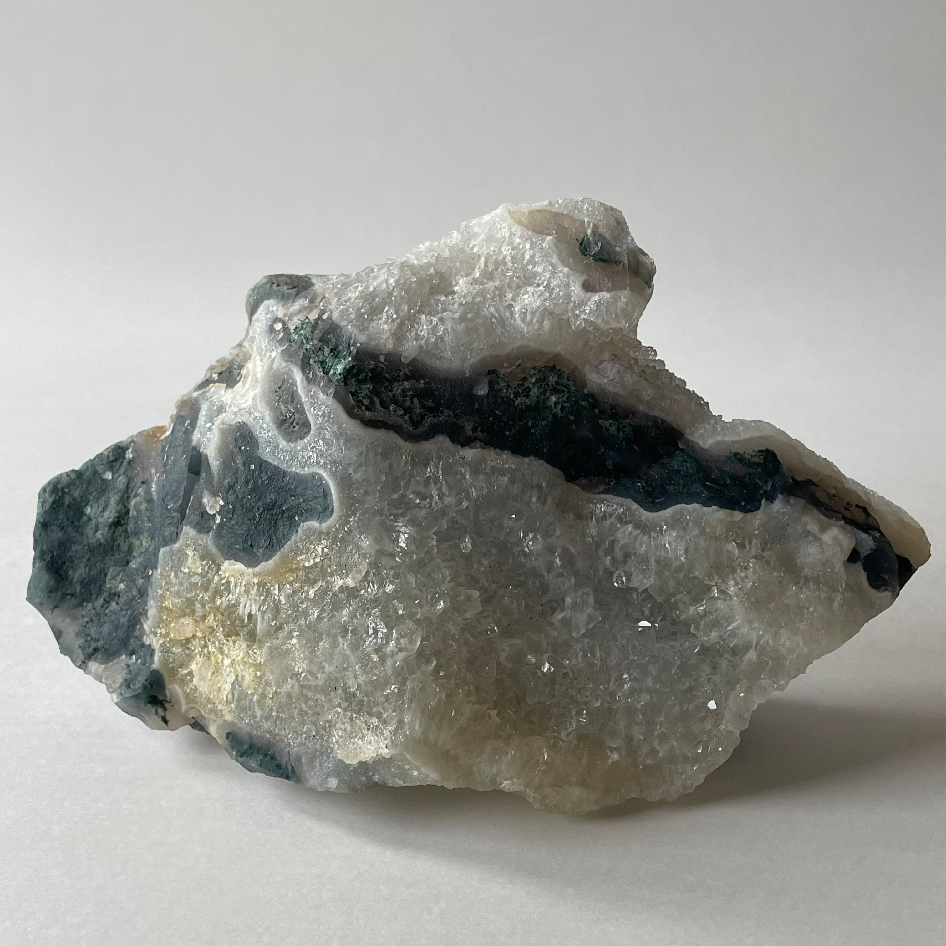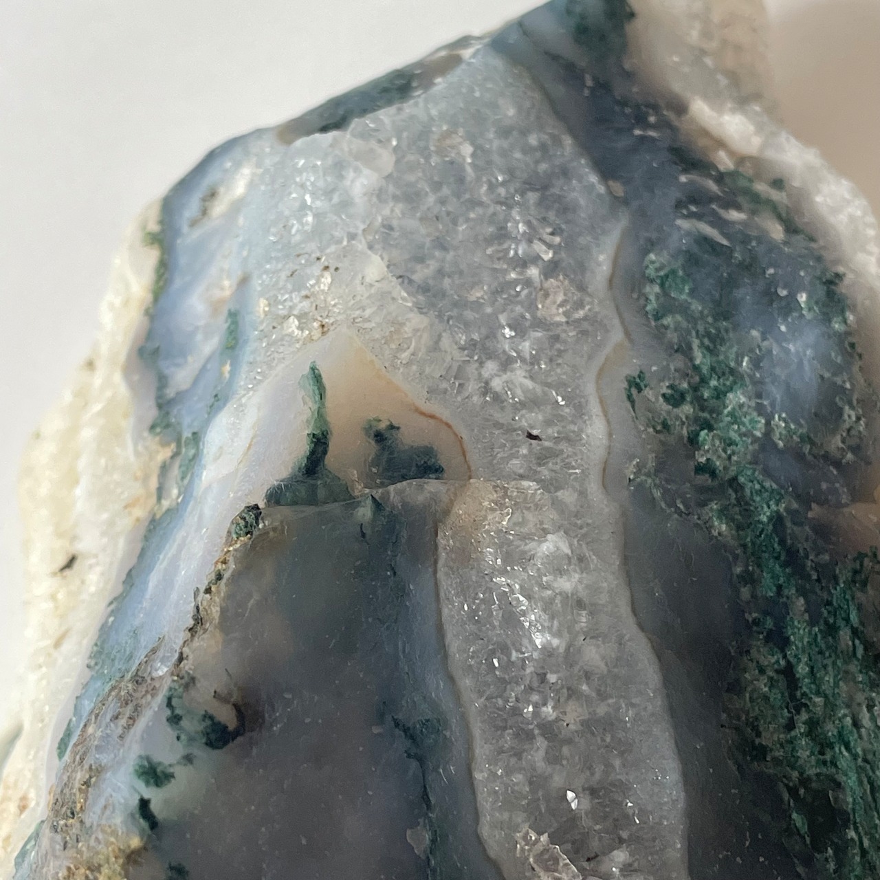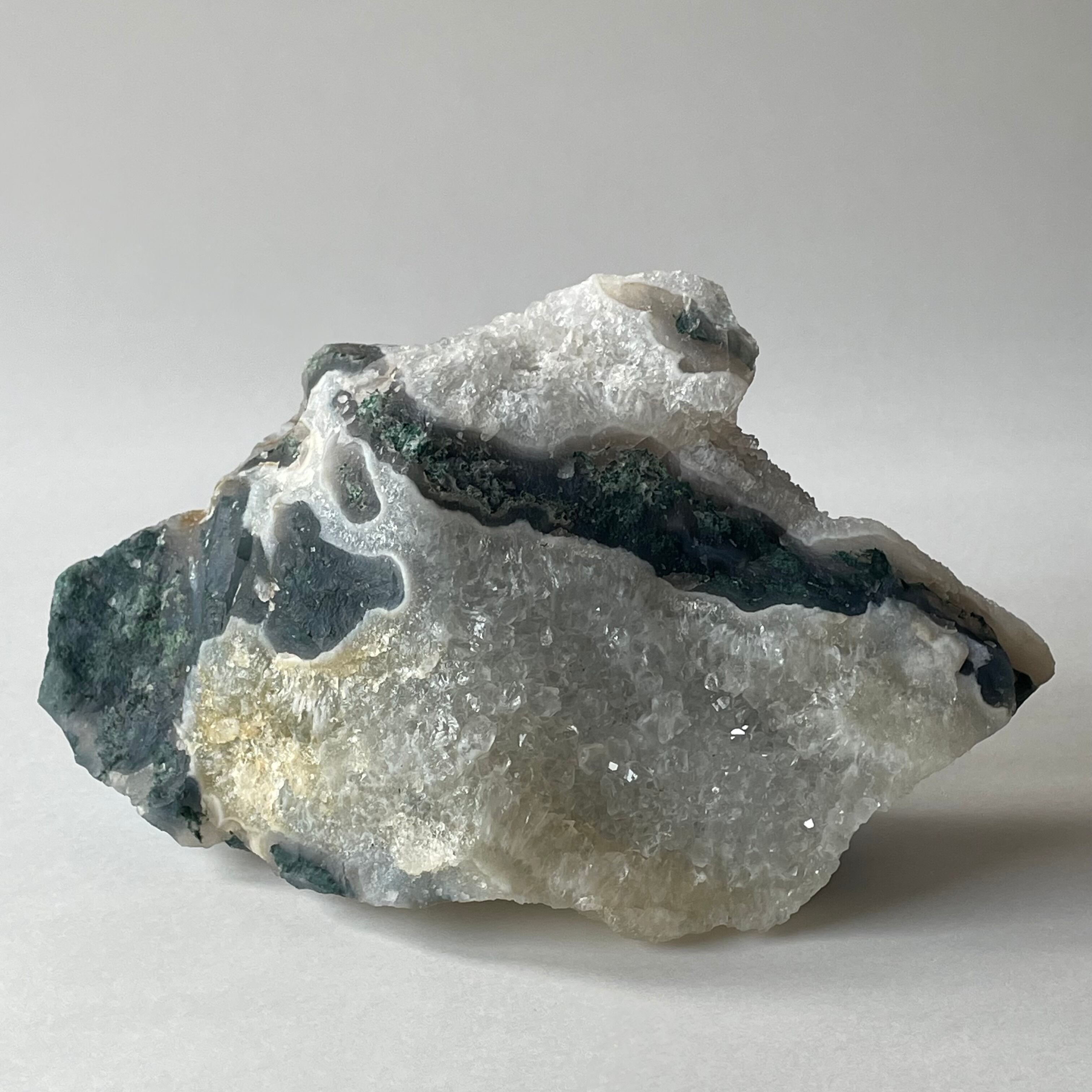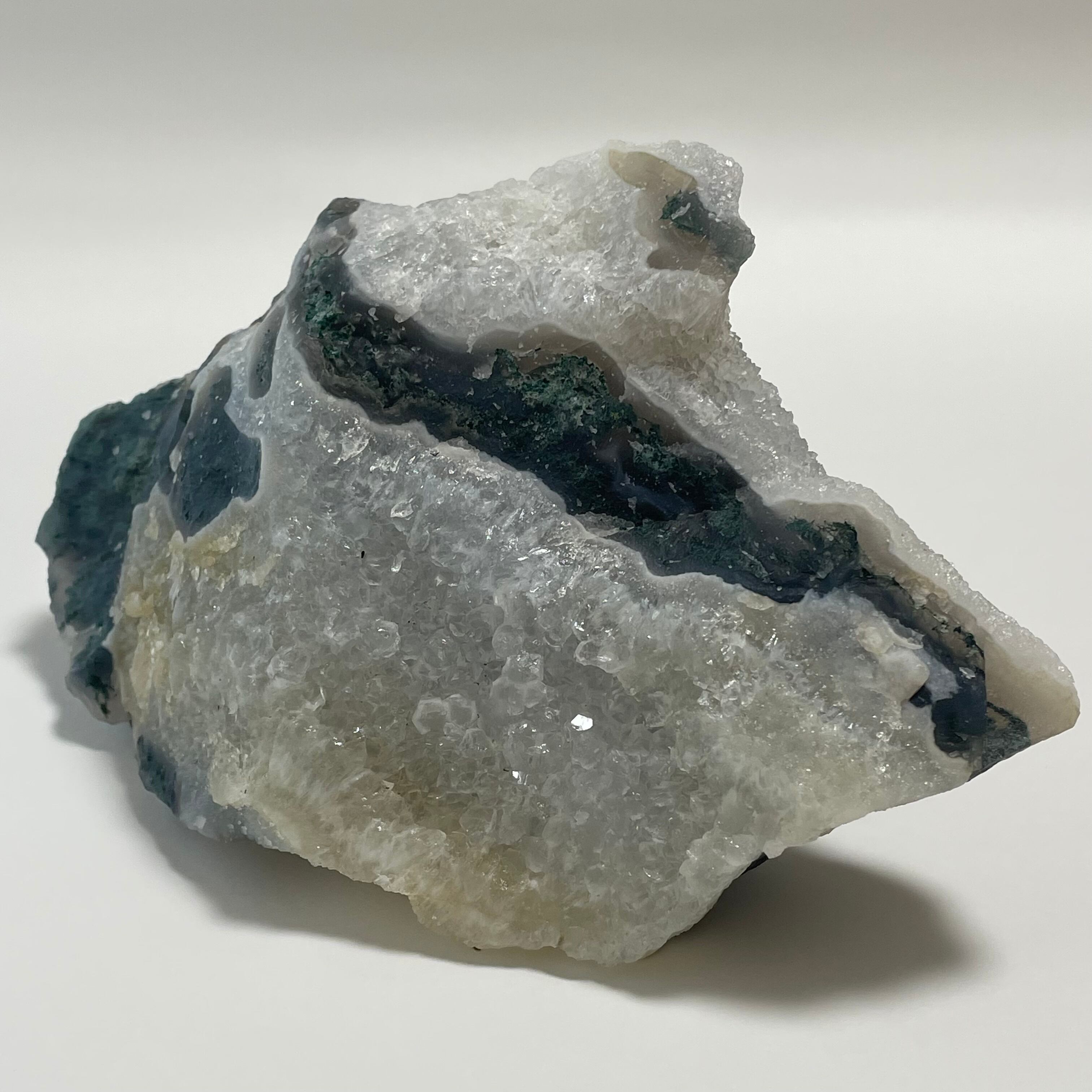 清涼感のある青緑のモスアゲートと、煌めくドゥルージークォーツが共生した見応えある美しい原石です。