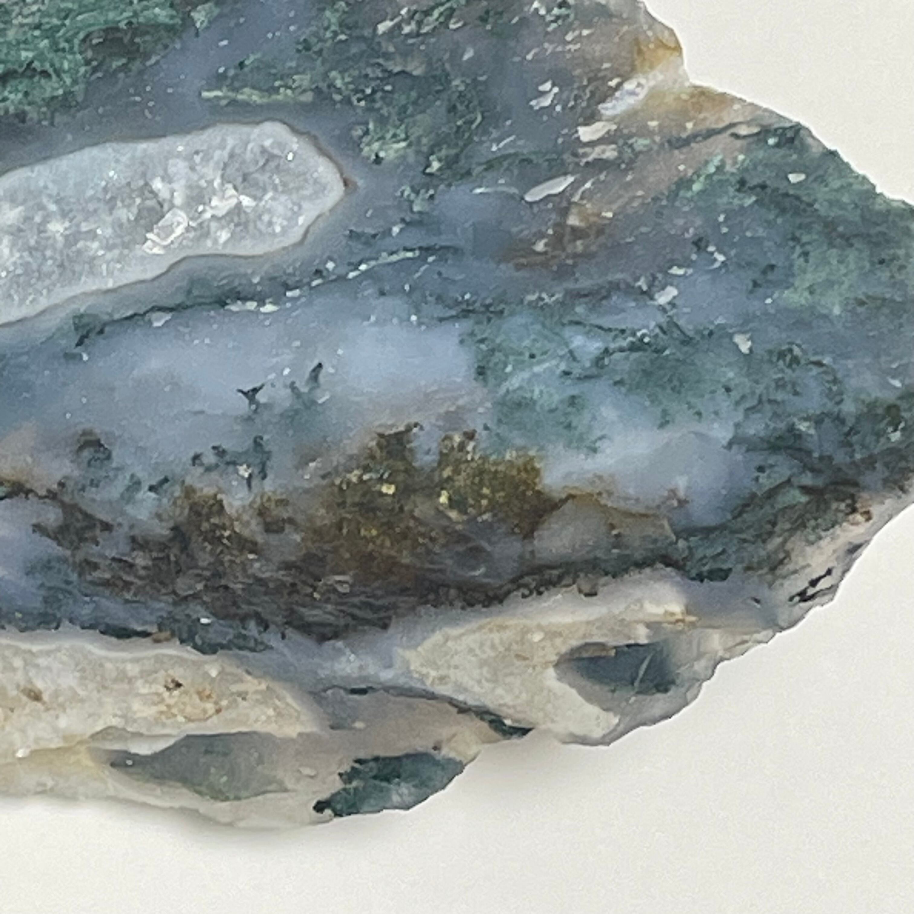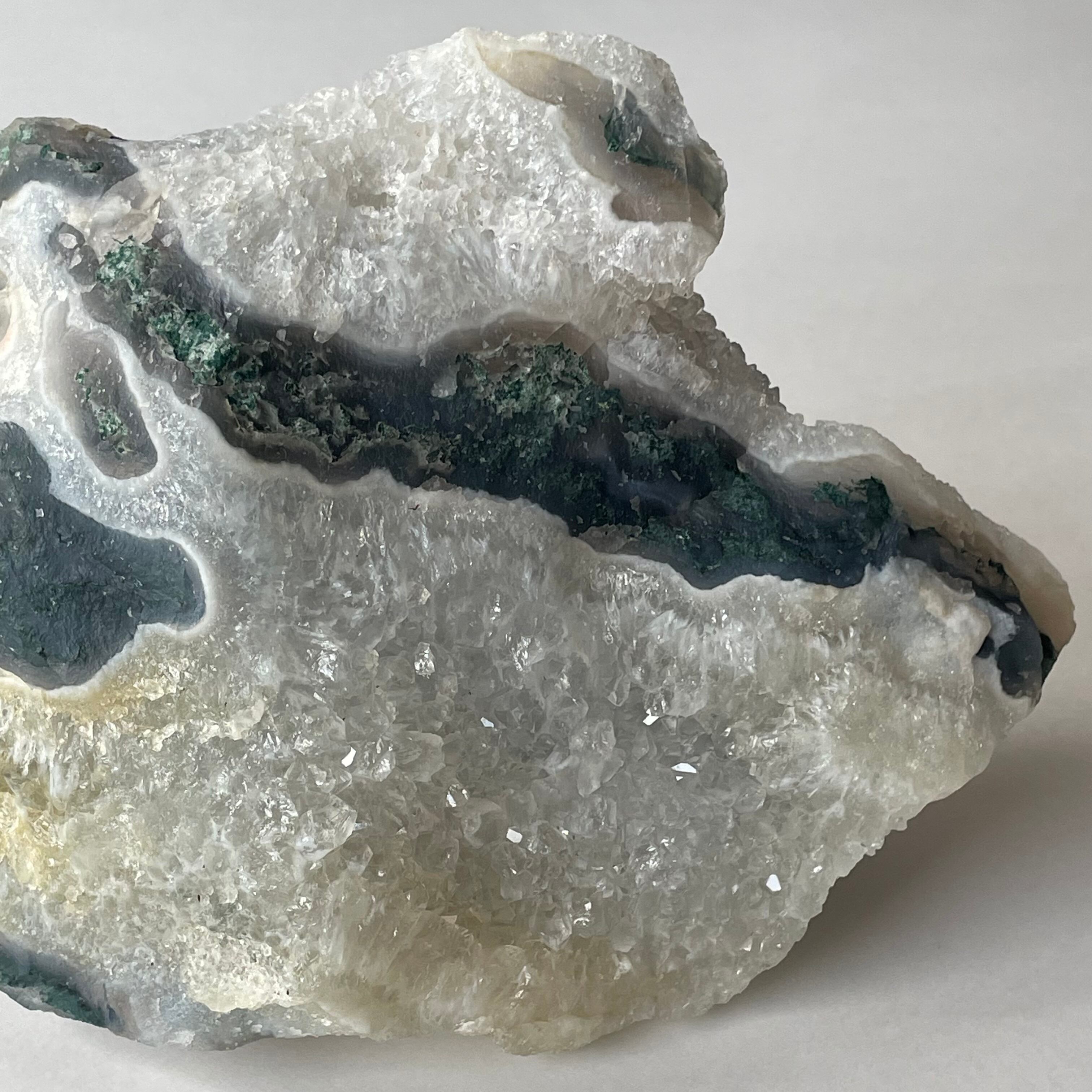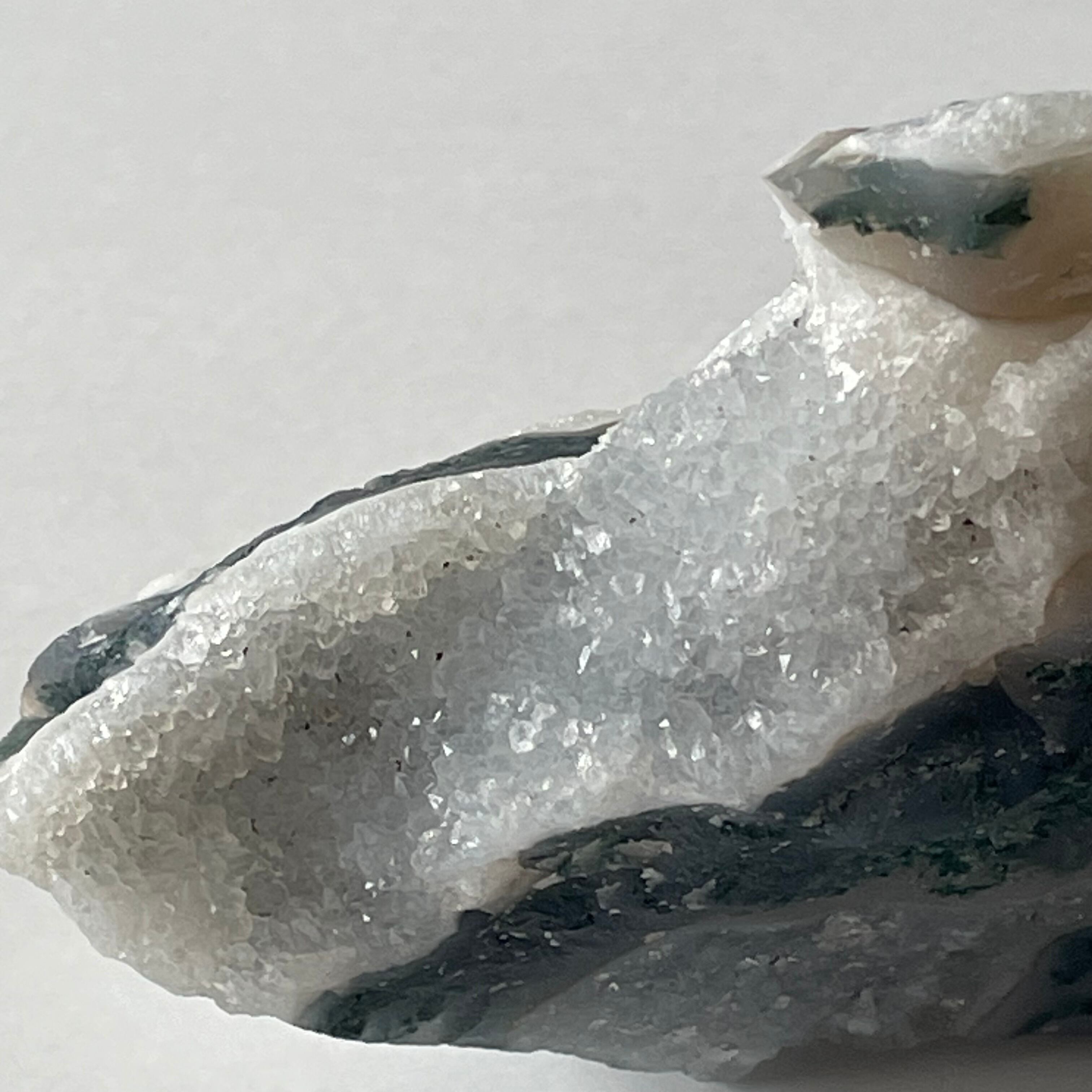 清涼感のある青緑のモスアゲートと、煌めくドゥルージークォーツが共生した見応えある美しい原石です。