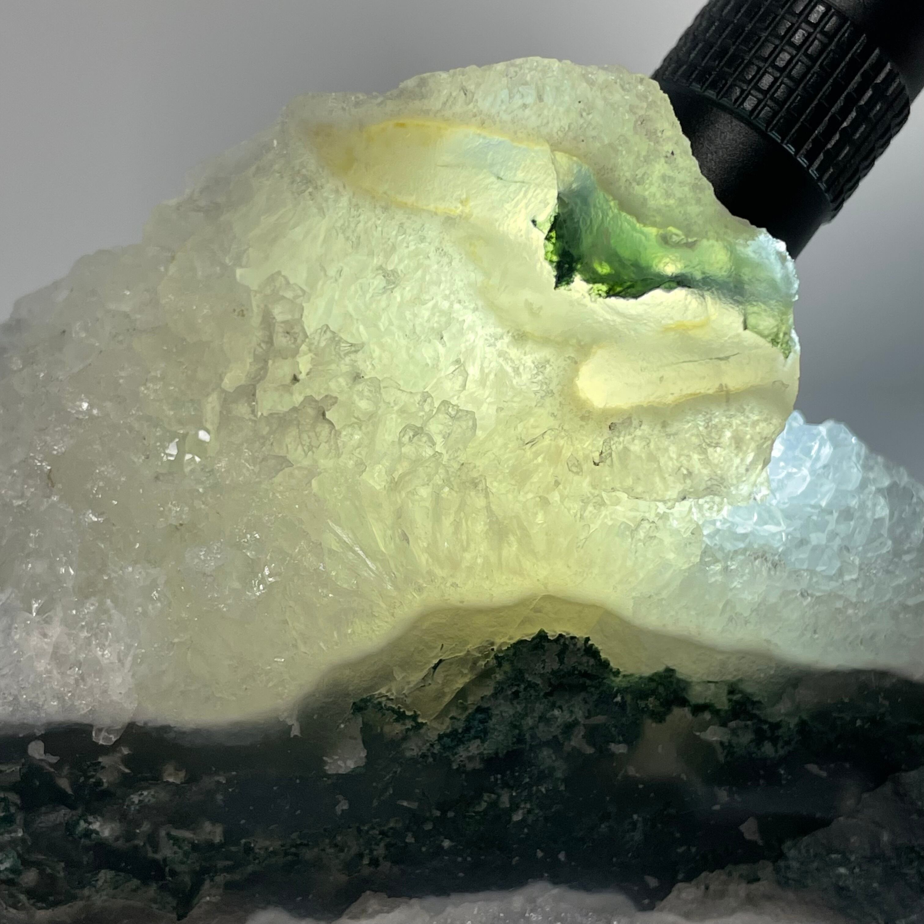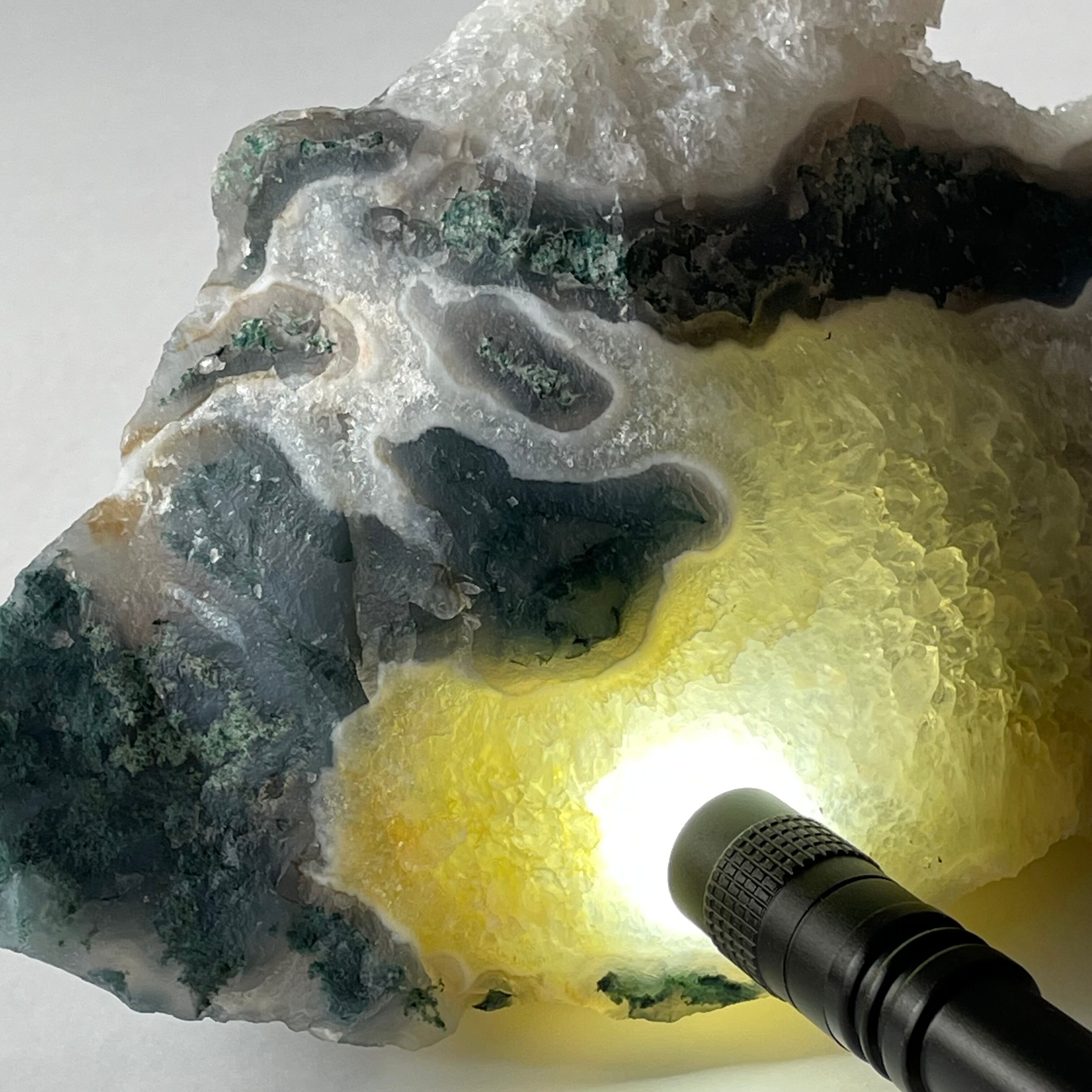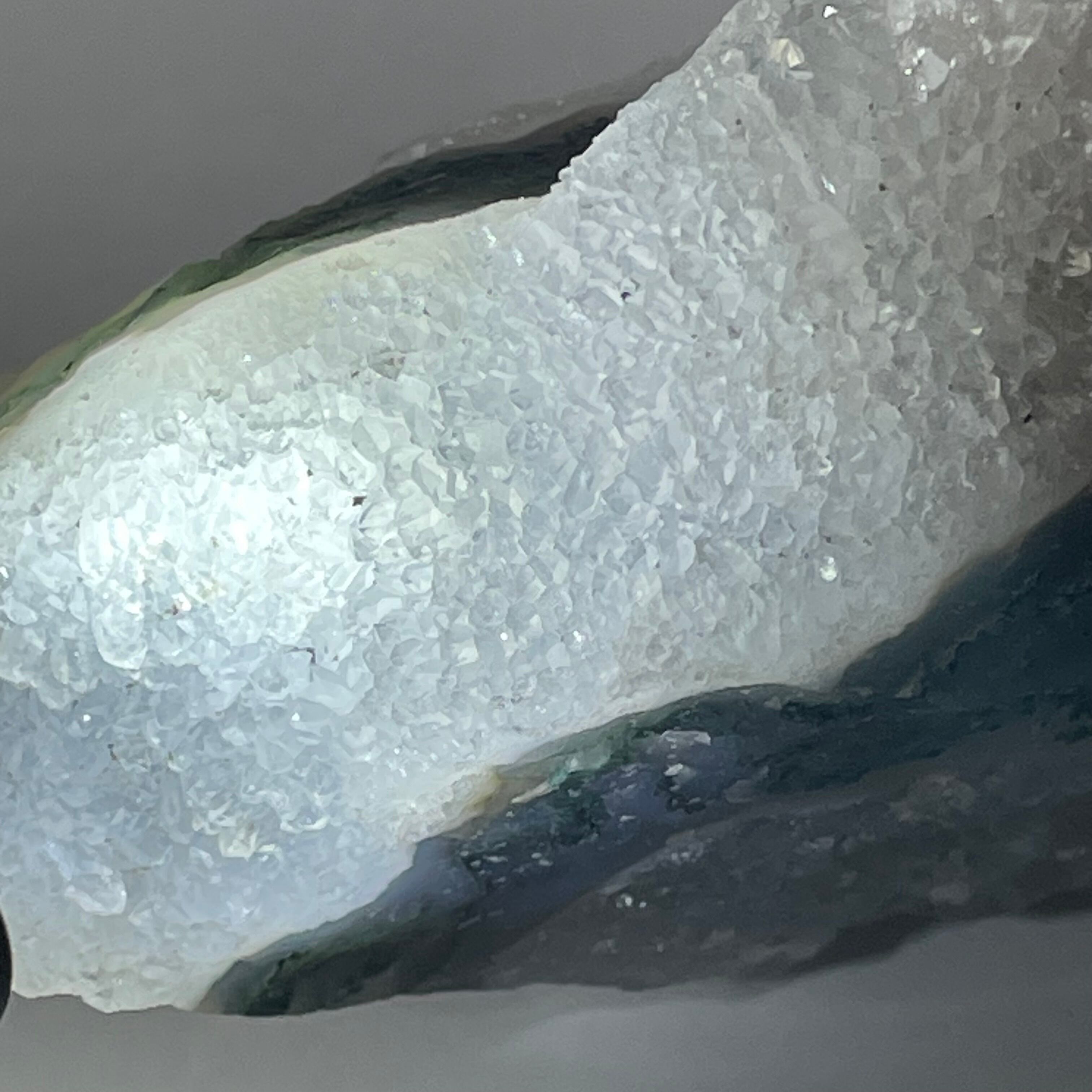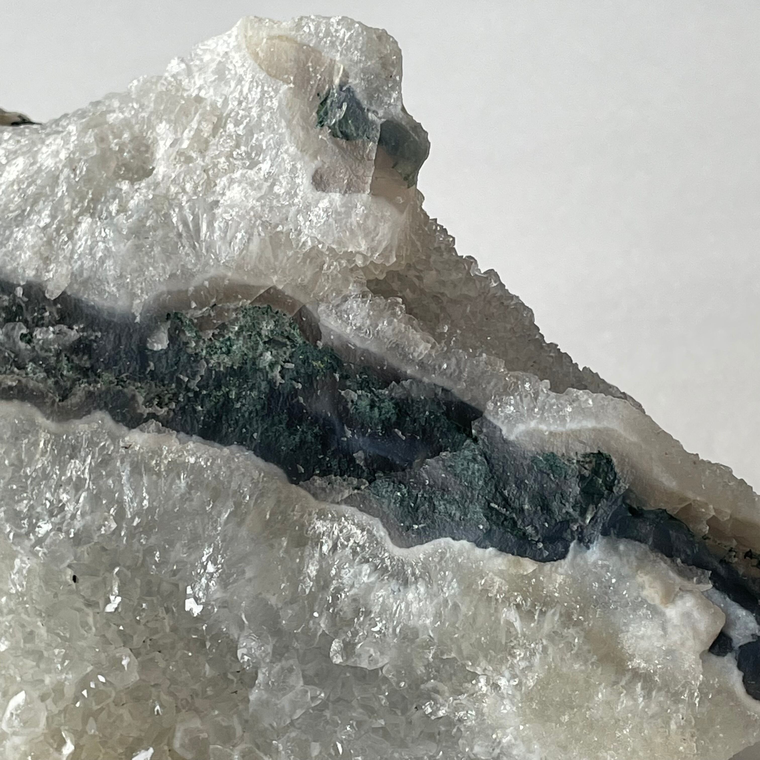 清涼感のある青緑のモスアゲートと、煌めくドゥルージークォーツが共生した見応えある美しい原石です。