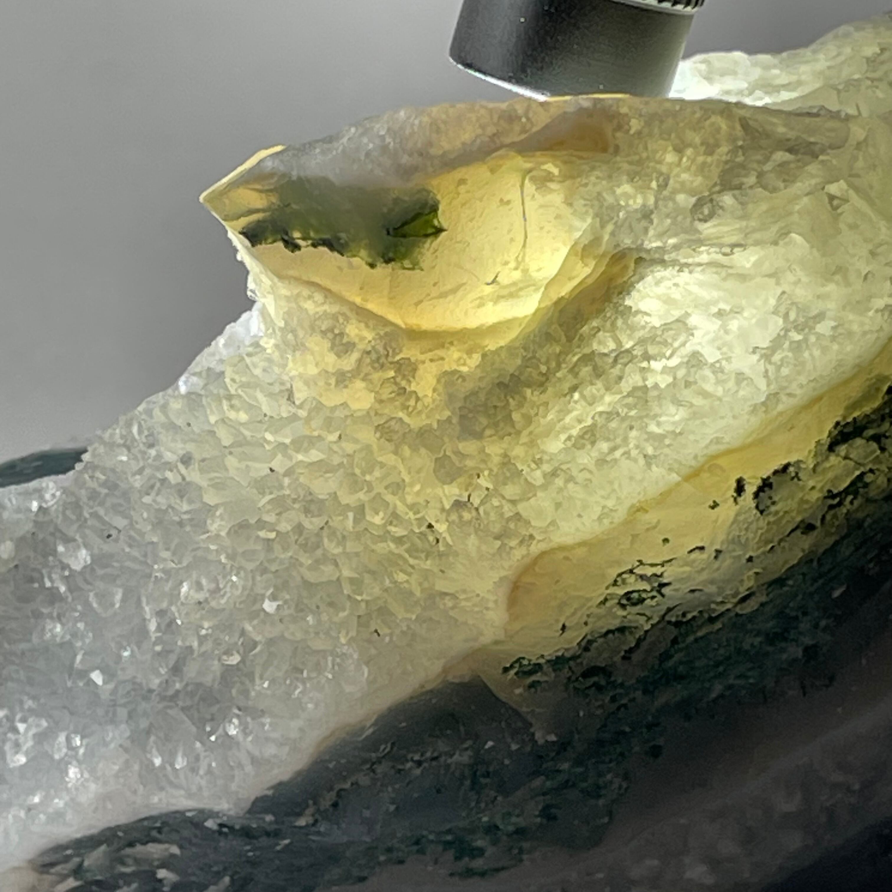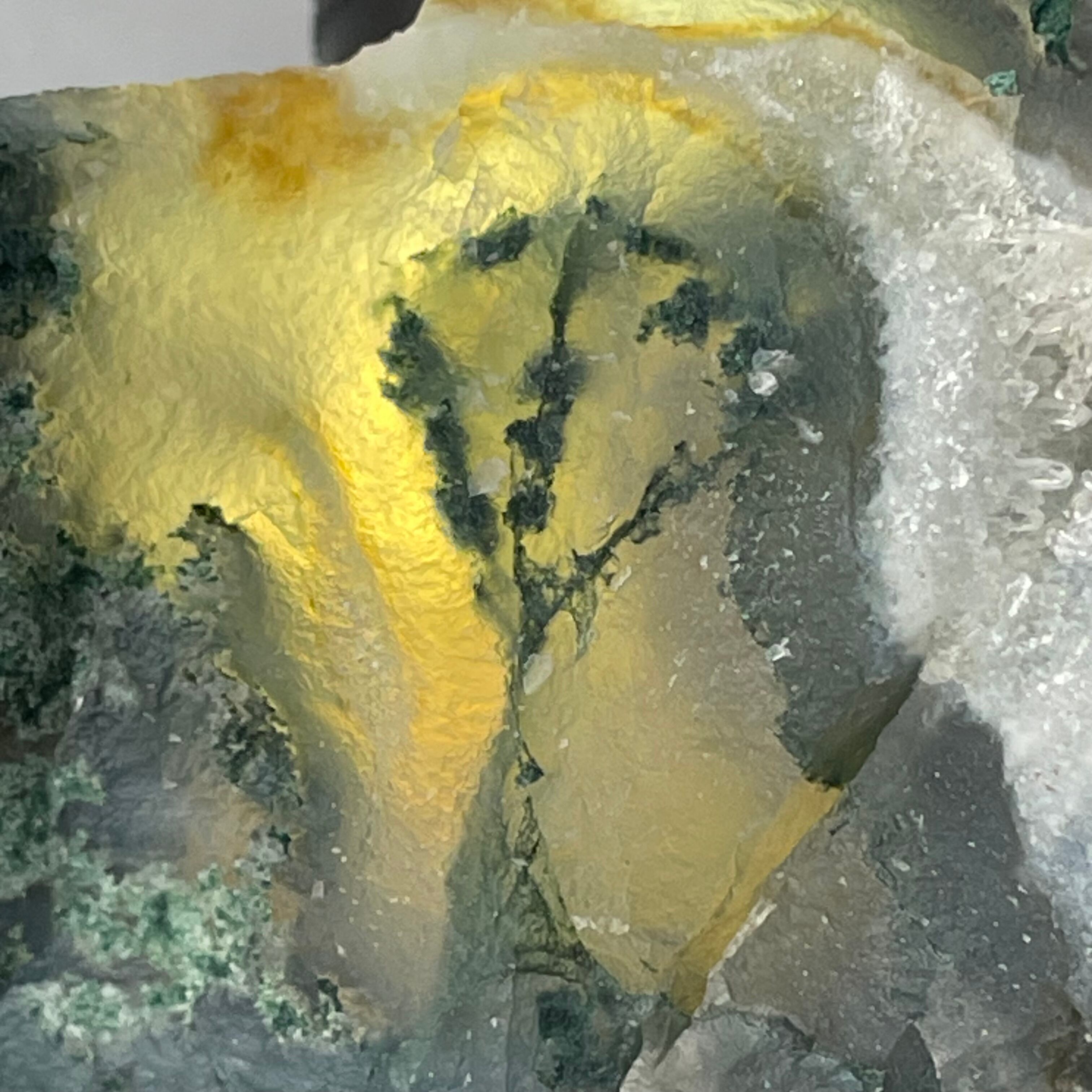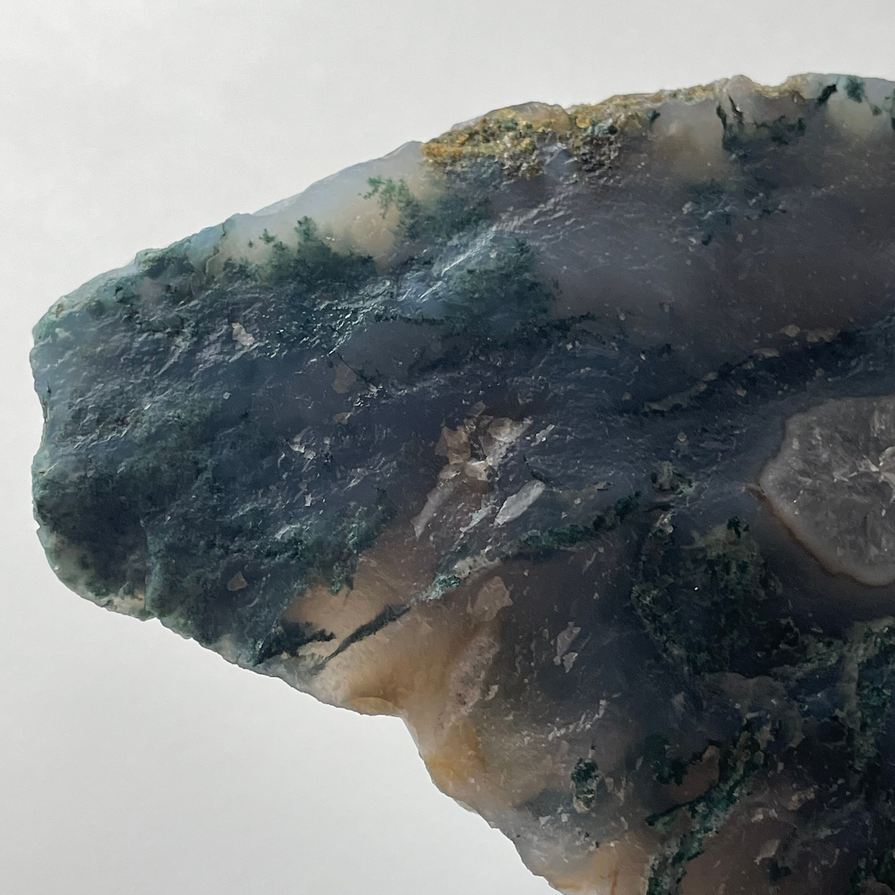 モスとは苔の意味を持ち、クローライトや角閃石、鉄やマンガンなどの酸化鉱物によるものが内包されて植物を閉じ込めたような外観を作り出しています。