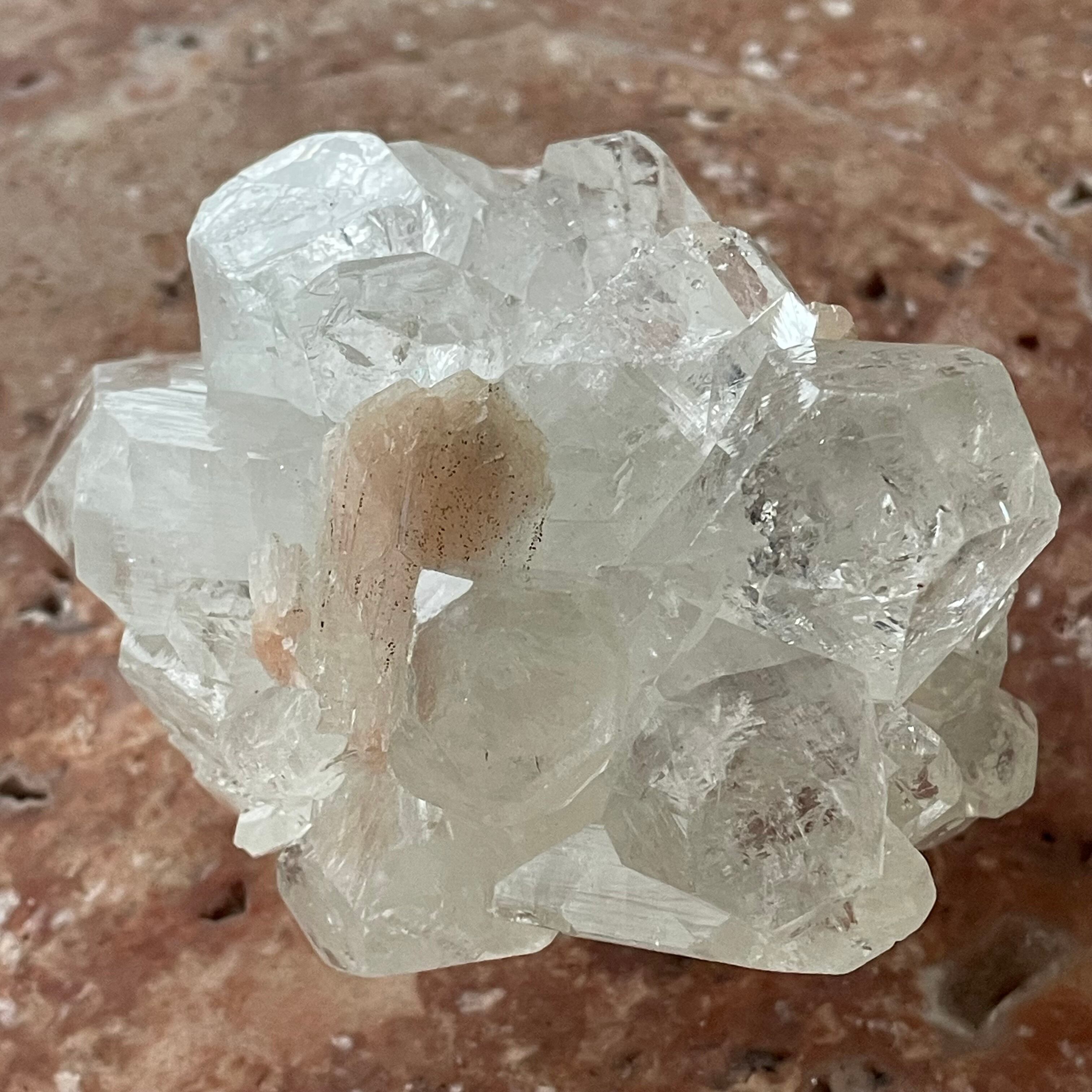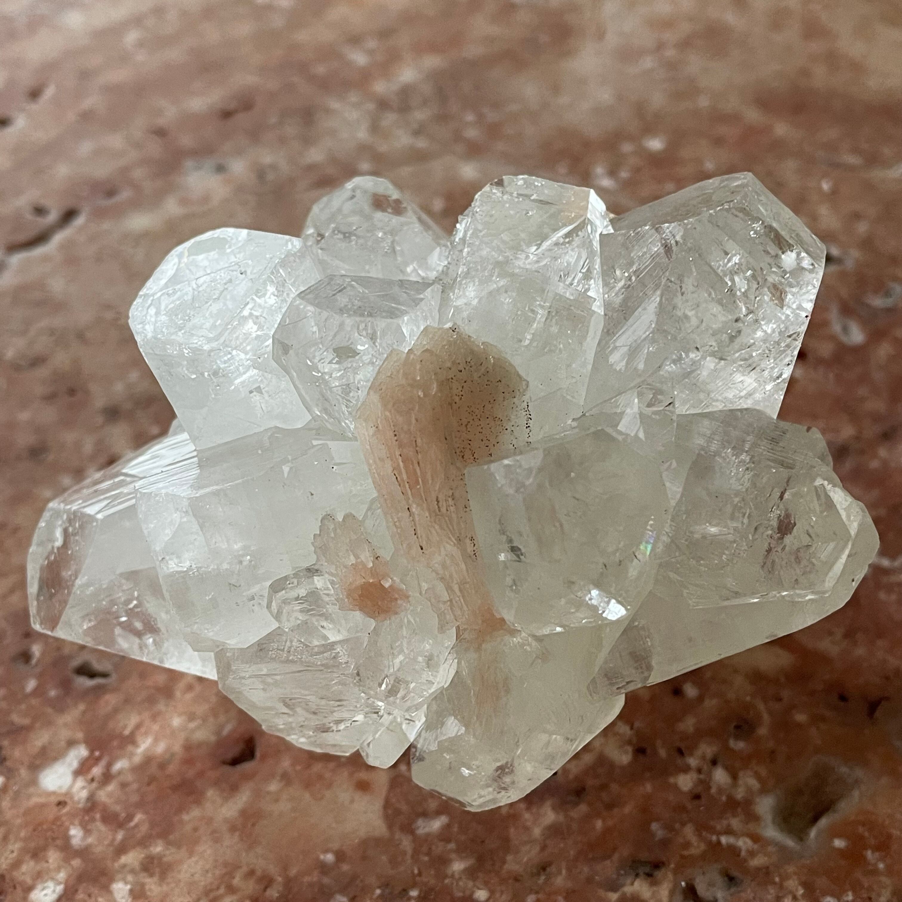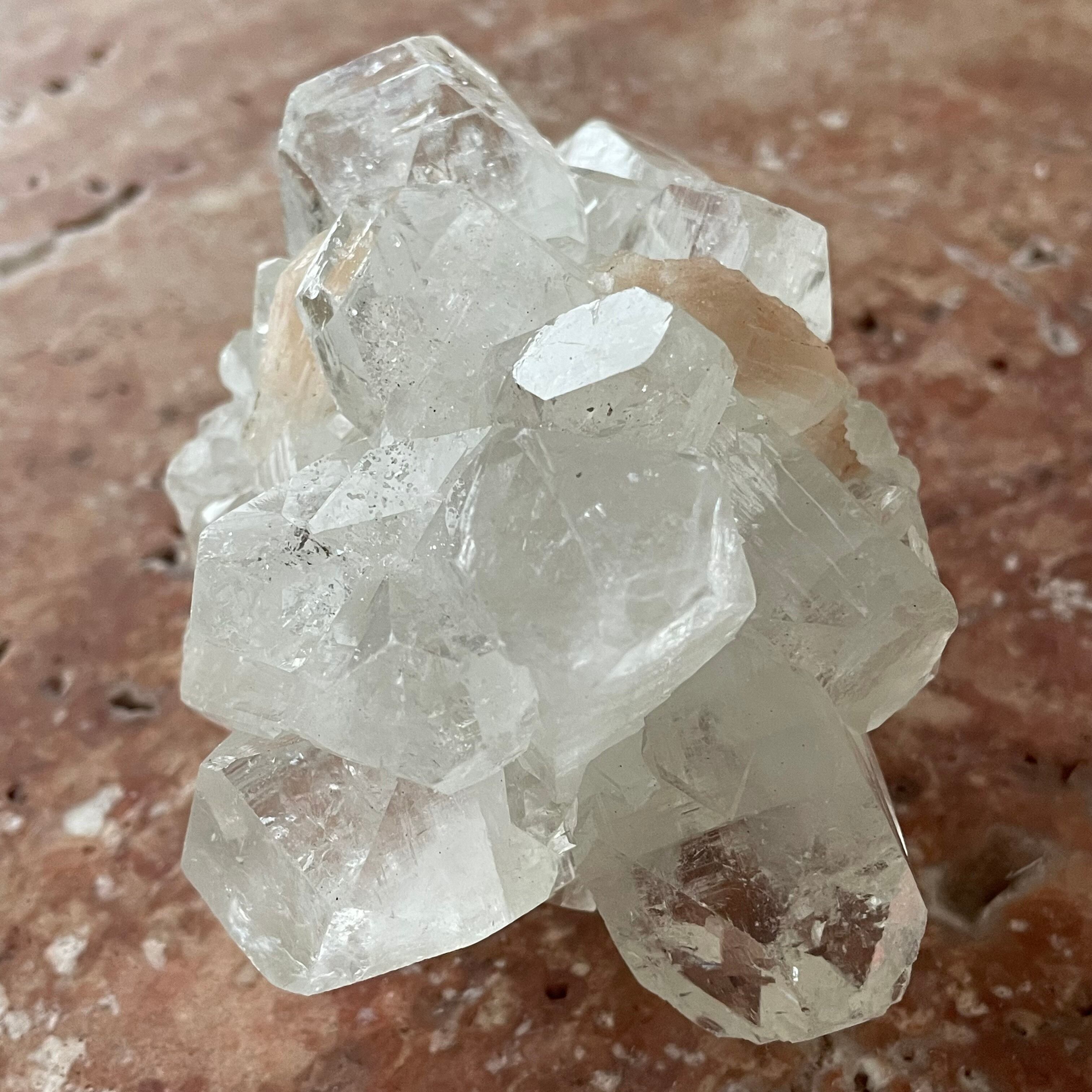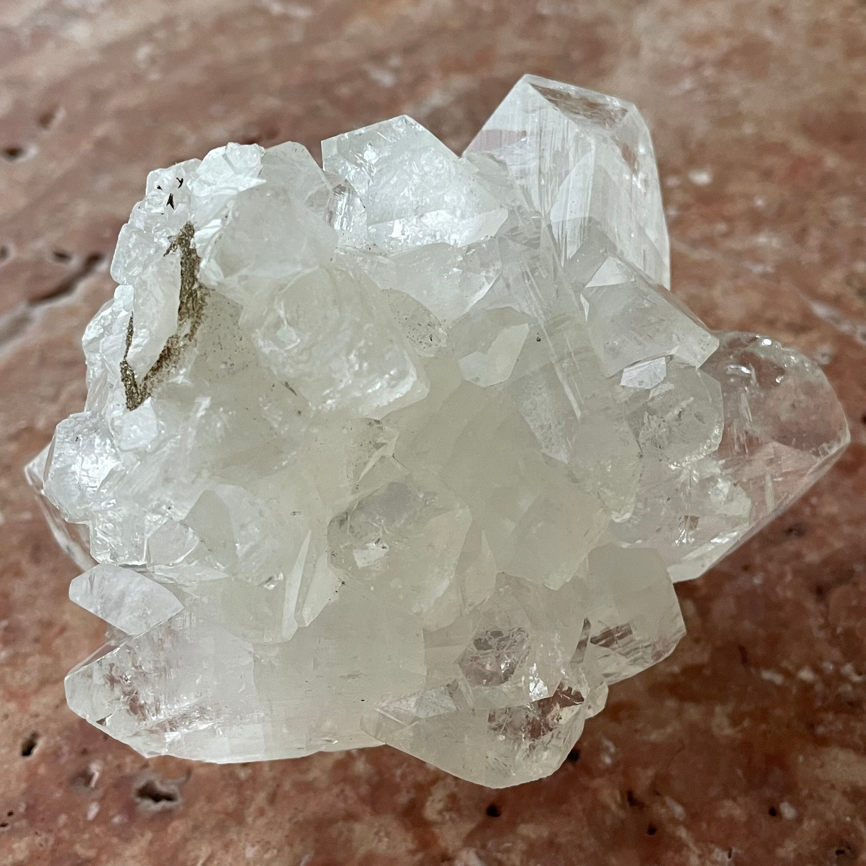 アポフィライトは世界各地で産出される石で、一見水晶に似ていますが輪切りにすると水晶は六角形であるのに対し、アポフィライトは四角形をしています。