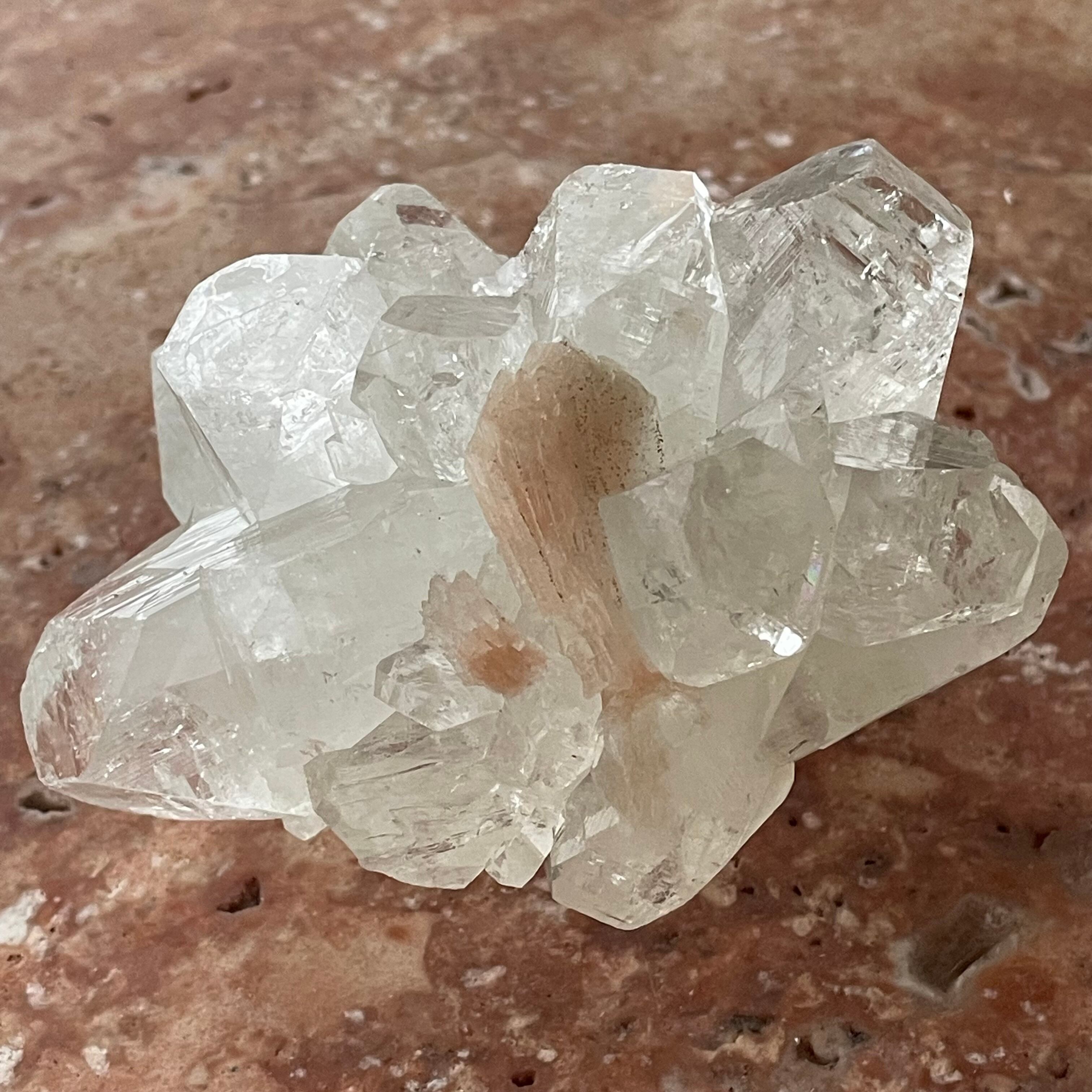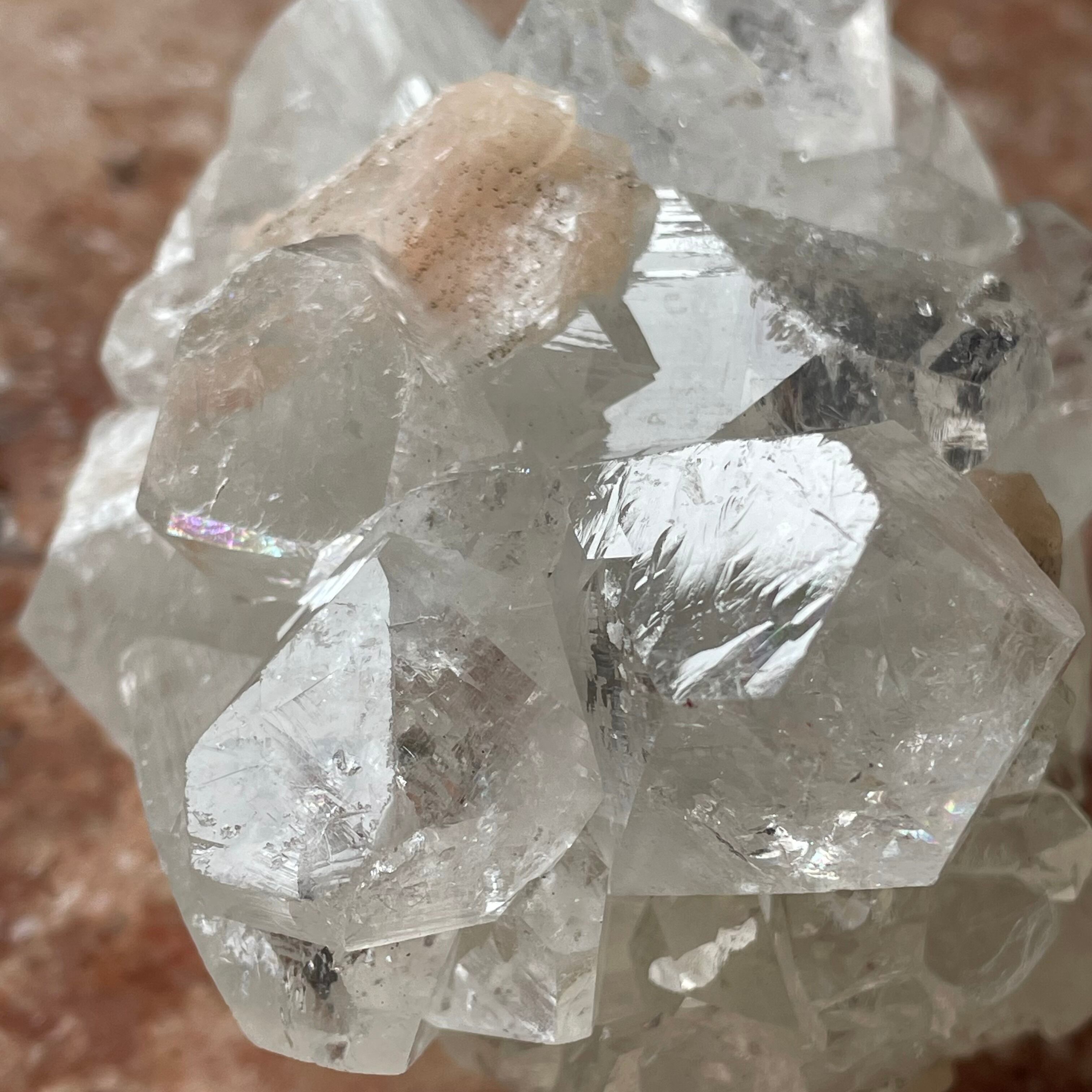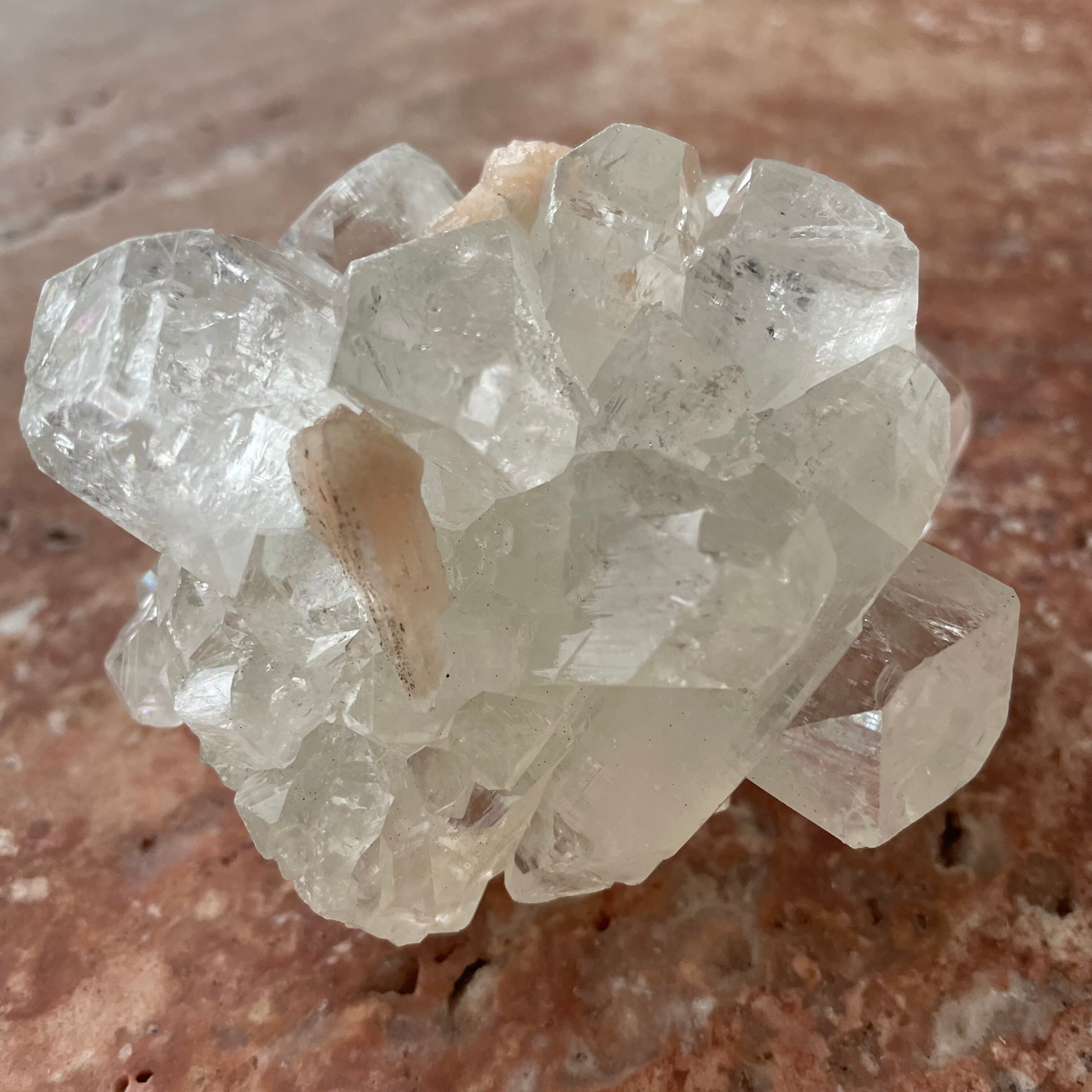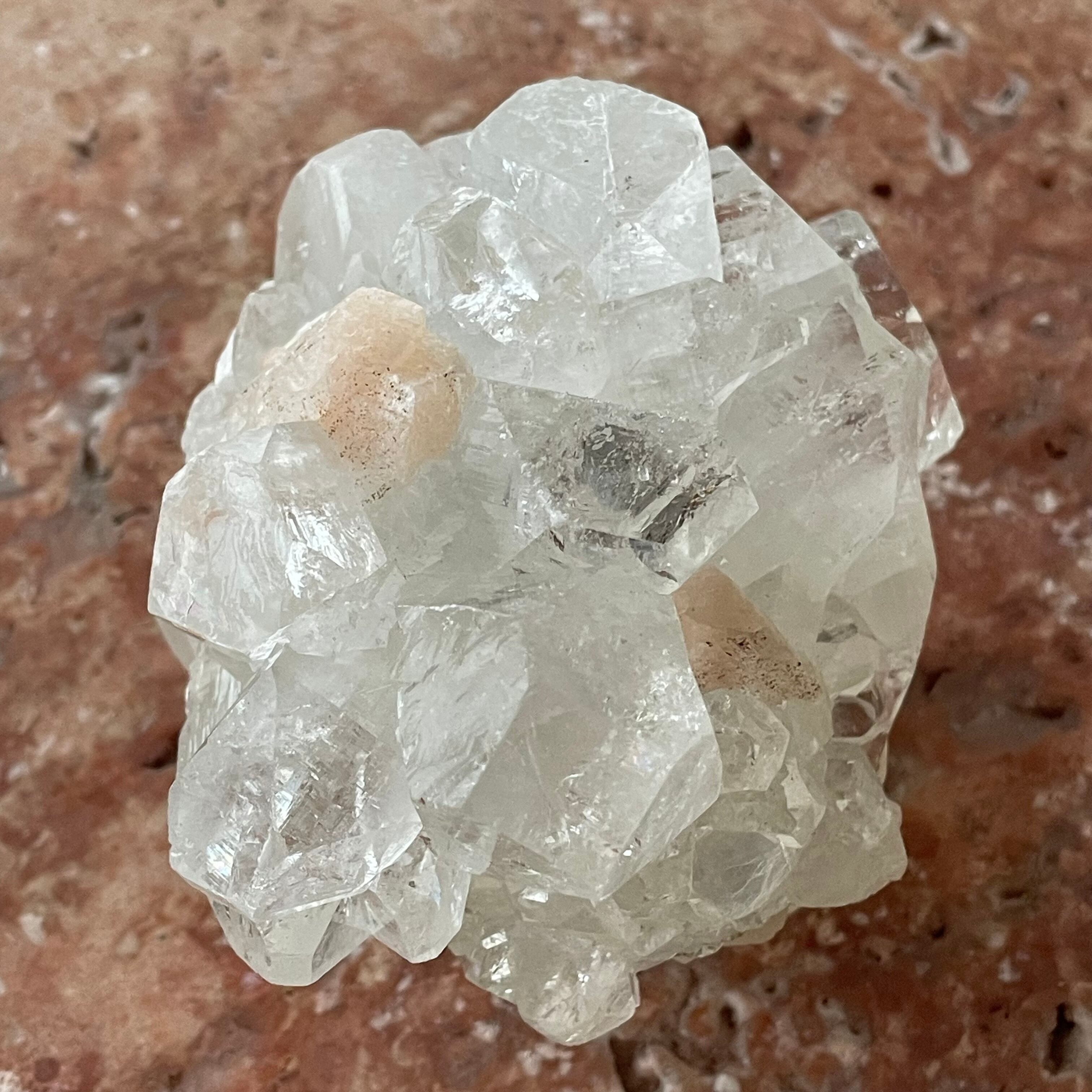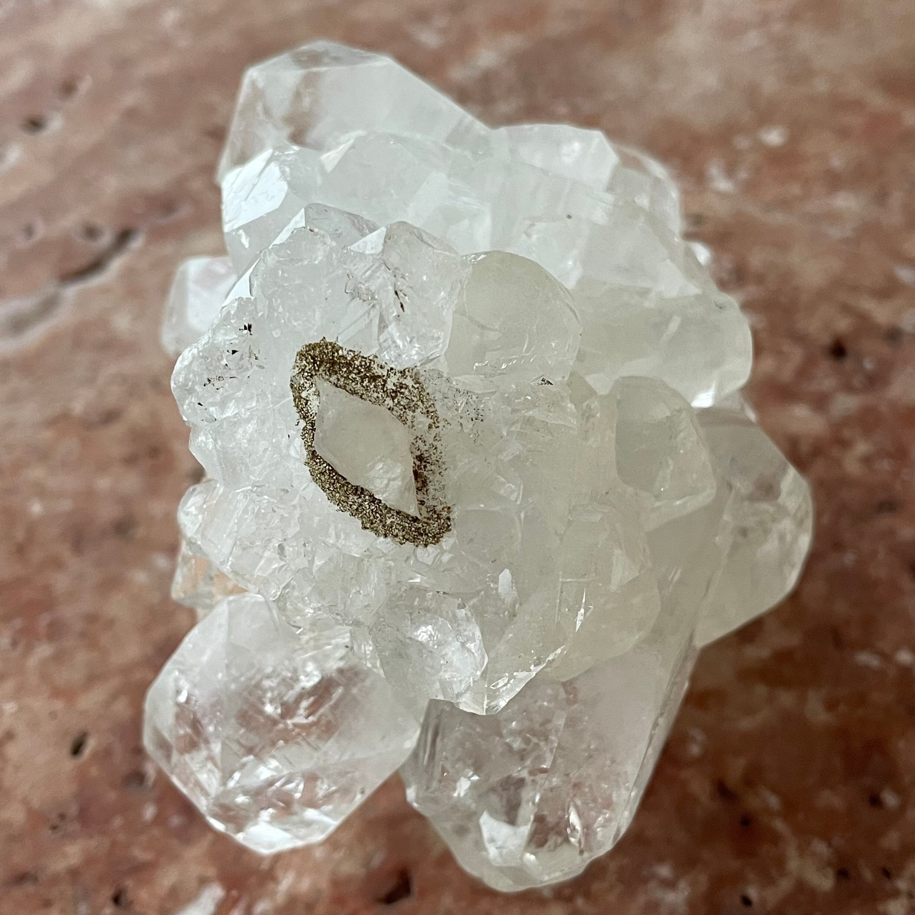 アポフィライトは世界各地で産出される石で、一見水晶に似ていますが輪切りにすると水晶は六角形であるのに対し、アポフィライトは四角形をしています。