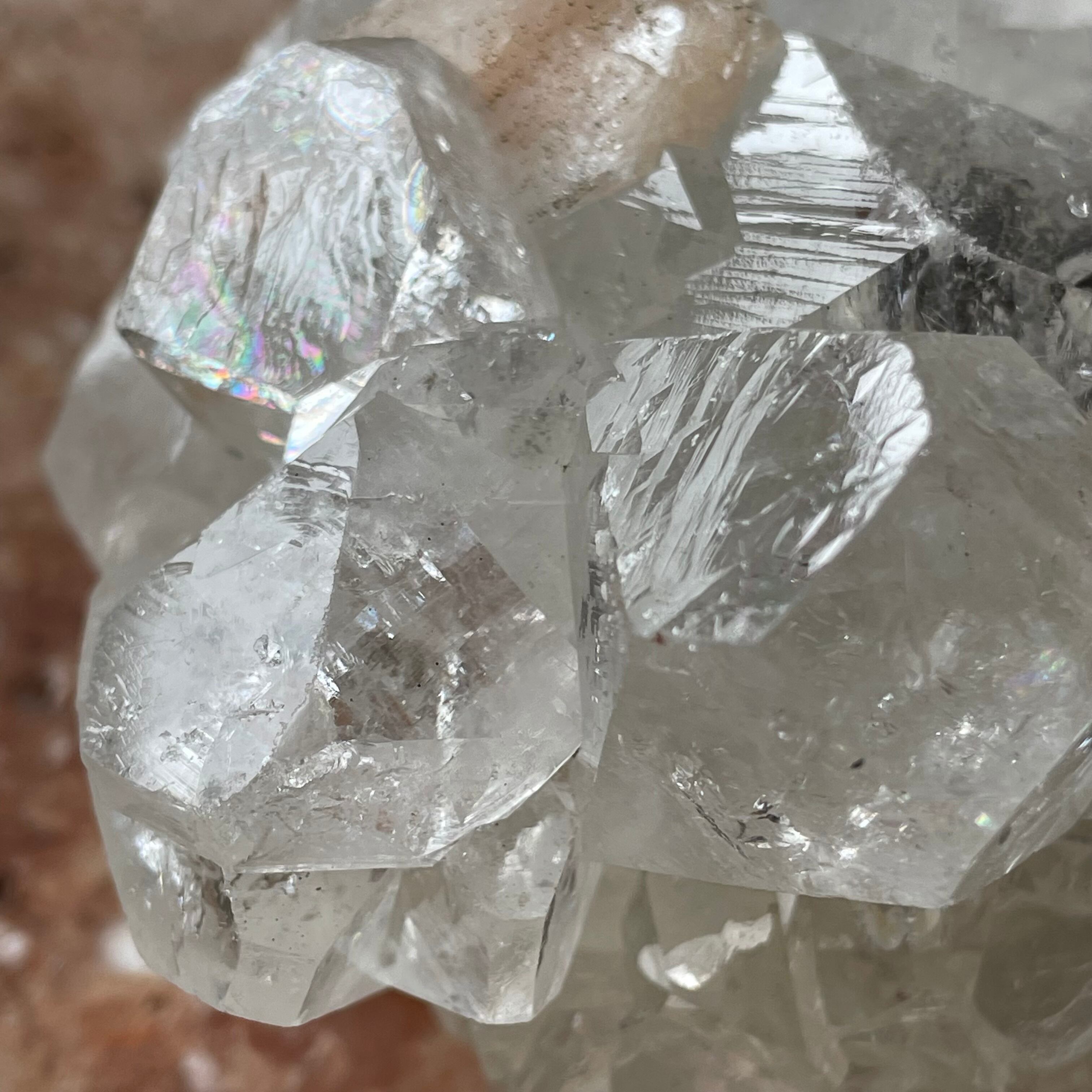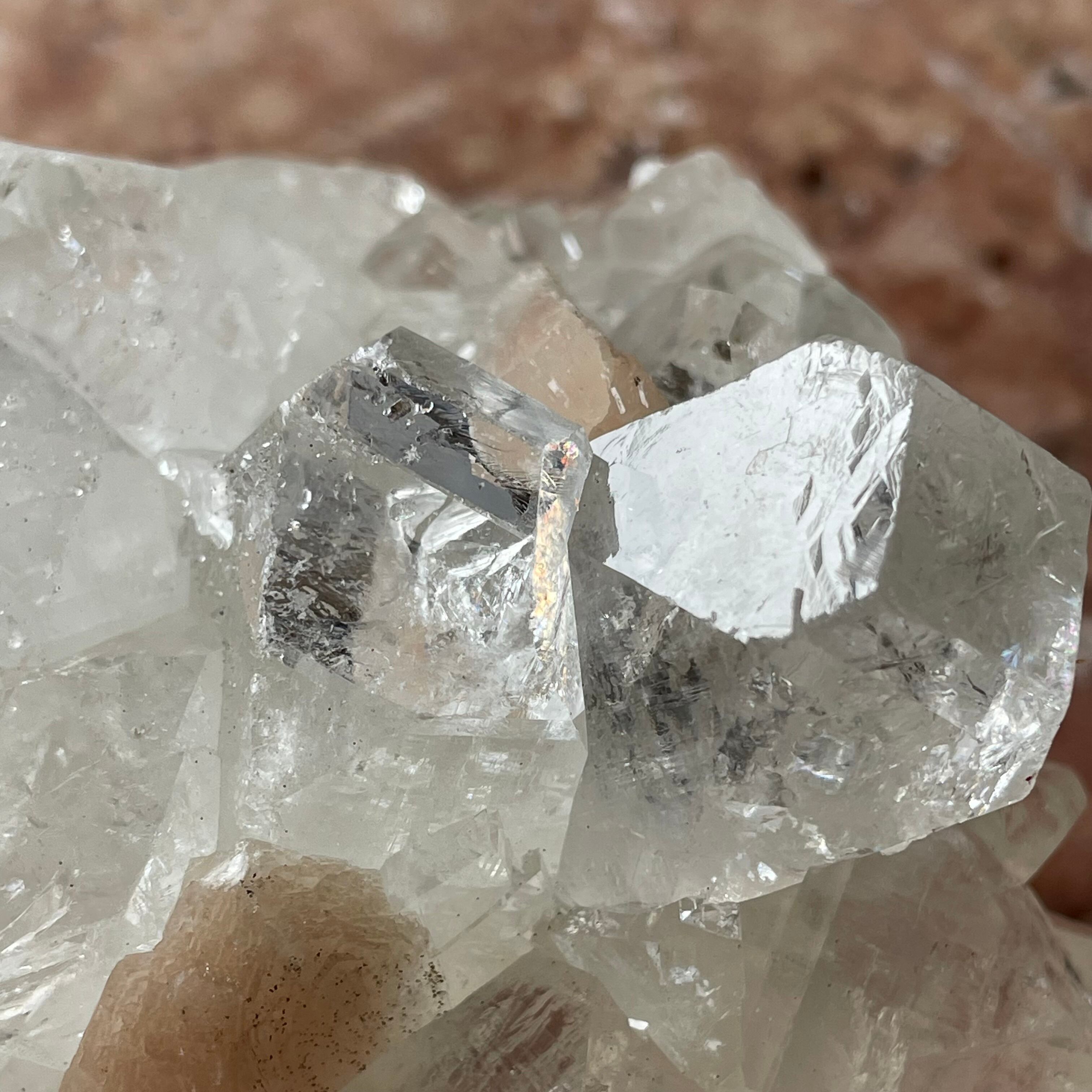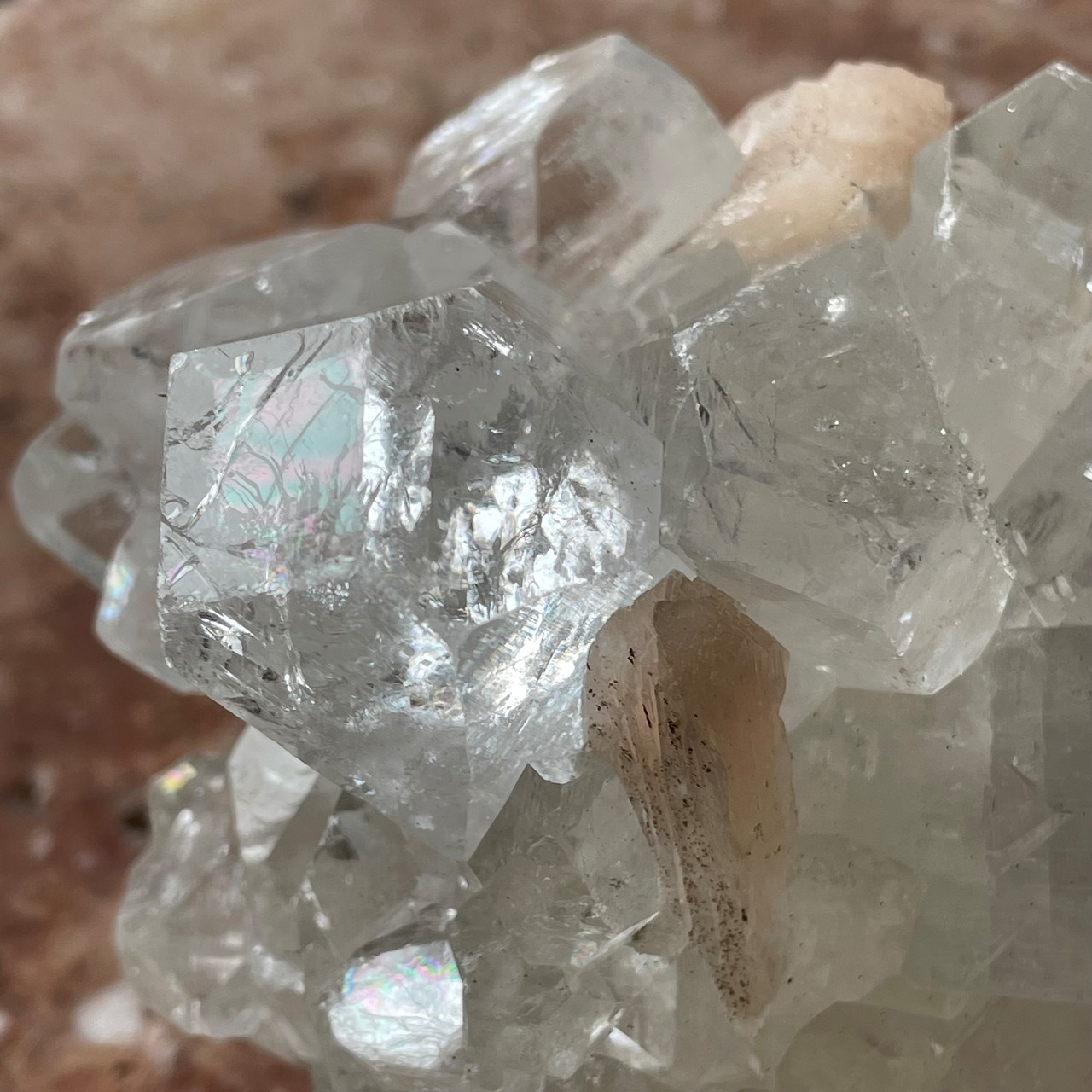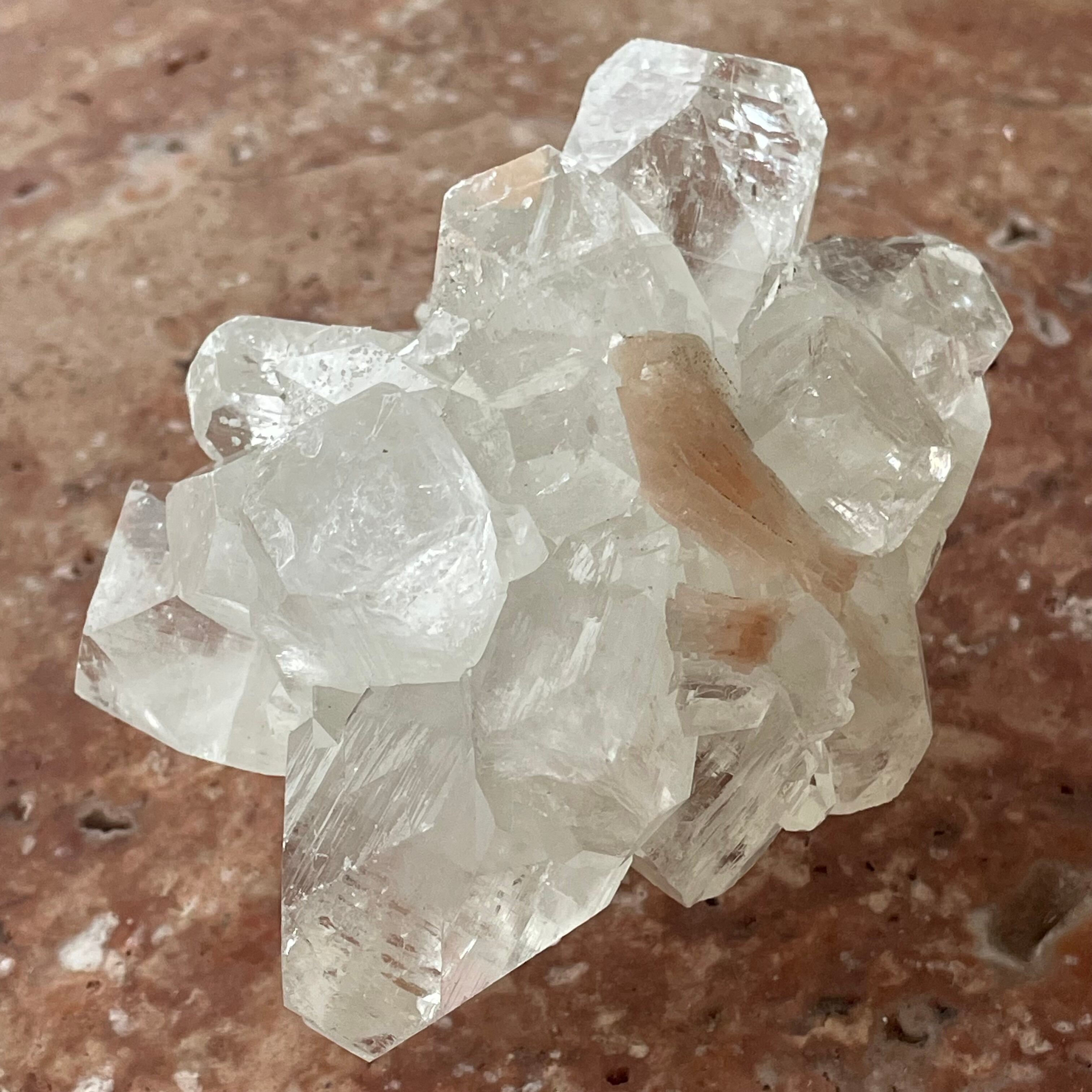 アポフィライトは世界各地で産出される石で、一見水晶に似ていますが輪切りにすると水晶は六角形であるのに対し、アポフィライトは四角形をしています。