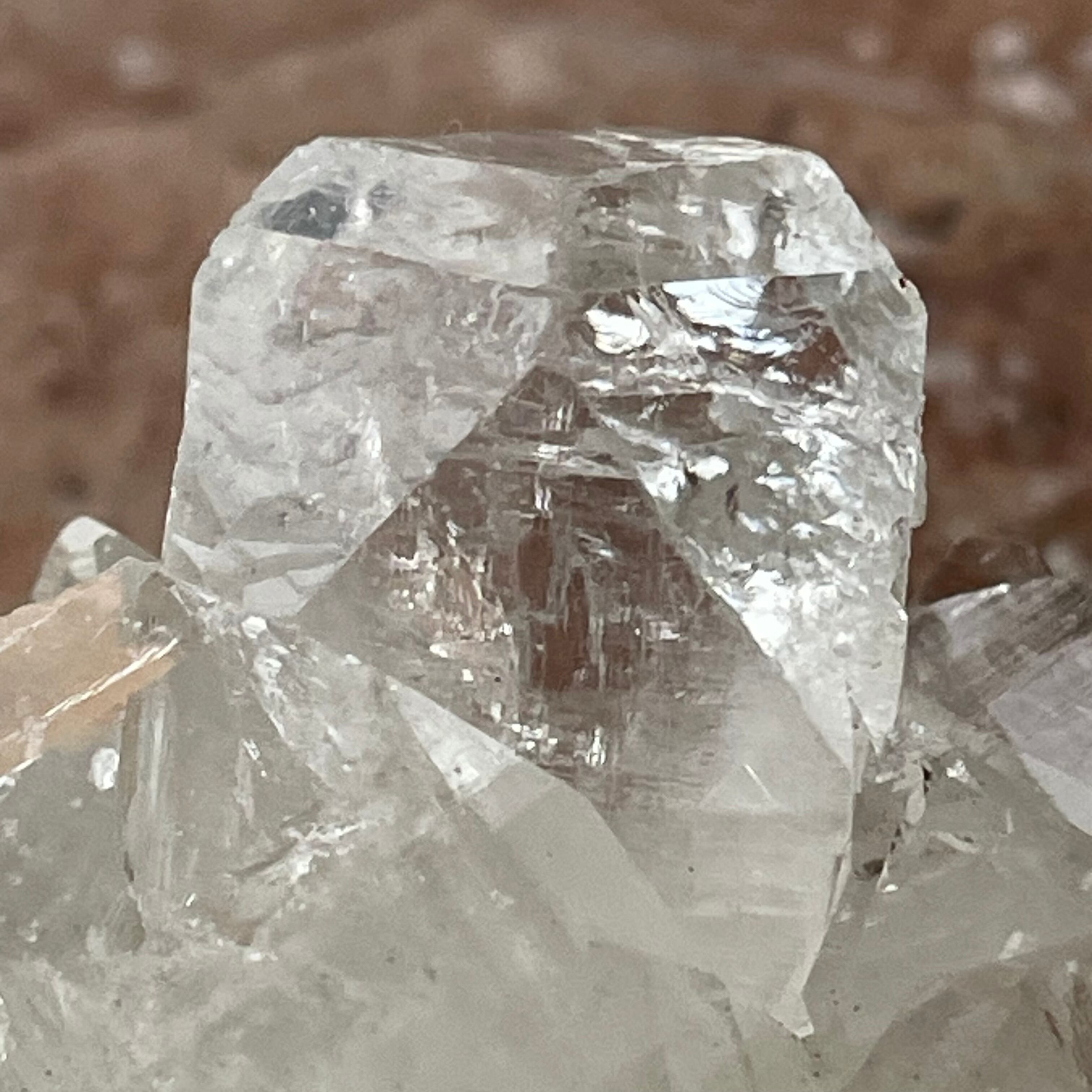 透き通るような透明感と鏡面のように輝きが強く、モコモコと丸味あるクラスターが魅力です。絹のような光沢のスティルバイトも共生しています。