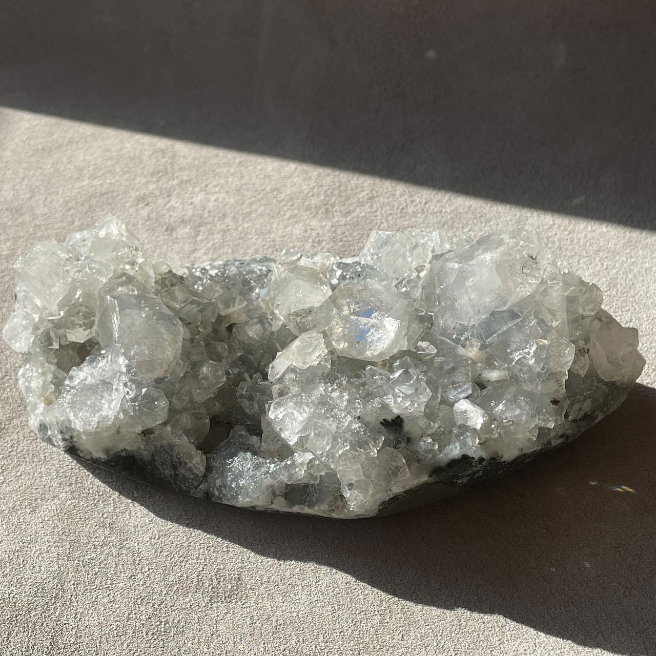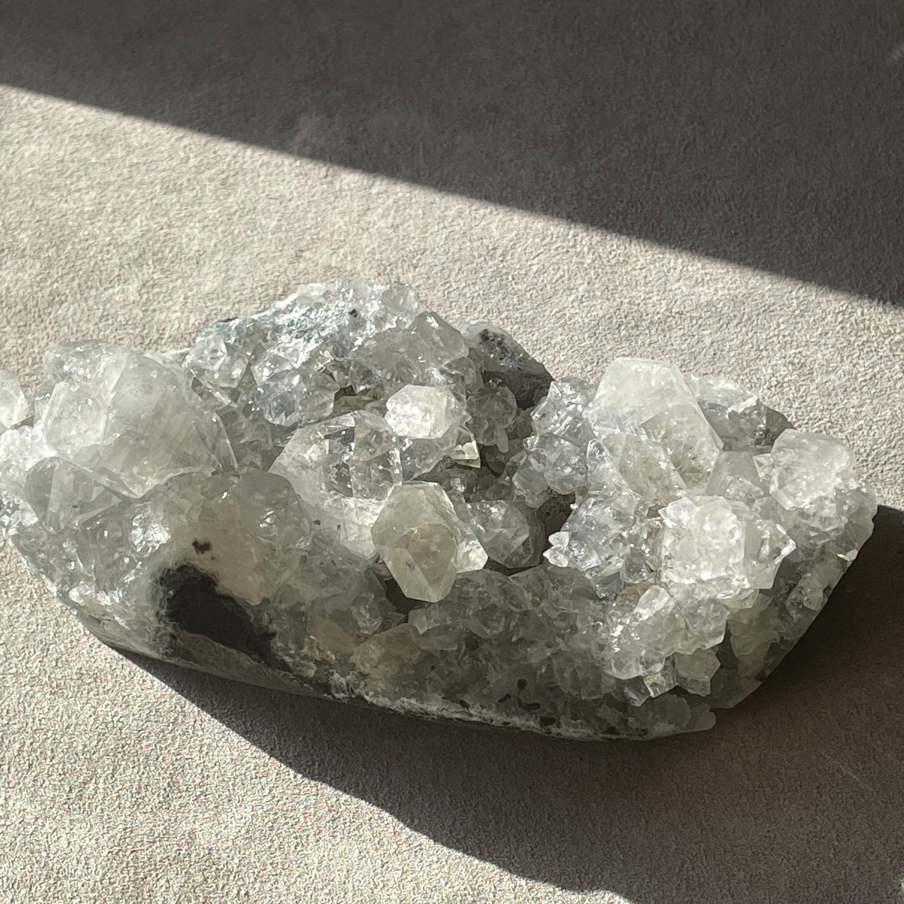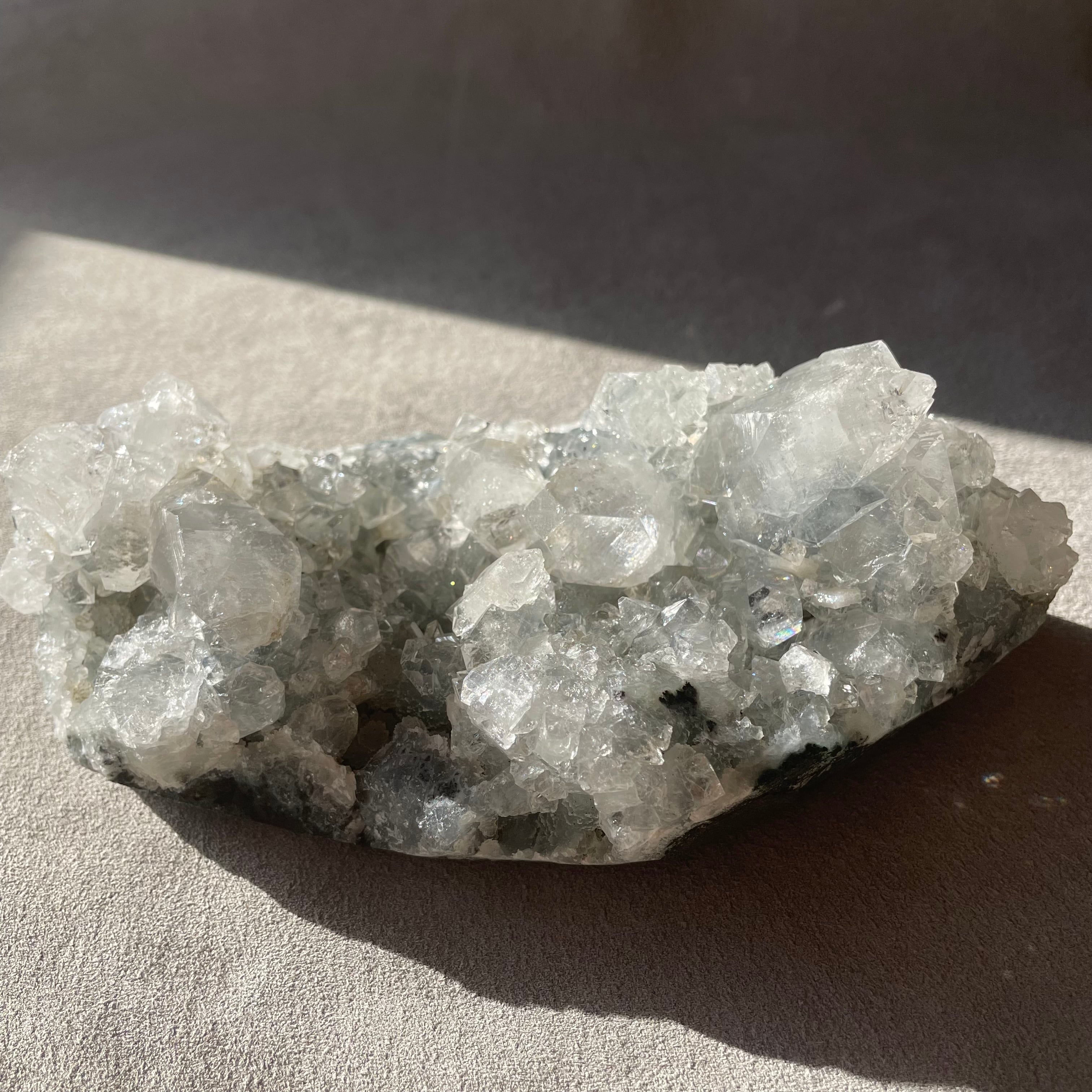 アポフィライトは世界各地で産出される石で、一見水晶に似ていますが輪切りにすると水晶は六角形であるのに対し、アポフィライトは四角形をしています。