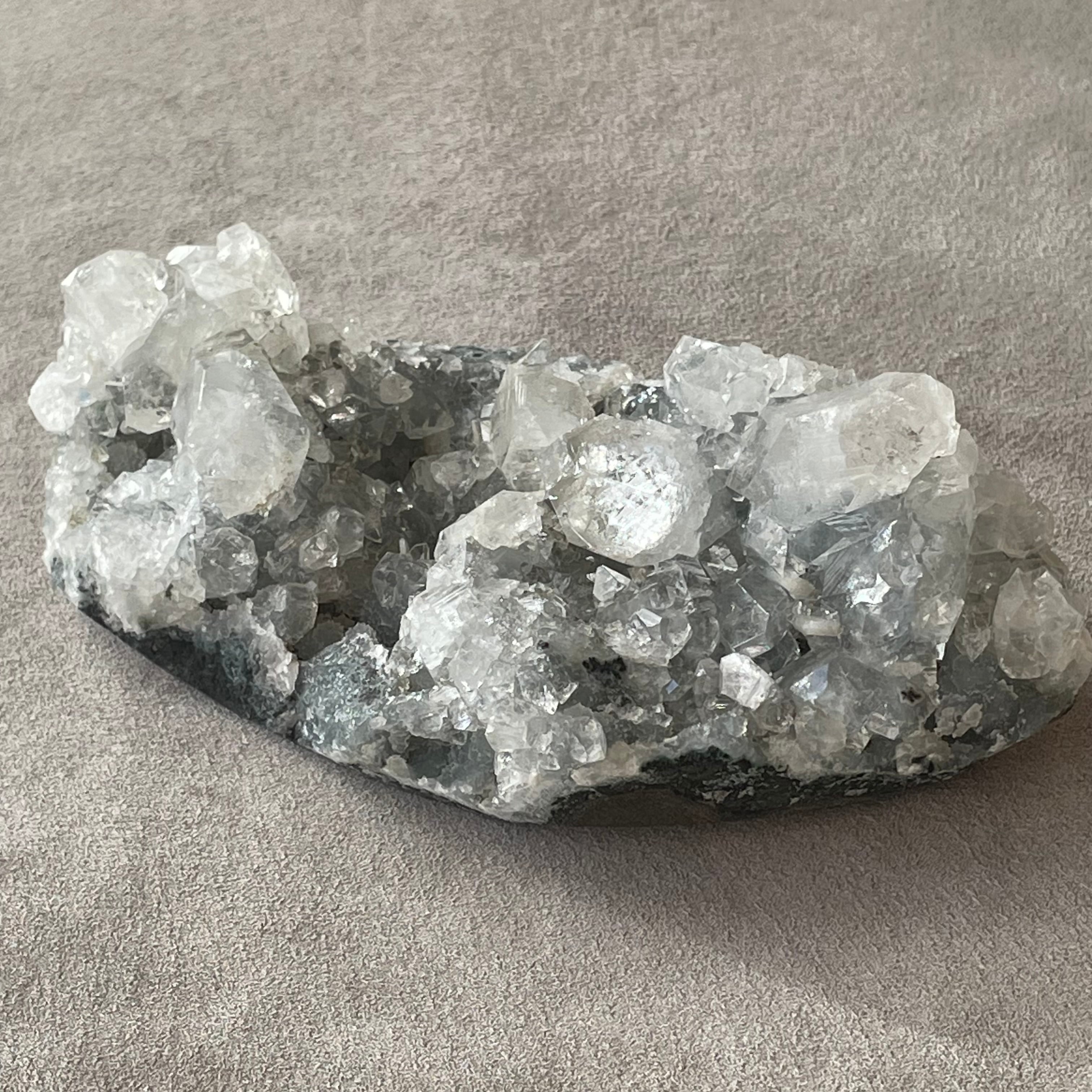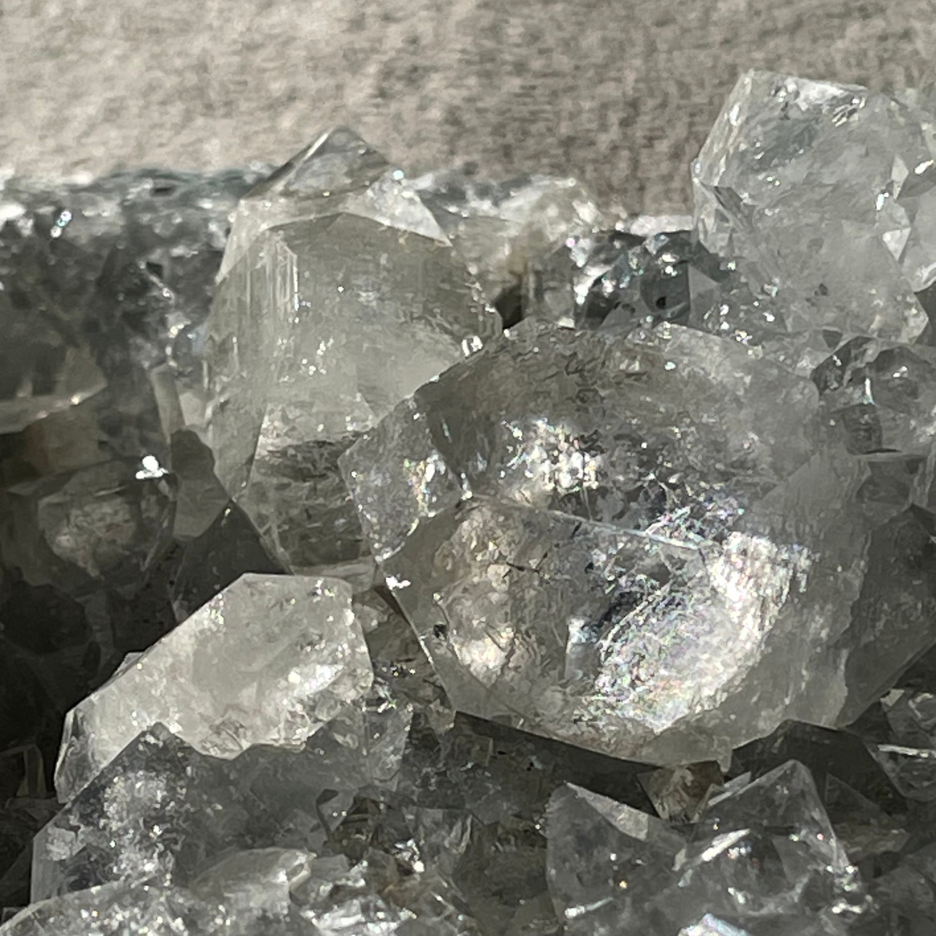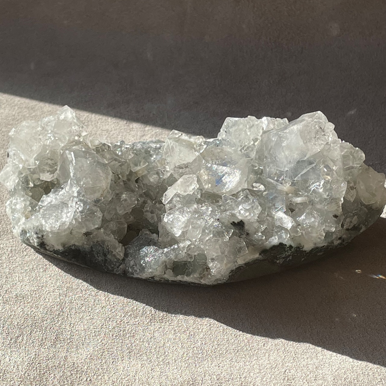 アポフィライトは世界各地で産出される石で、一見水晶に似ていますが輪切りにすると水晶は六角形であるのに対し、アポフィライトは四角形をしています。