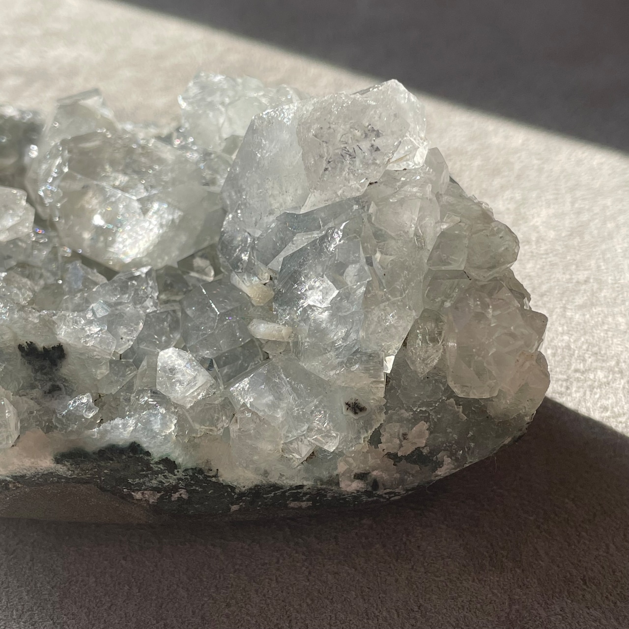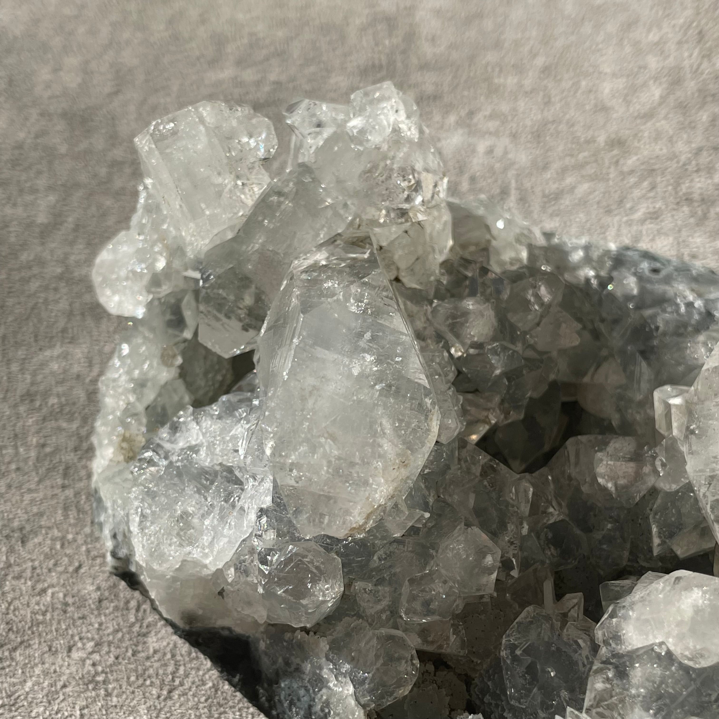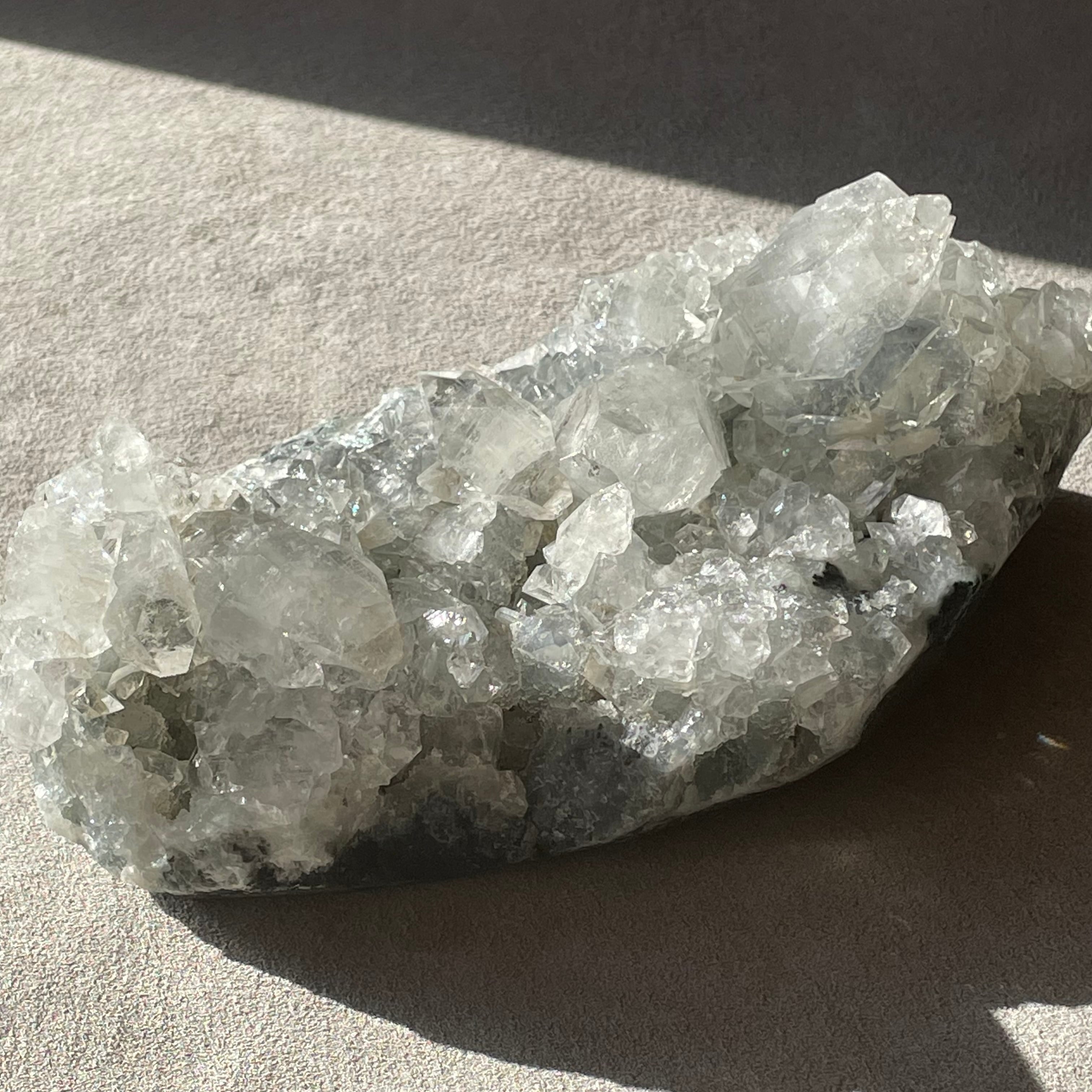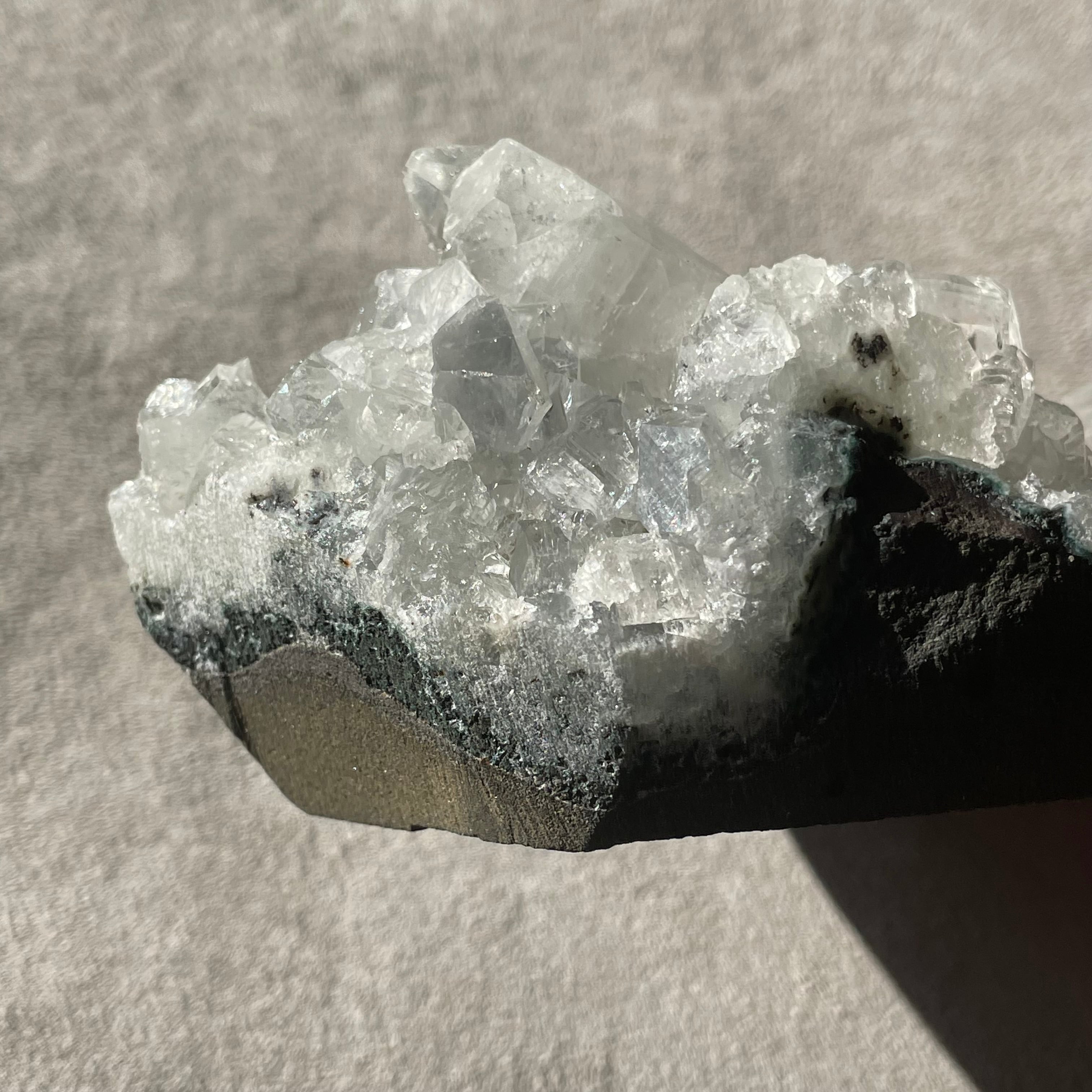 ブラックカルセドニーの母岩にクリアな輝きのアポフィライトが共生しています。