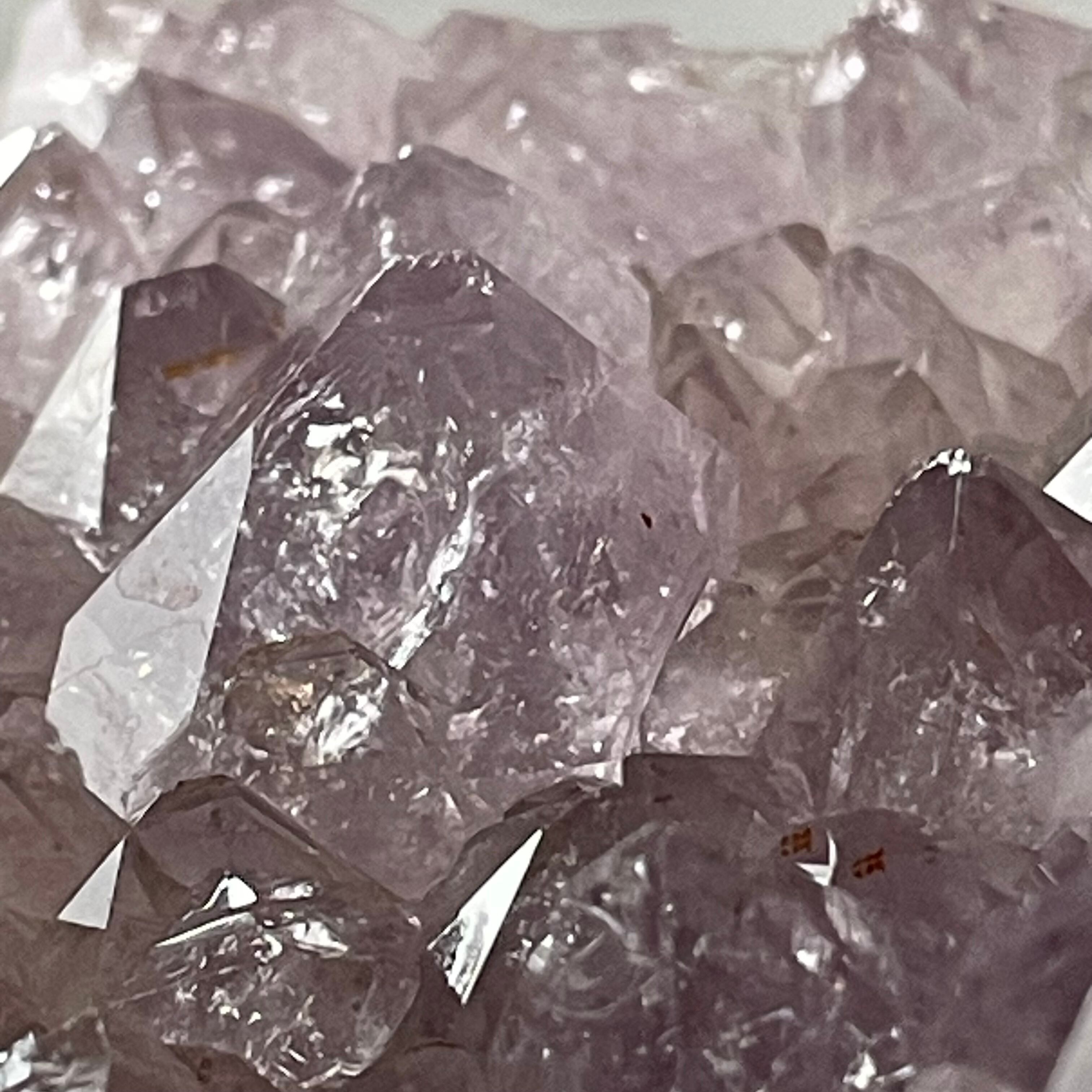 アメジストは透明の水晶に含まれる微量の鉄イオンが地中の放射線にさらされることによって紫色に発色します。その色調は鉄の含有量によって変わり赤紫や青紫、ラベンダー、ピンクパープルとバリエーションも豊かです。