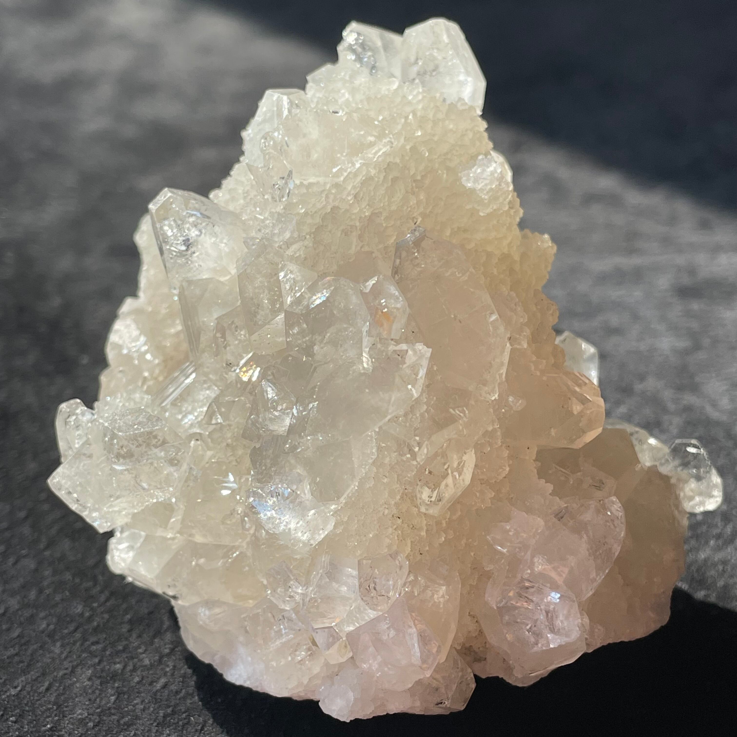 まるで積った粉雪の上にアポフィライトが集まってきたようなとてもキュートなクラスターです。不思議と一瞬で穏やかな気持ちにさせるような魅力があるアポフィライトです。