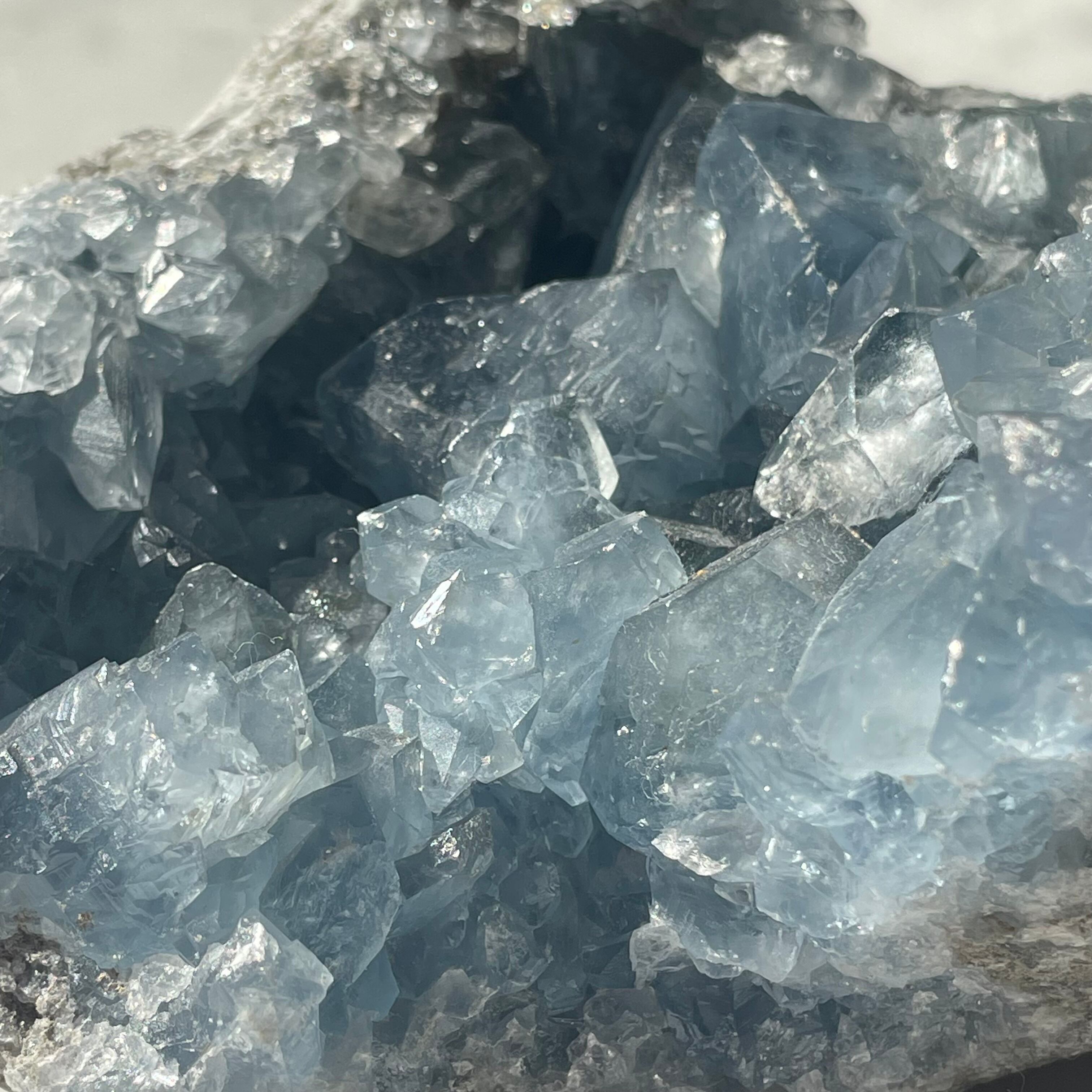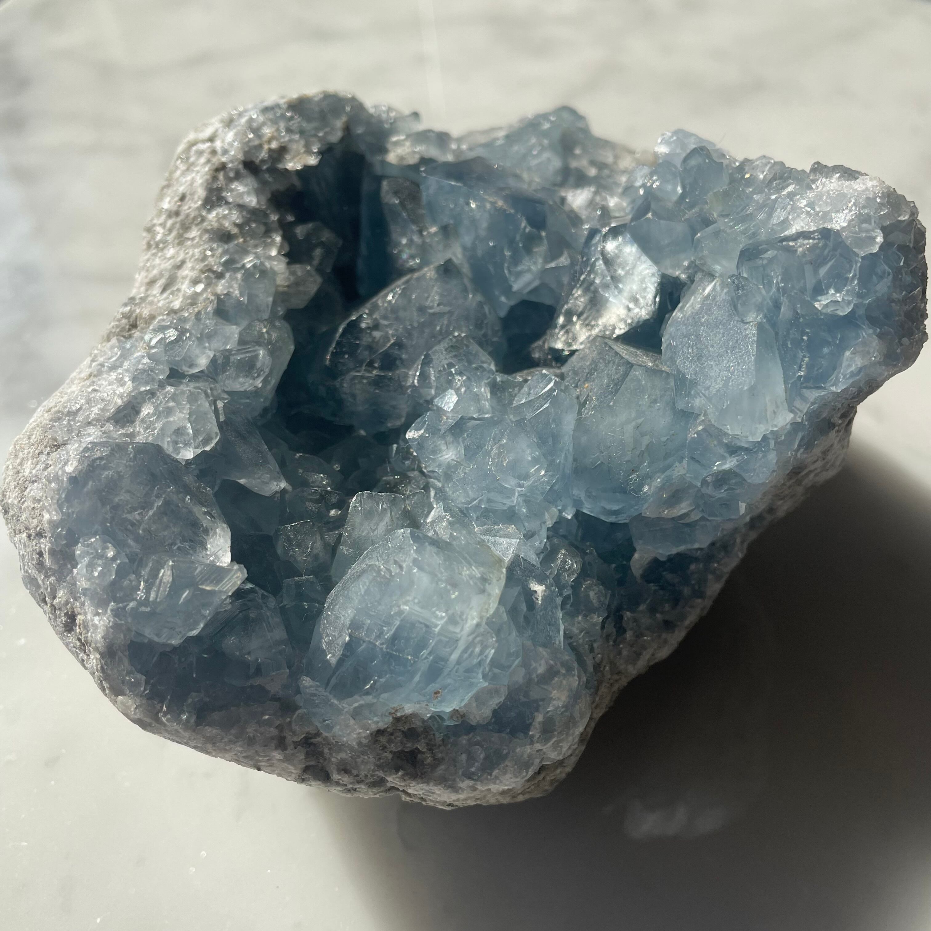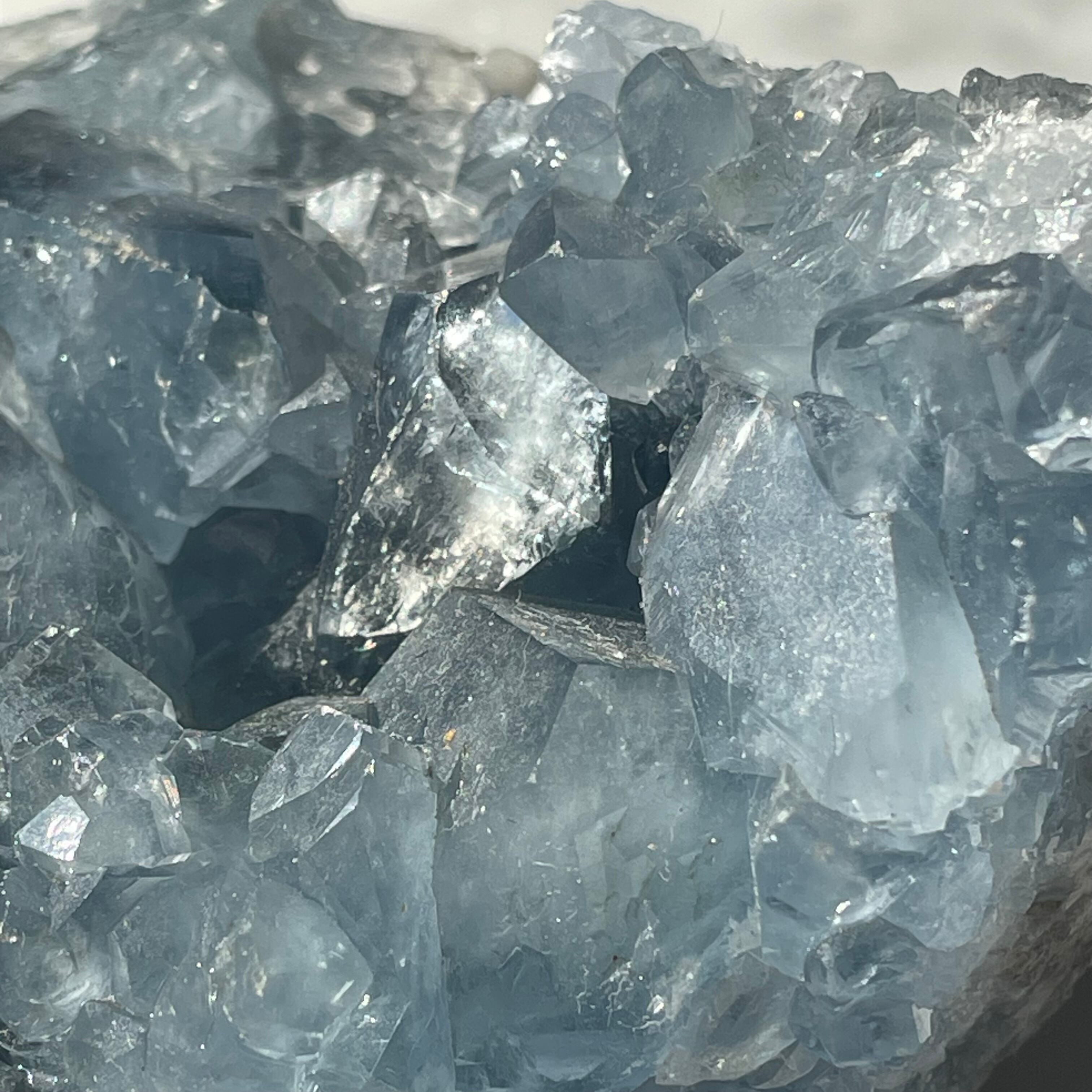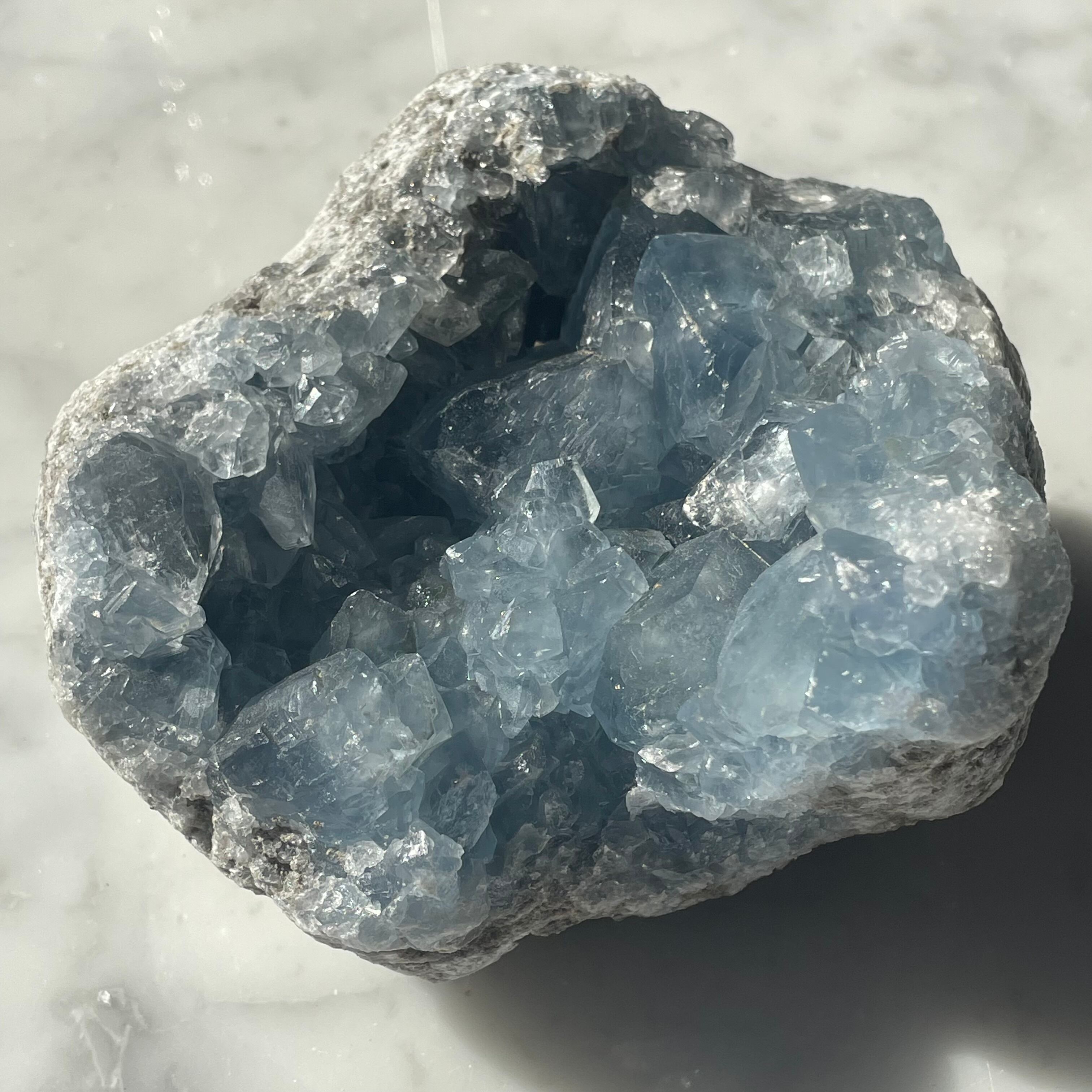 セレスタイトは硬度が低く衝撃に弱いので宝飾品の加工には向いておらず、美しいガラス光沢の結晶を楽しむ鑑賞用として多くはジオードクラスターが流通しています。
