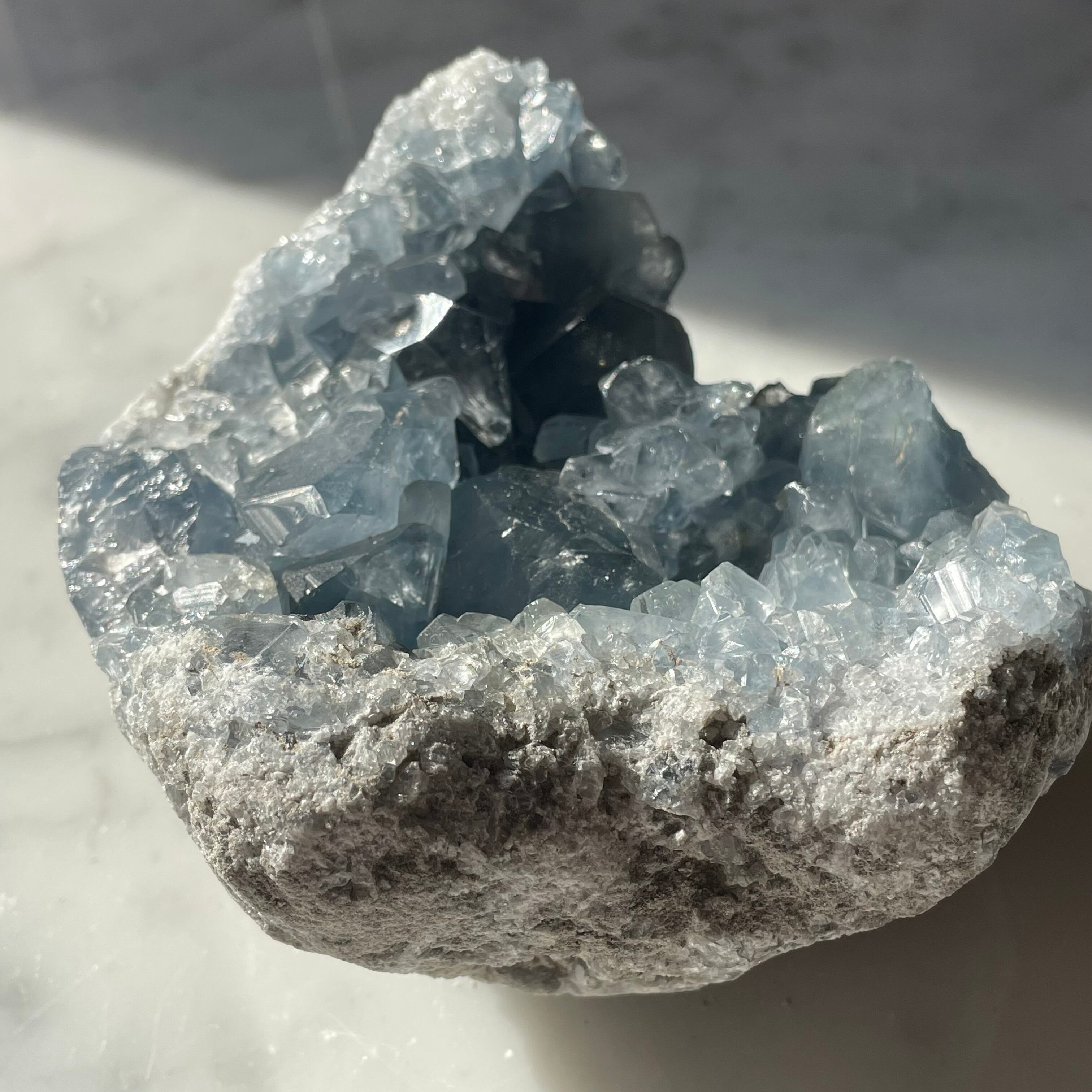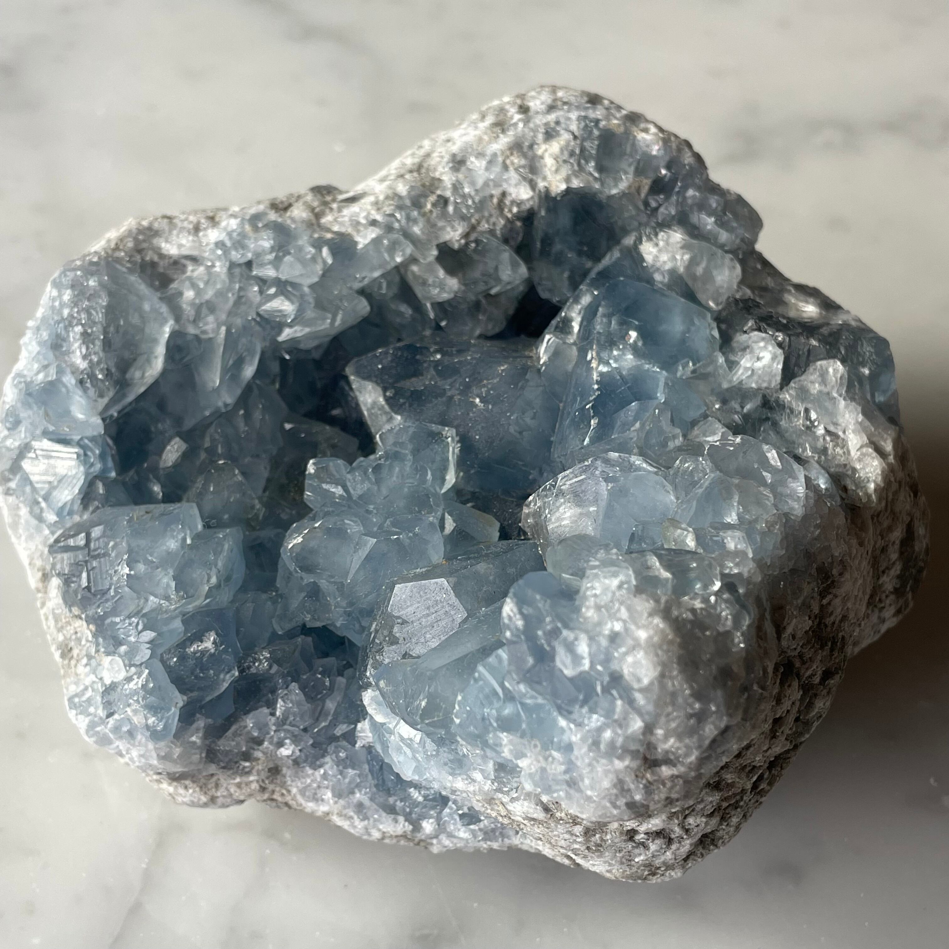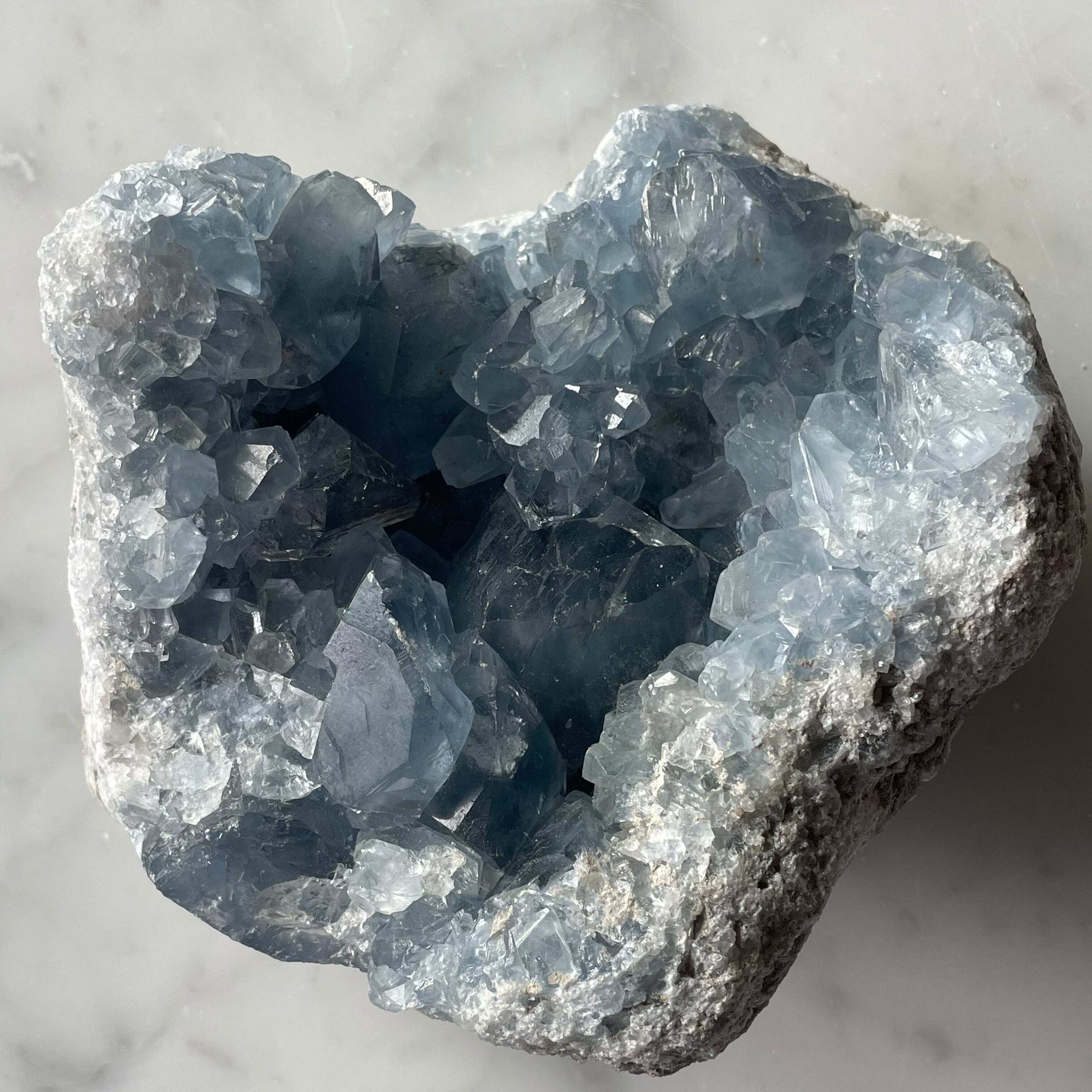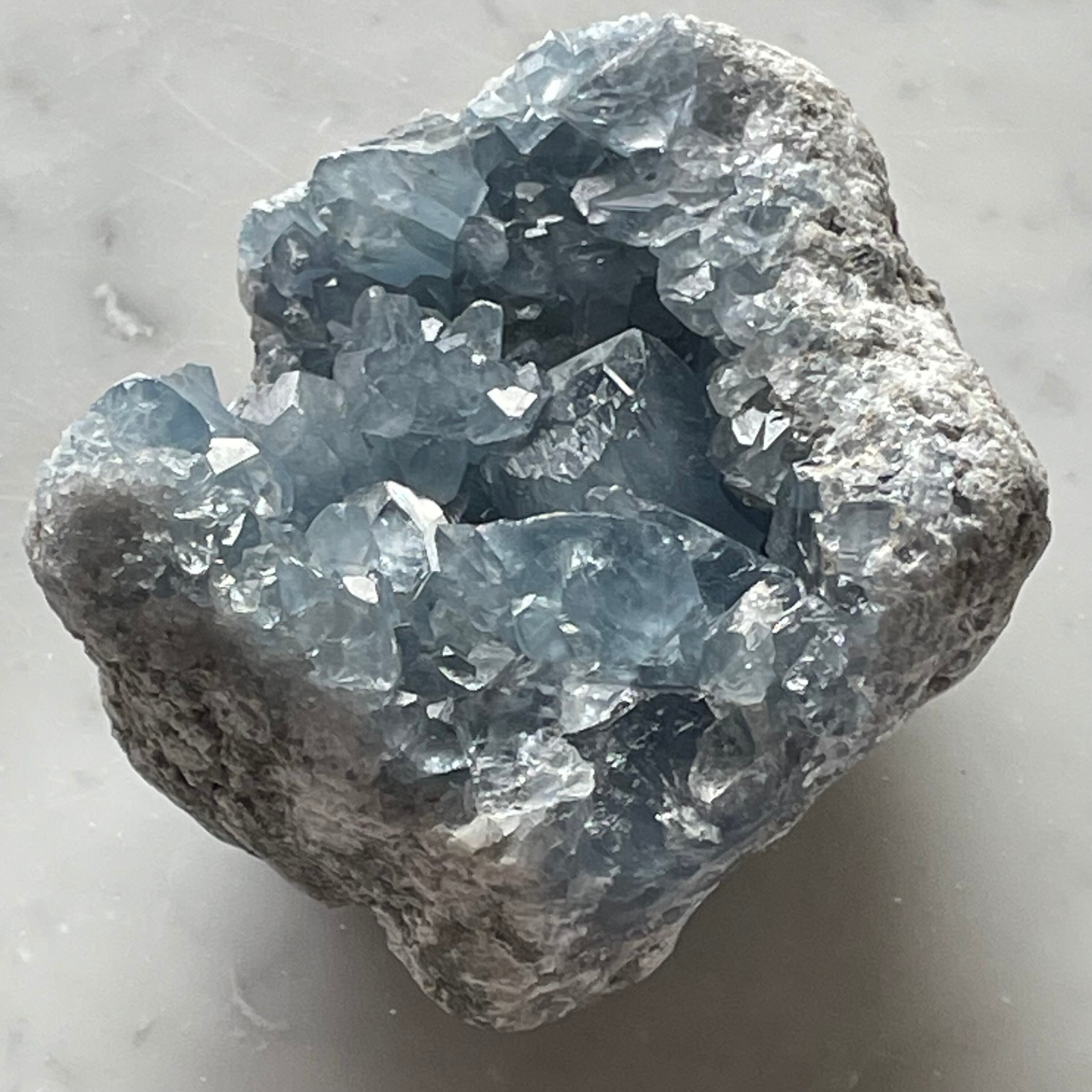 セレスタイトは硬度が低く衝撃に弱いので宝飾品の加工には向いておらず、美しいガラス光沢の結晶を楽しむ鑑賞用として多くはジオードクラスターが流通しています。