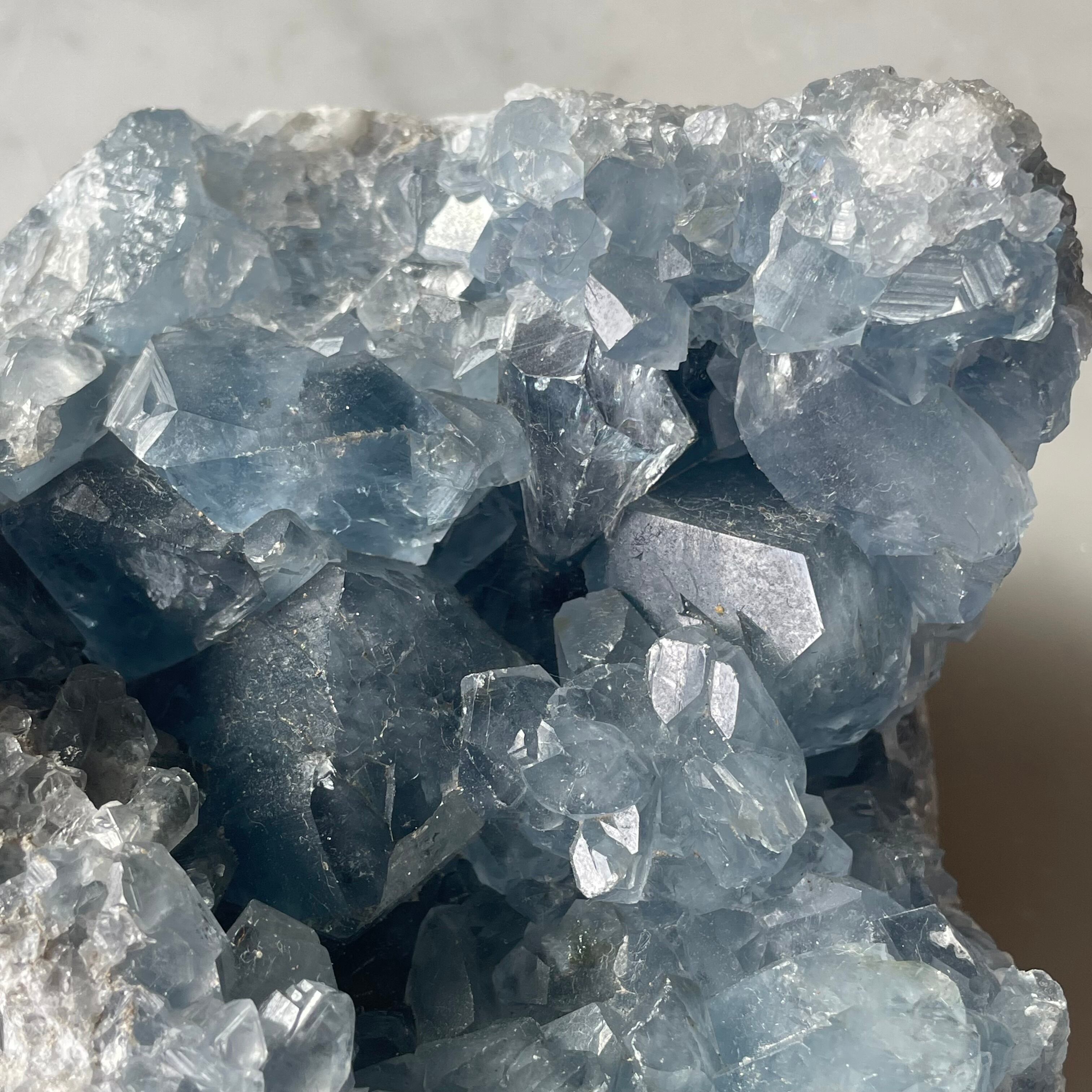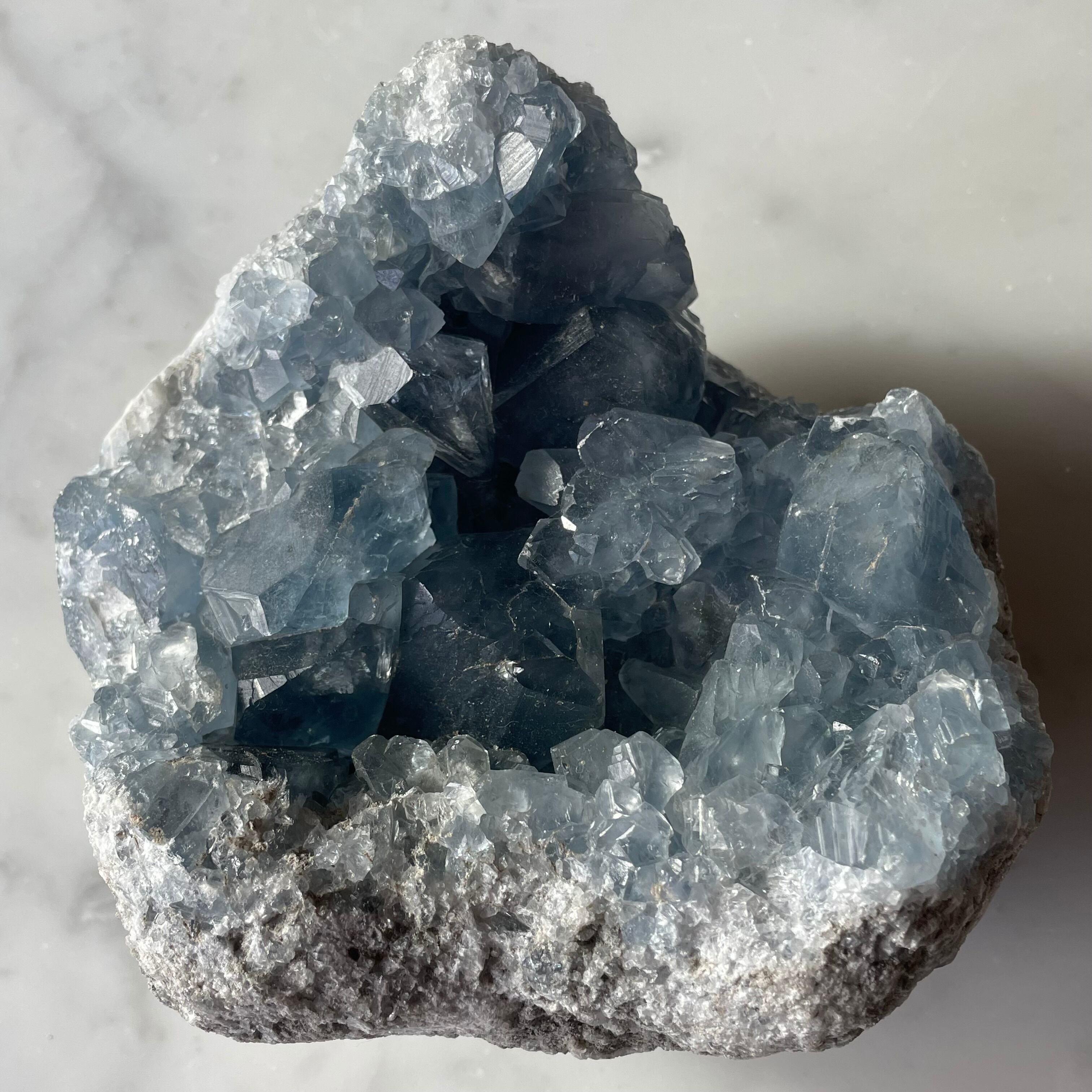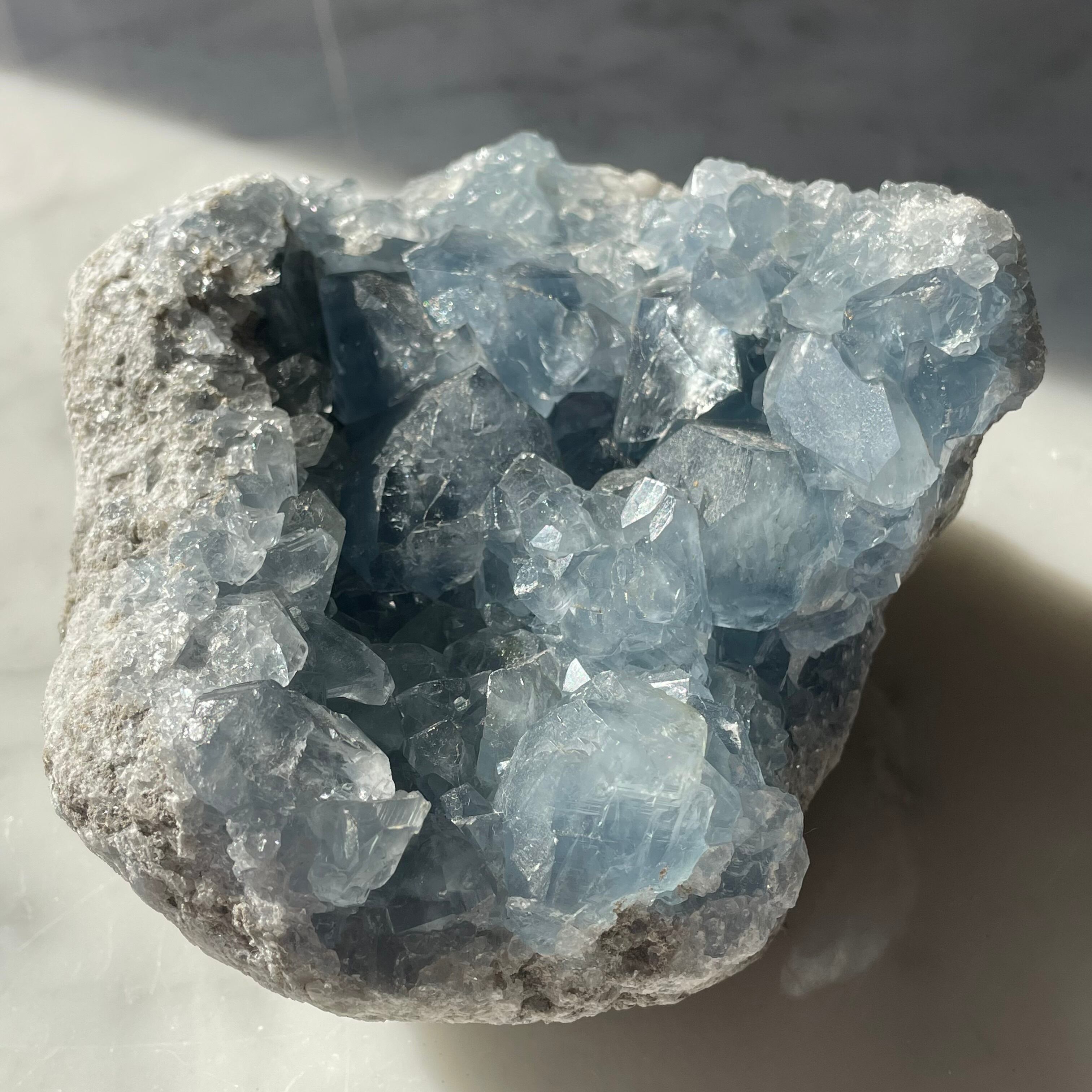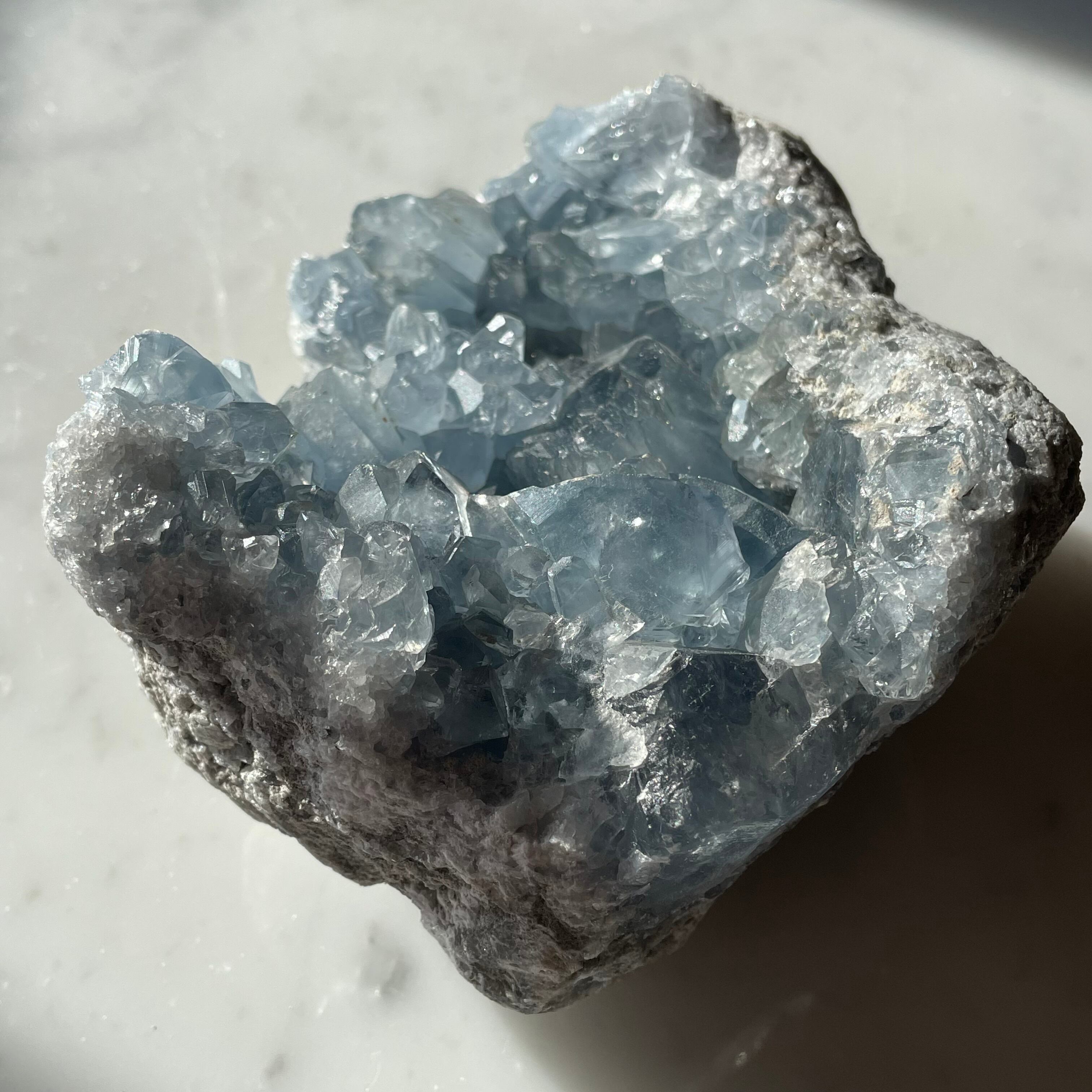 セレスタイトは硬度が低く衝撃に弱いので宝飾品の加工には向いておらず、美しいガラス光沢の結晶を楽しむ鑑賞用として多くはジオードクラスターが流通しています。