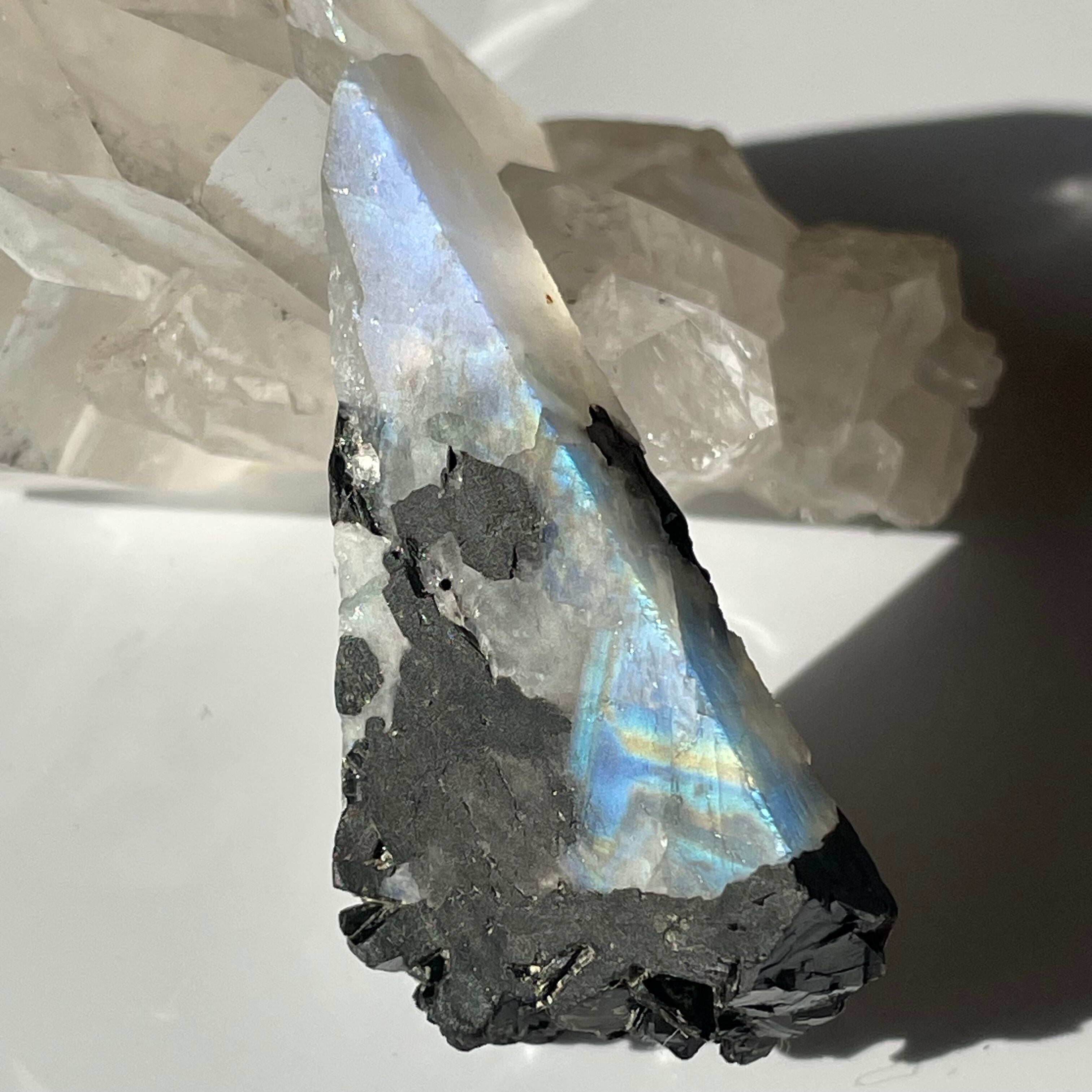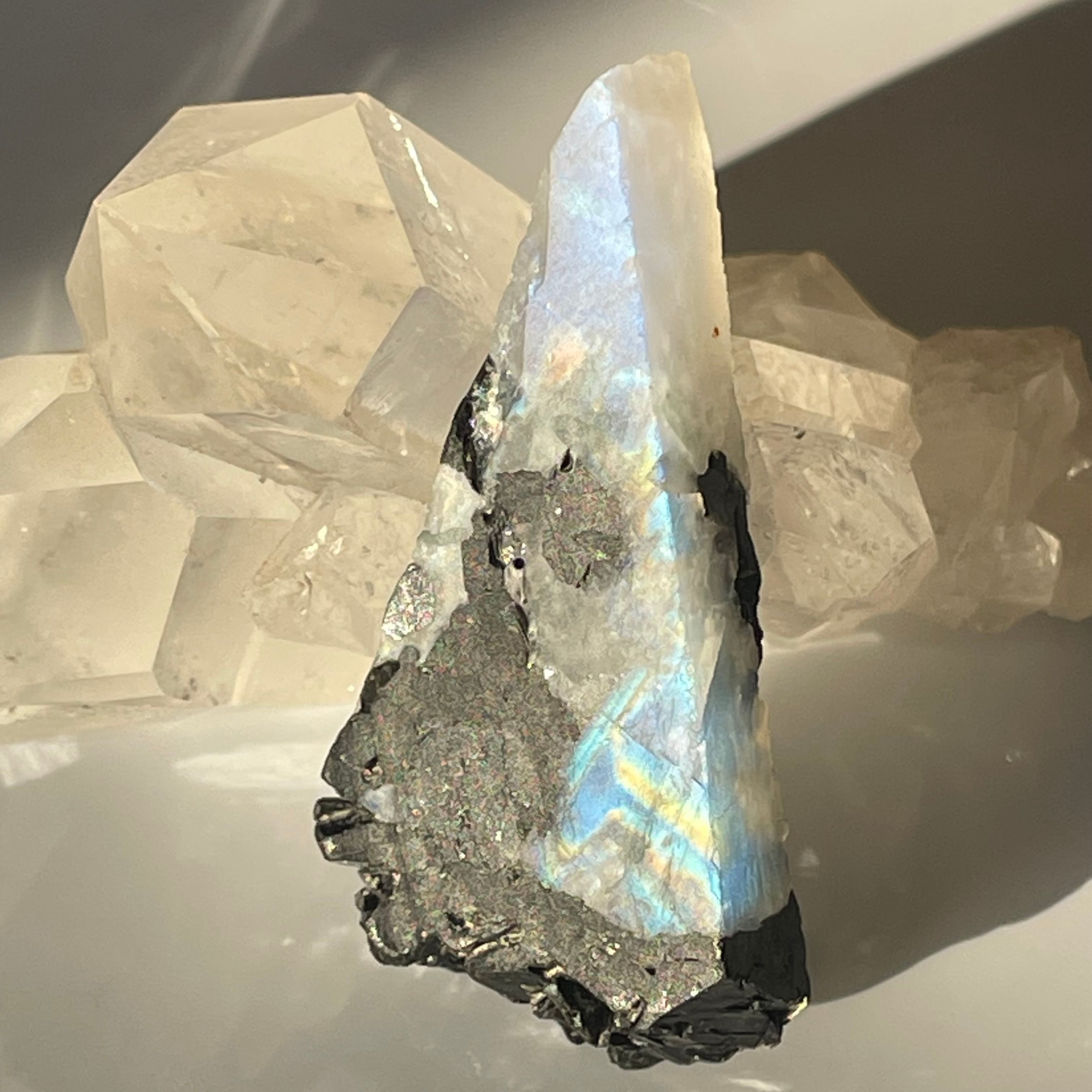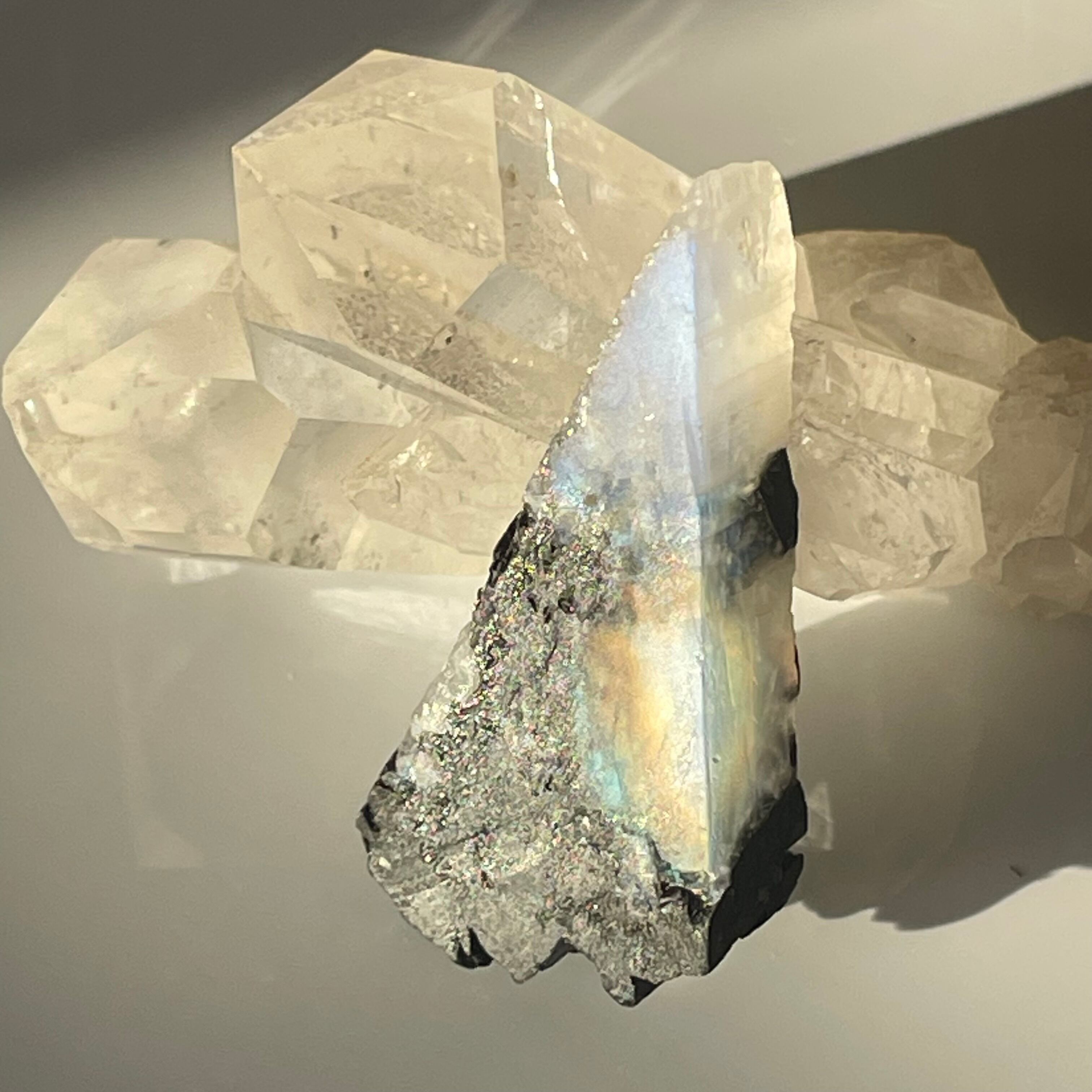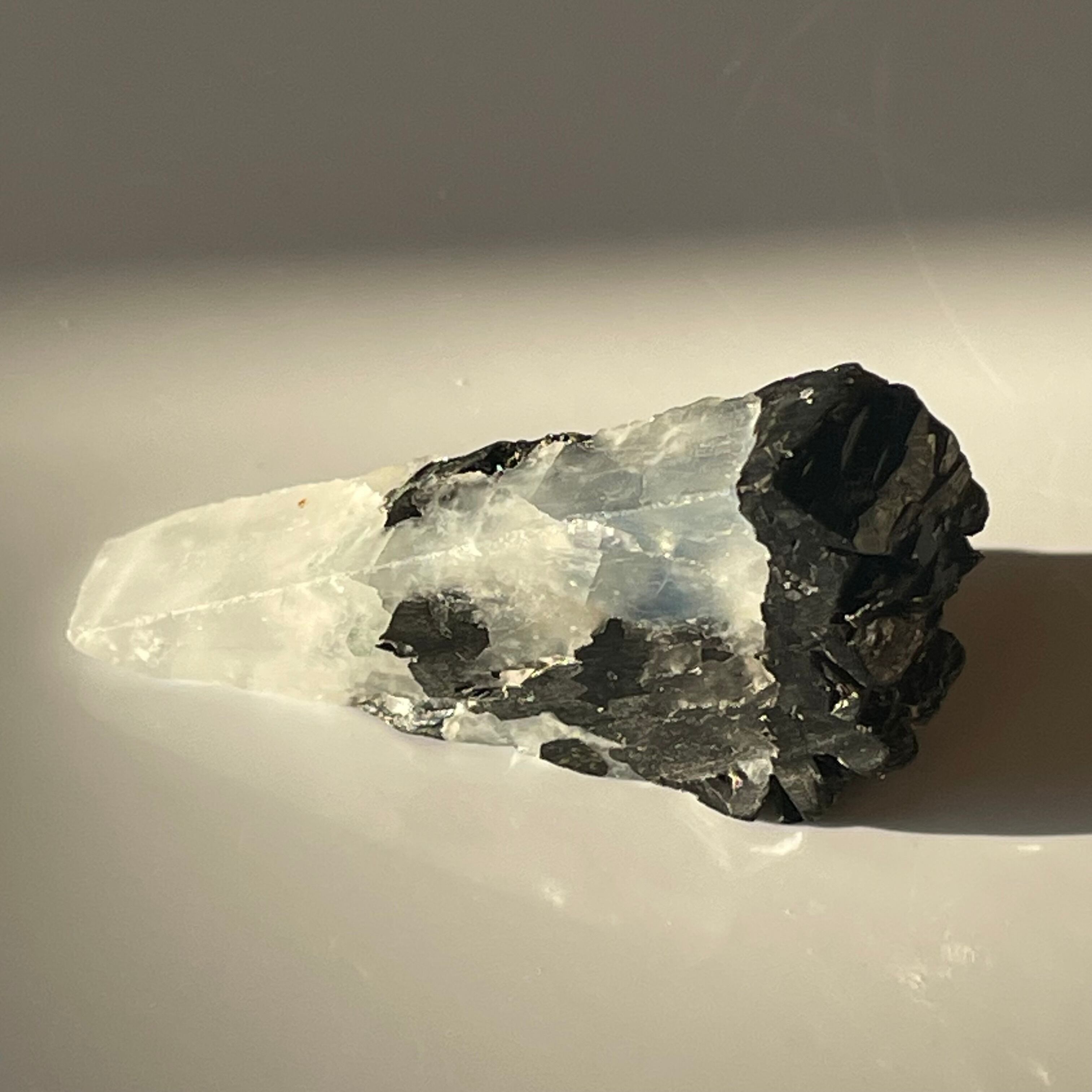 一見すると白と黒の石ですが、見る角度によって虹色の鮮やかな光彩が現れてとても綺麗です。バイオタイト(黒雲母)が共生していて、コントラストも魅力的なレインボームーンストーンです。