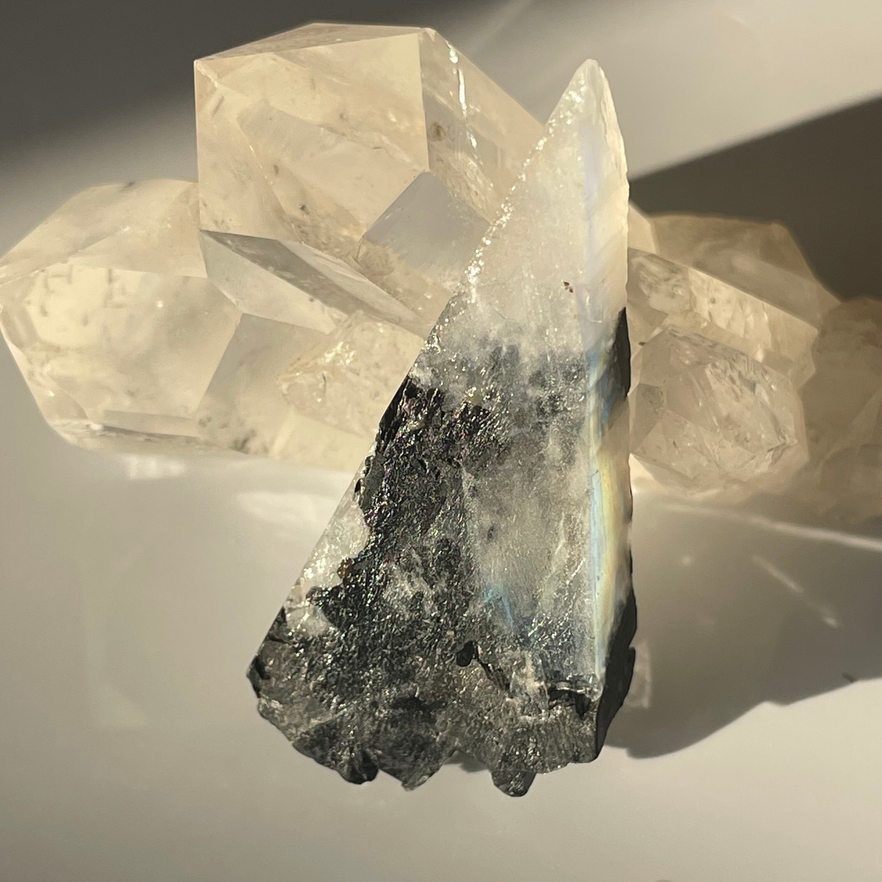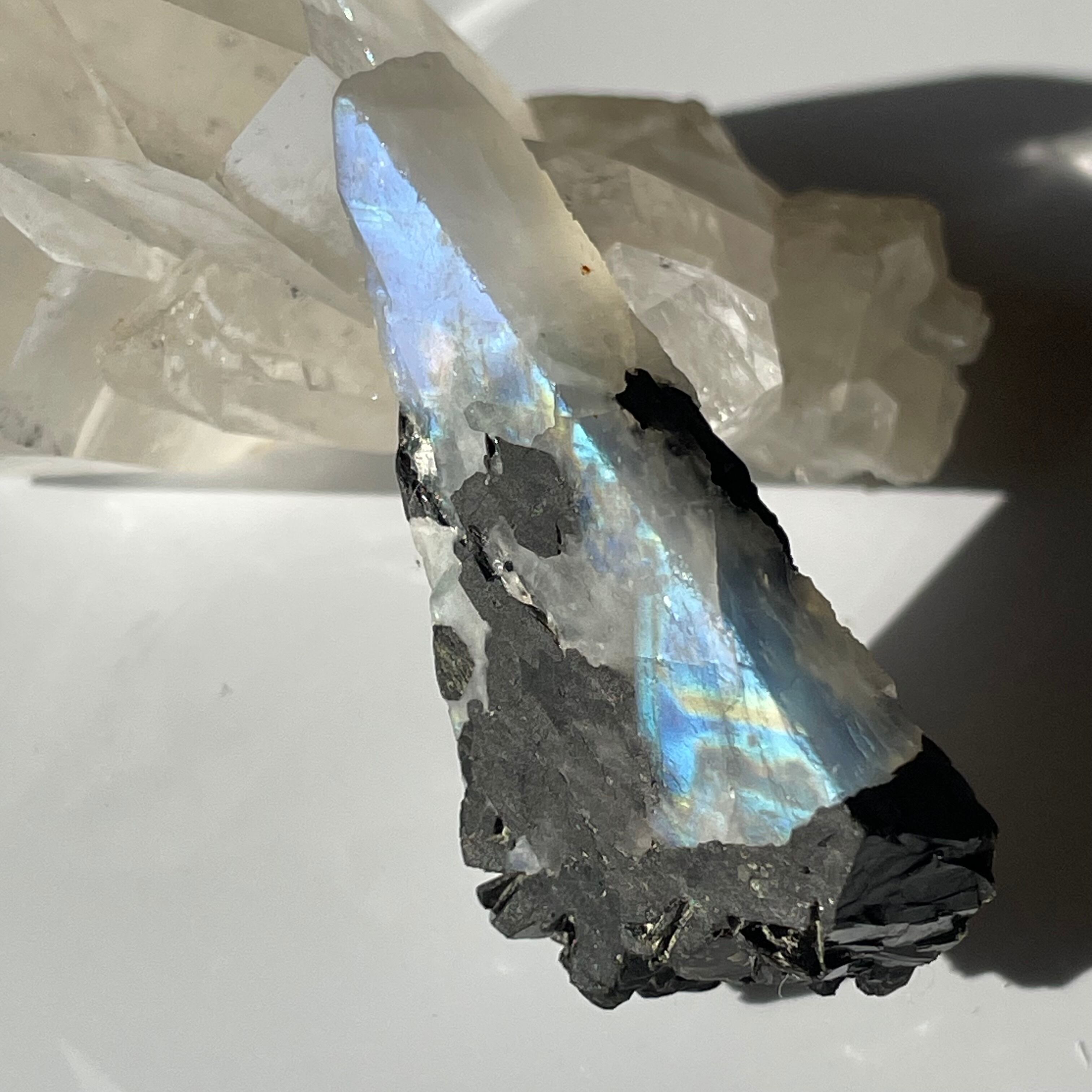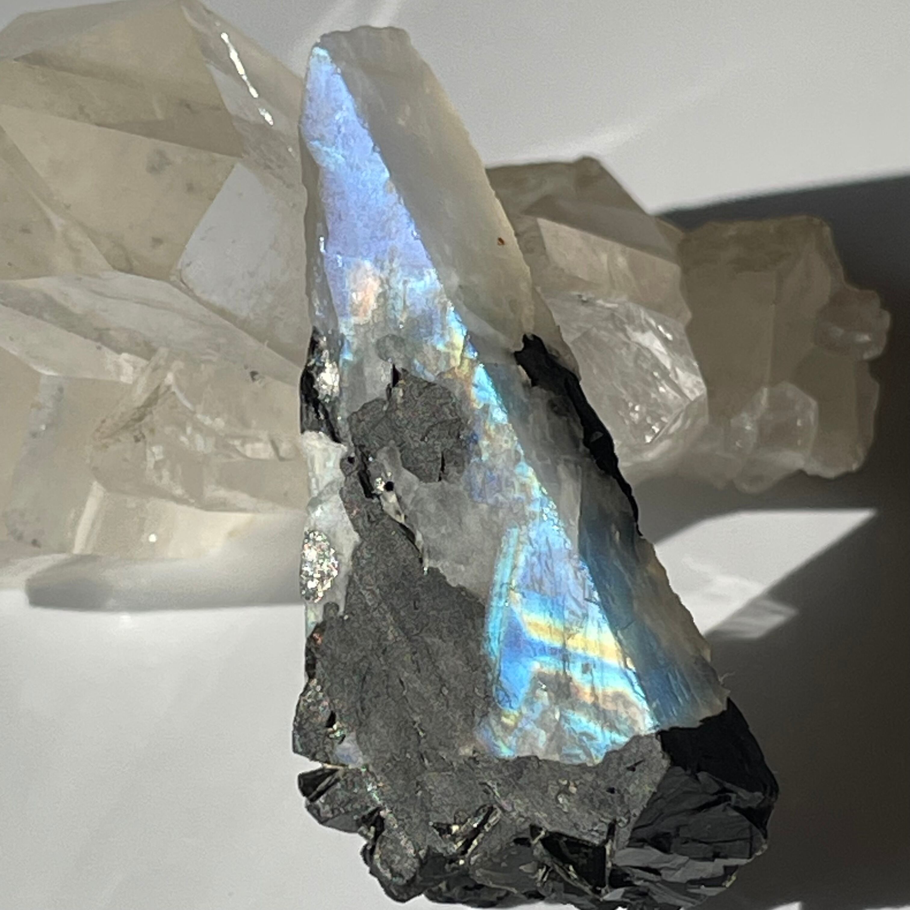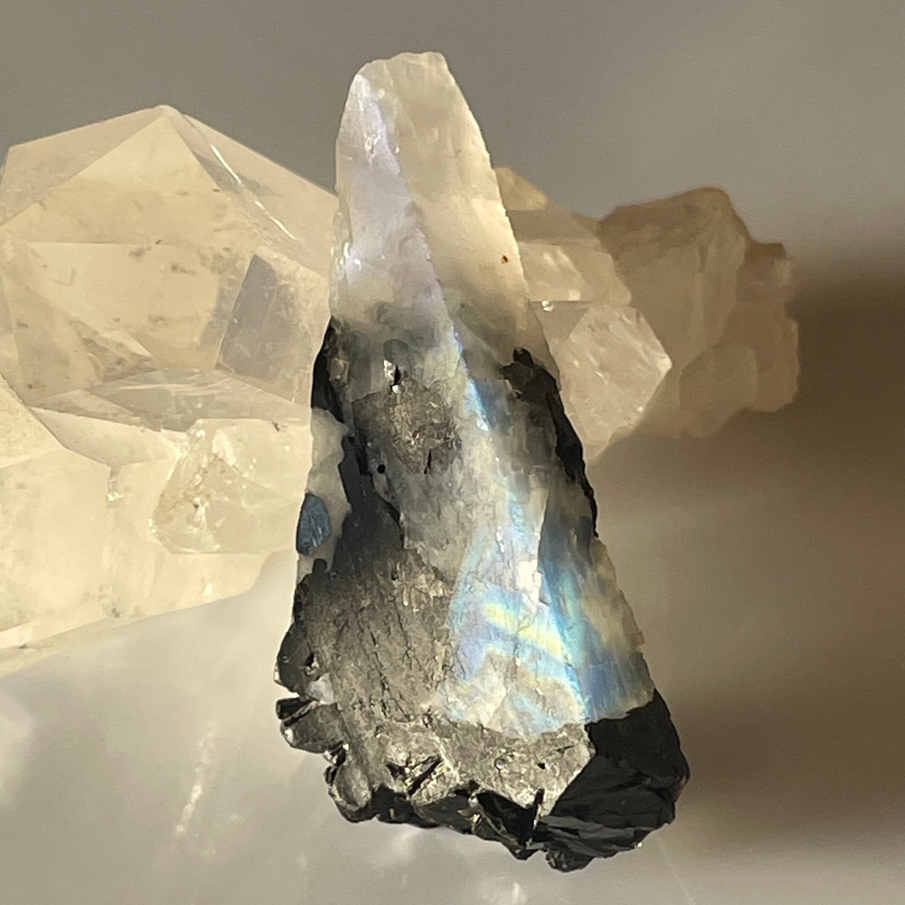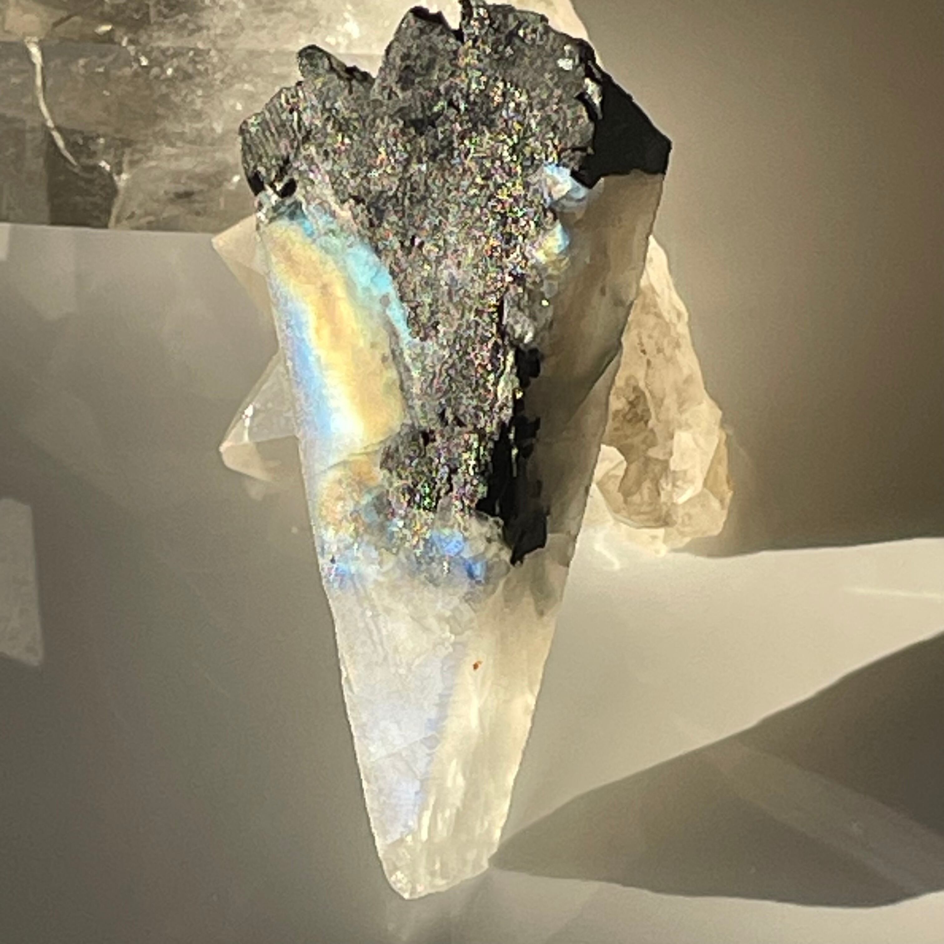 一見すると白と黒の石ですが、見る角度によって虹色の鮮やかな光彩が現れてとても綺麗です。バイオタイト(黒雲母)が共生していて、コントラストも魅力的なレインボームーンストーンです。