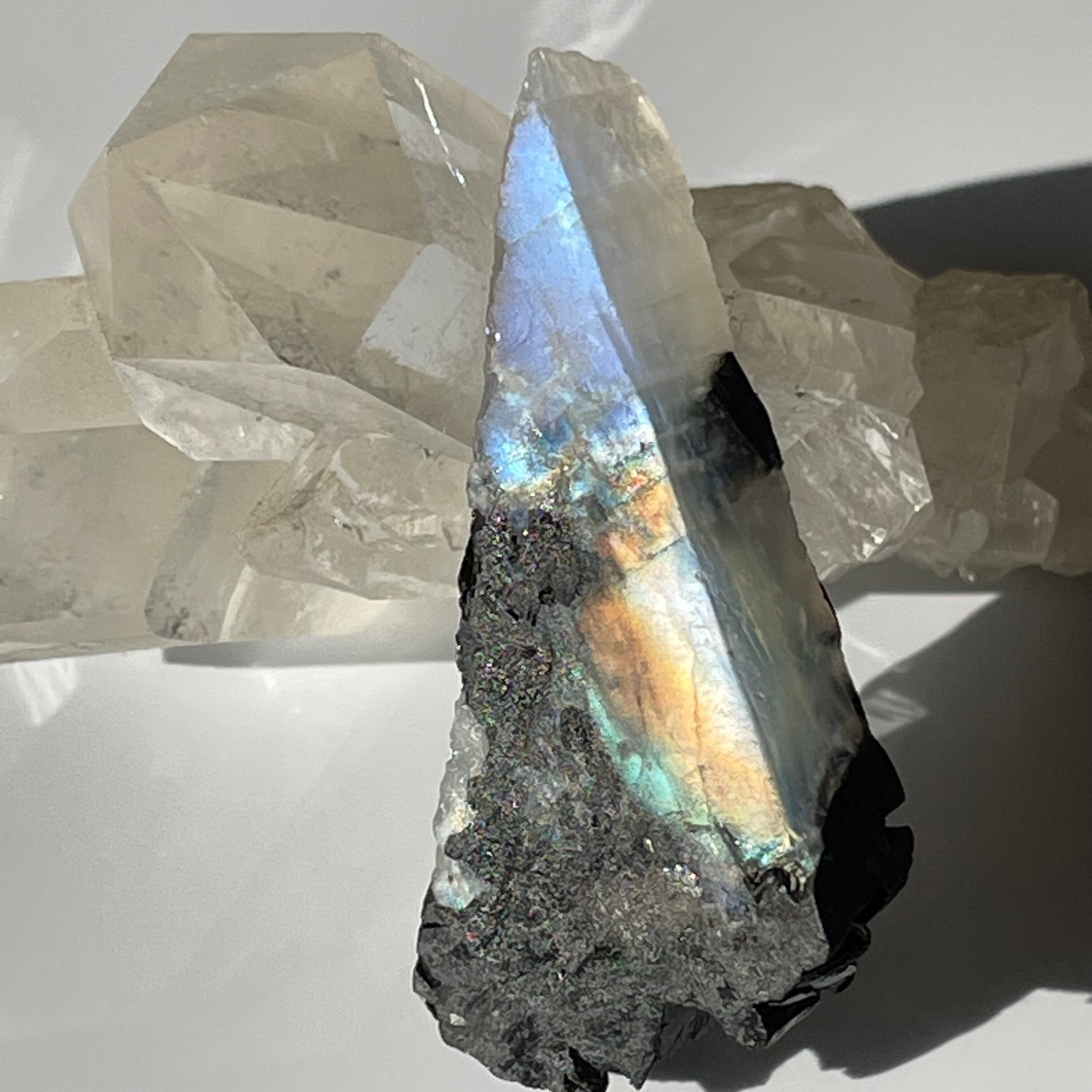 鉱物的にはラブラドライトに属する石で、地色が乳白色または半透明のものはホワイトラブラドライトと呼ばれています。