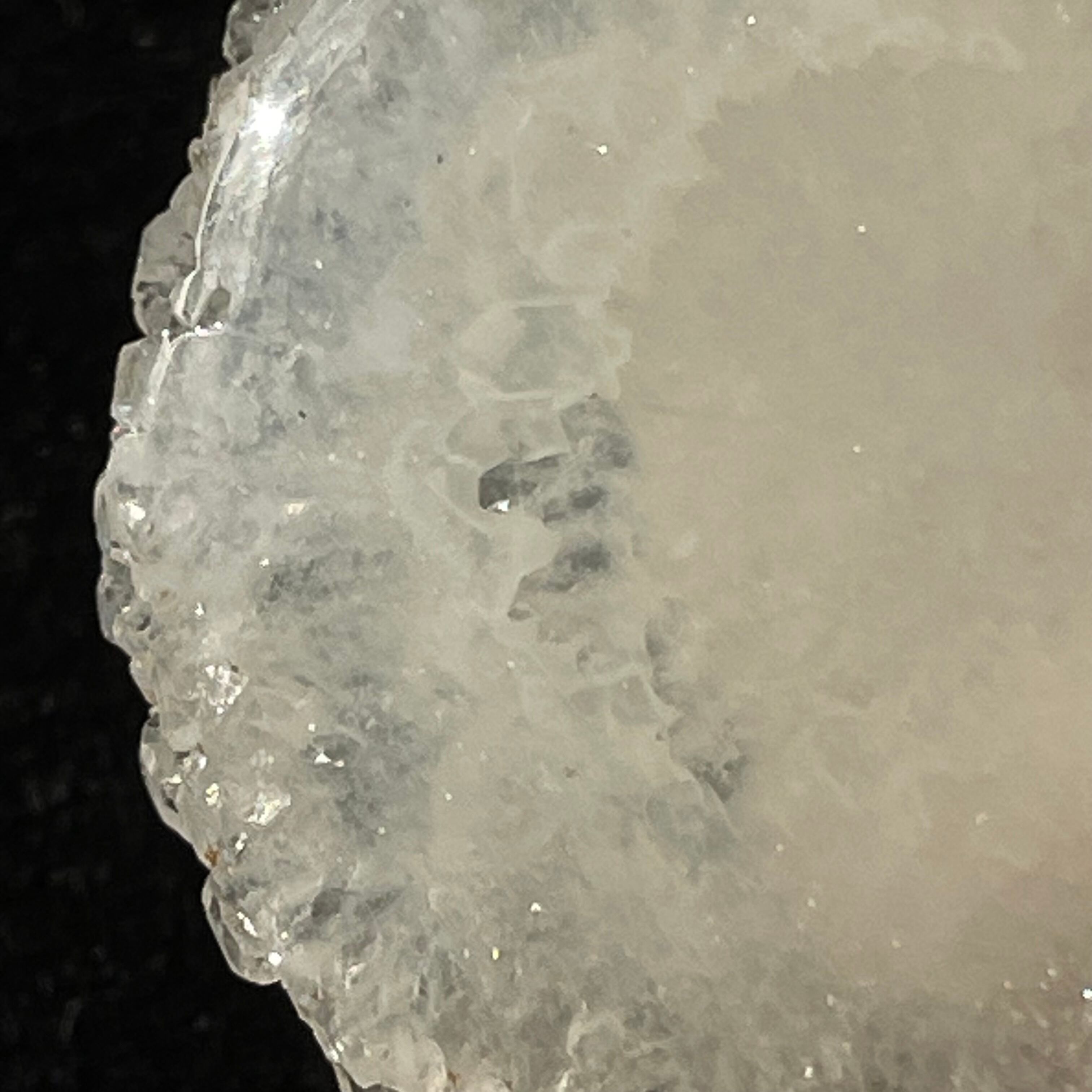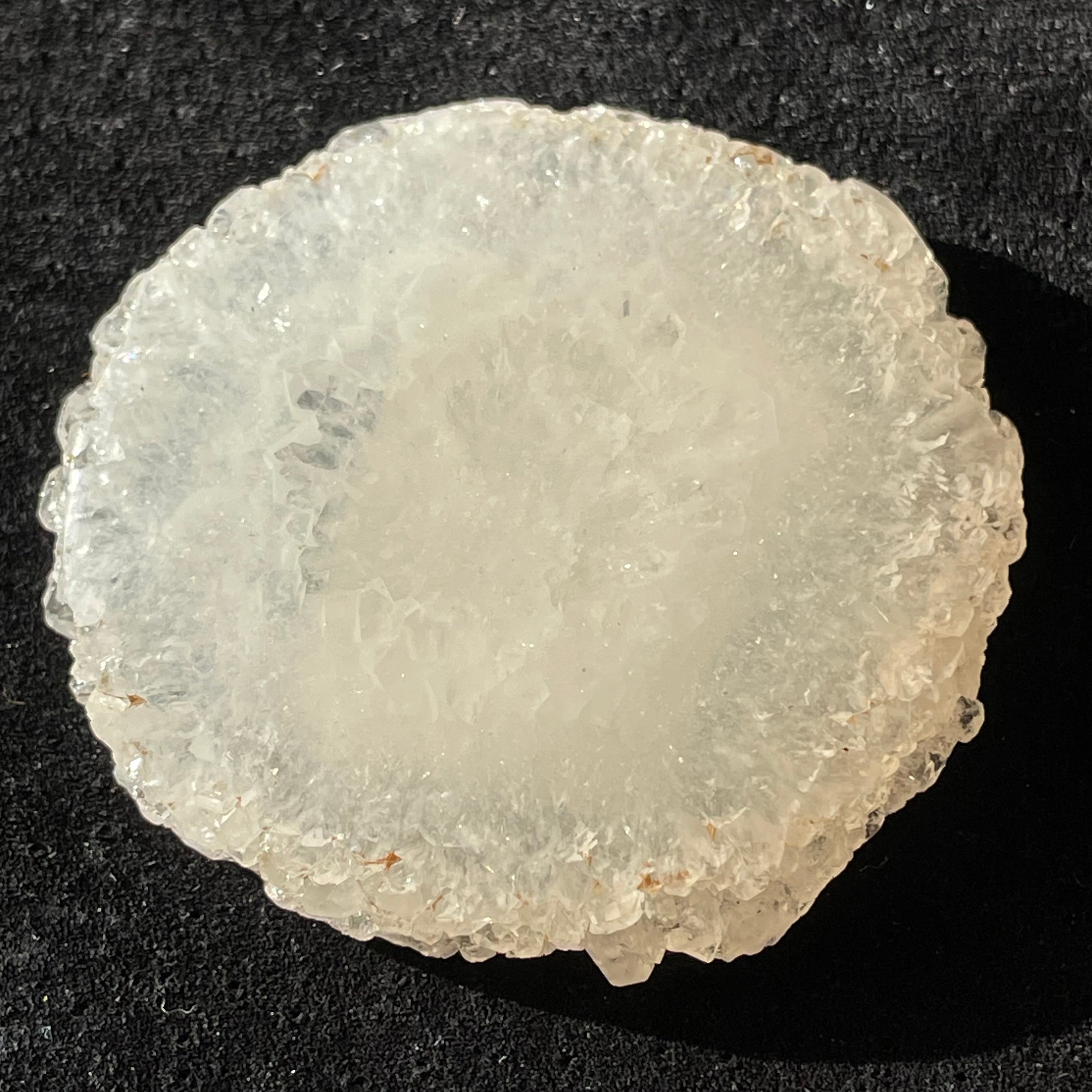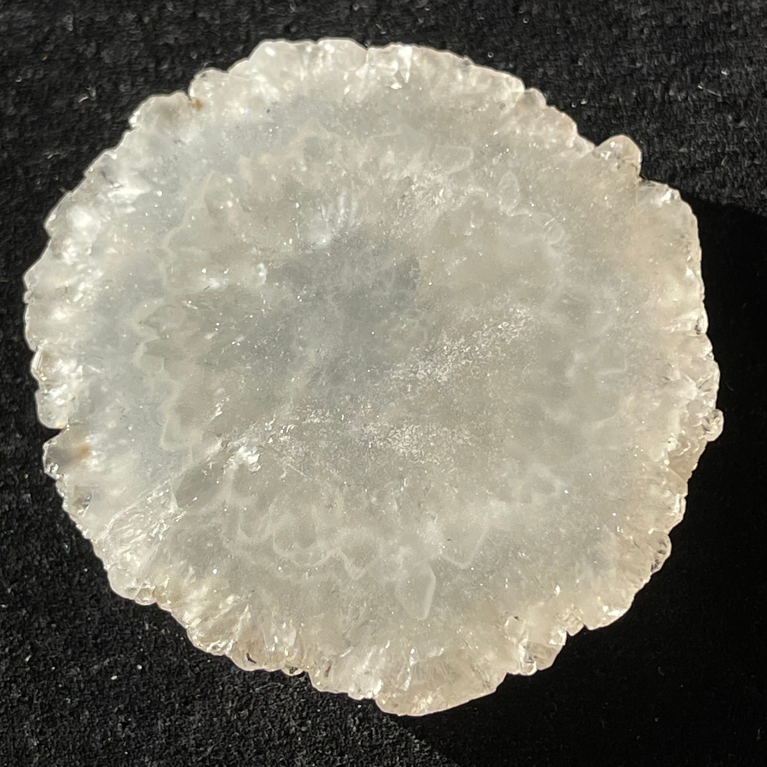 半透明、乳白色に結晶化した模様が美しいソーラークォーツです。スライス状ですが、片面はツルツルに磨かれているので光を当てると結晶がキラキラ輝いてとても綺麗です。