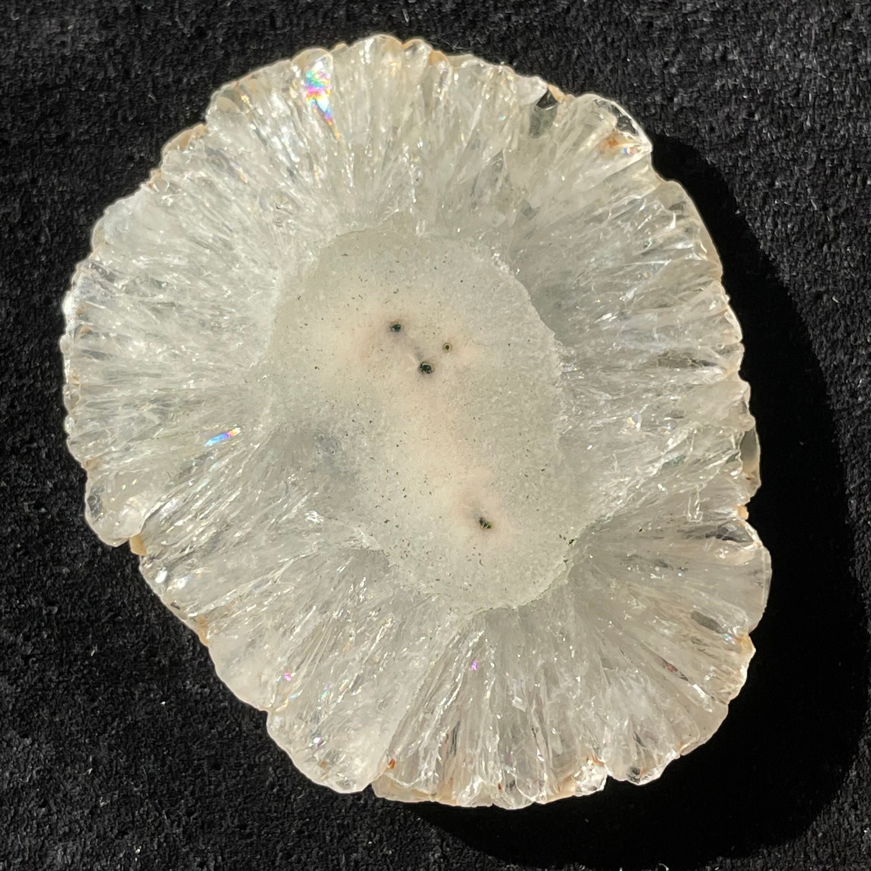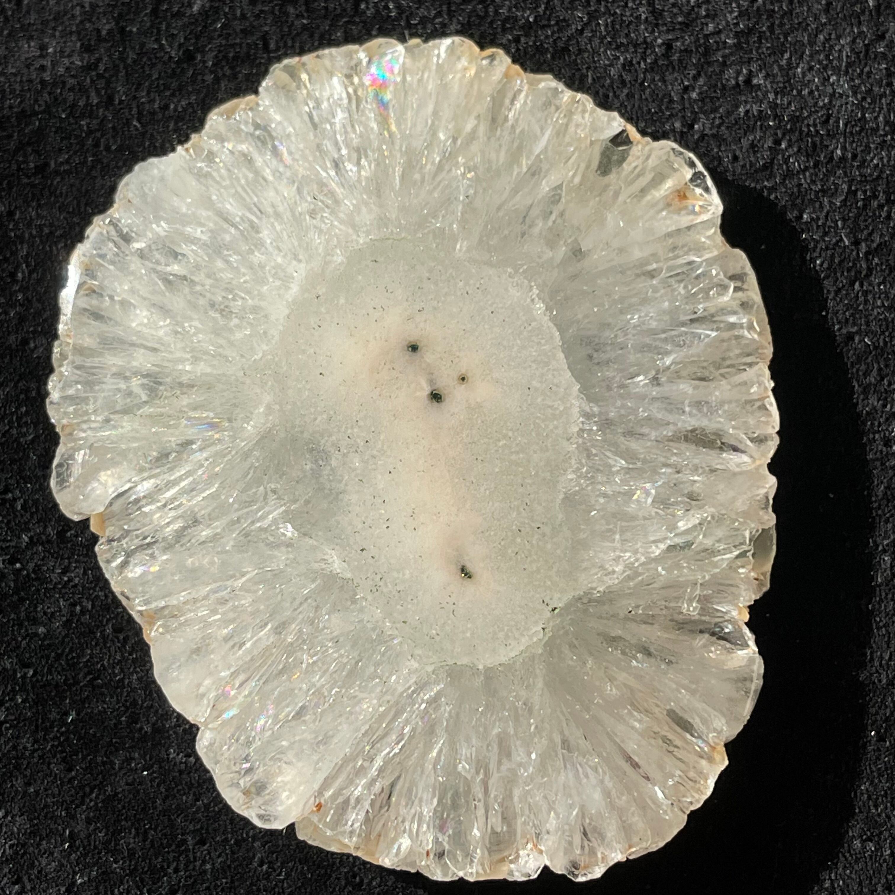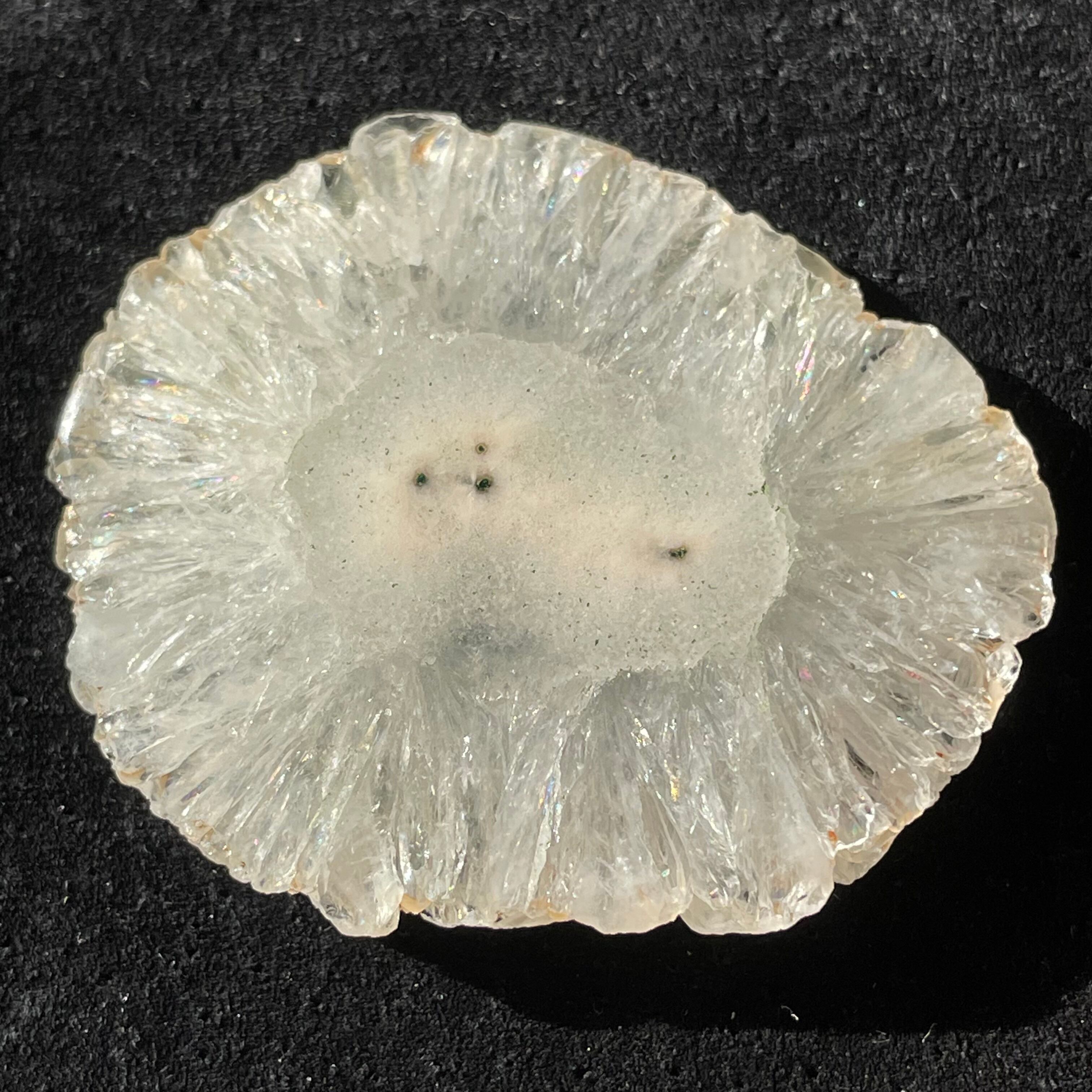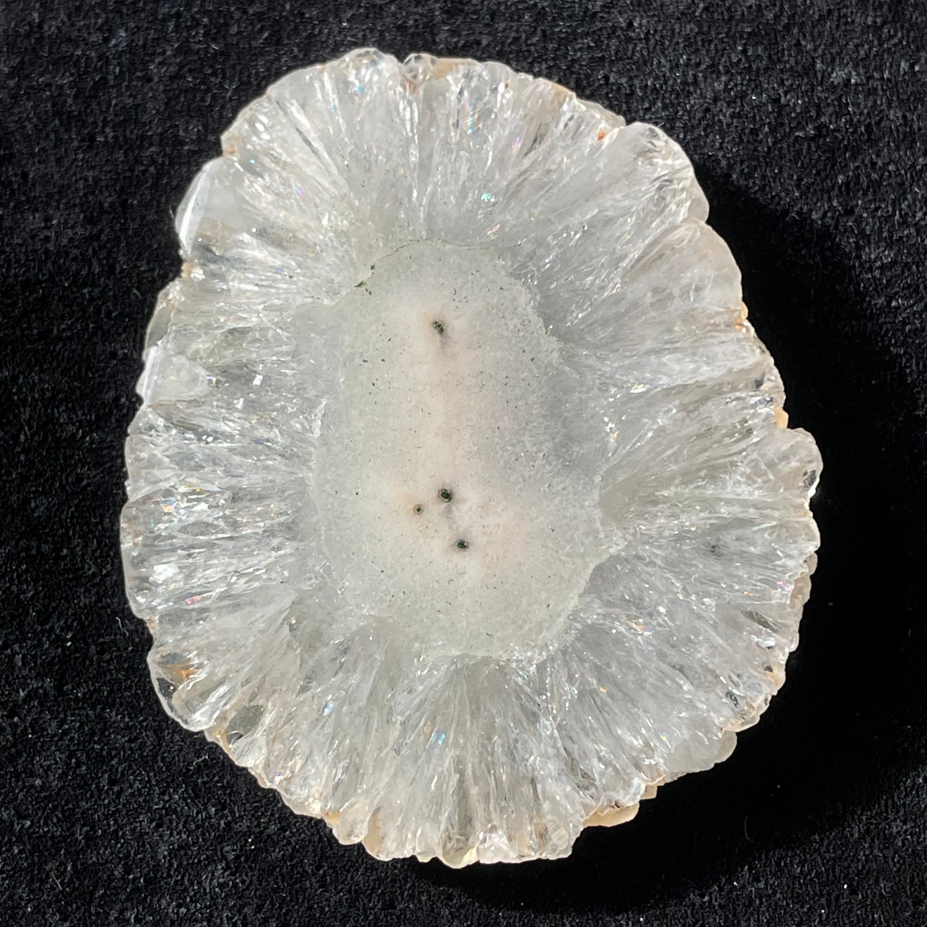 ソーラークォーツとはアゲートを核にクリスタルが放射線状に成長したもので、名前の由来は輪切りにすると太陽光線のように見えることからソーラークォーツと呼ばれています。その形を生かしてペンダントトップやジュエリーにも利用されています。