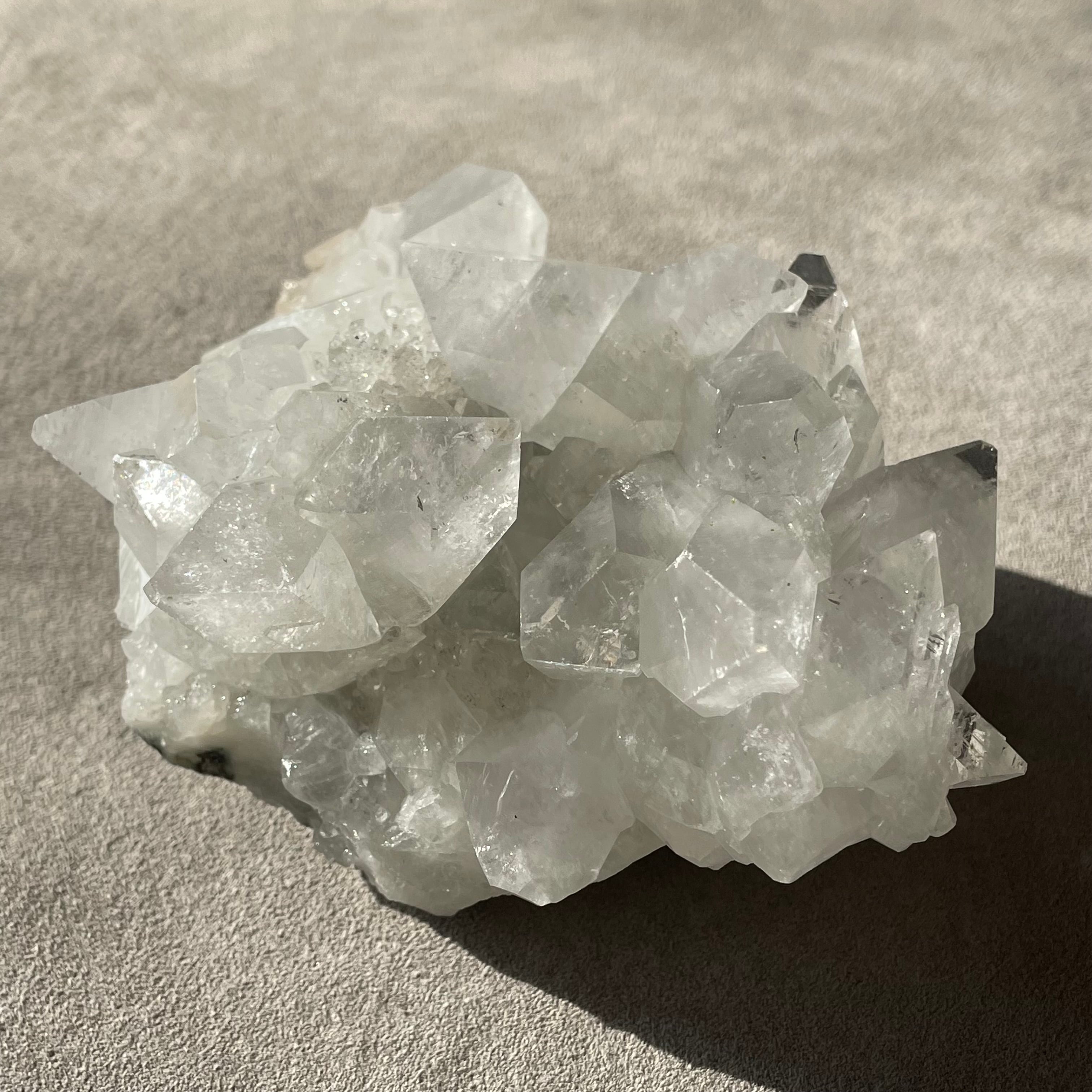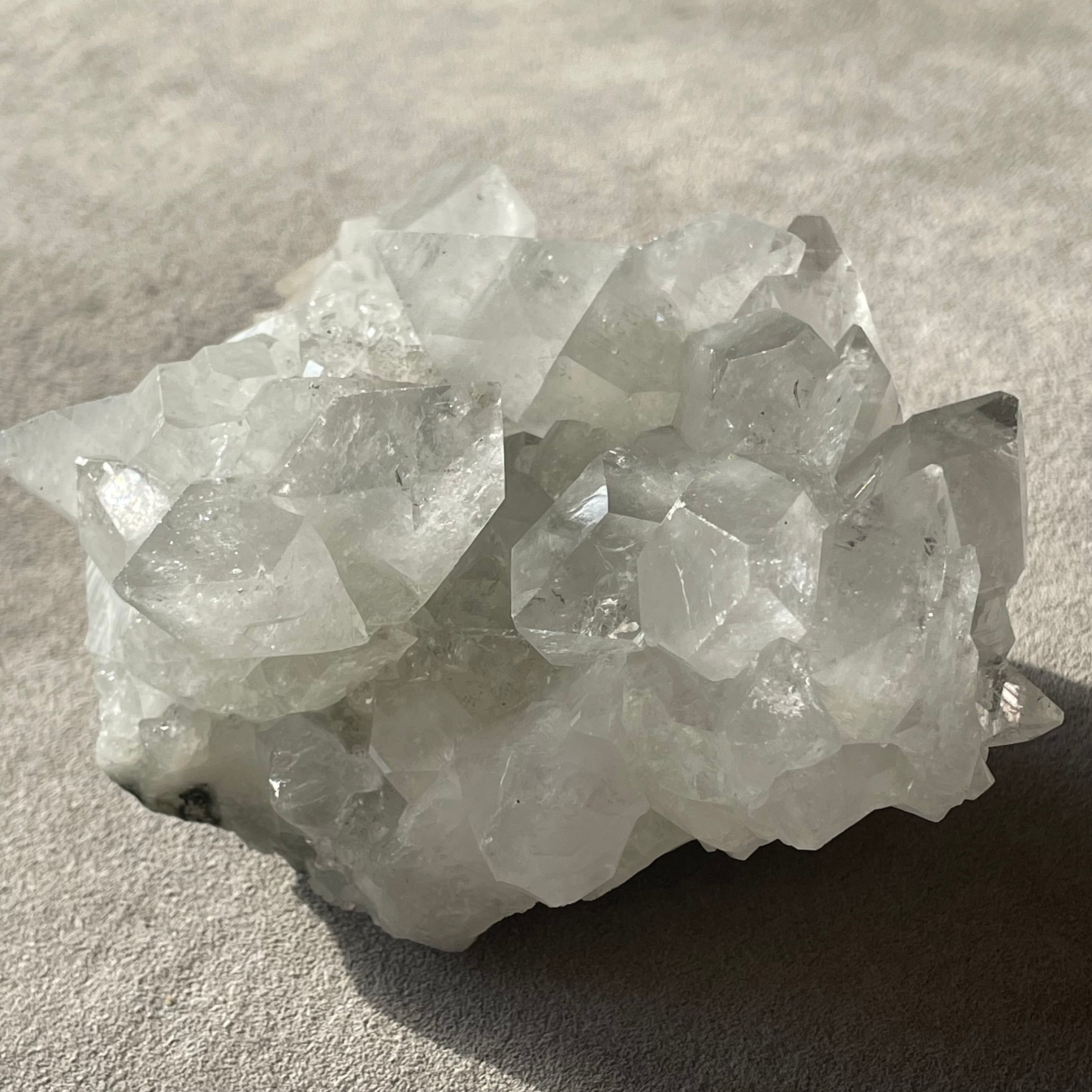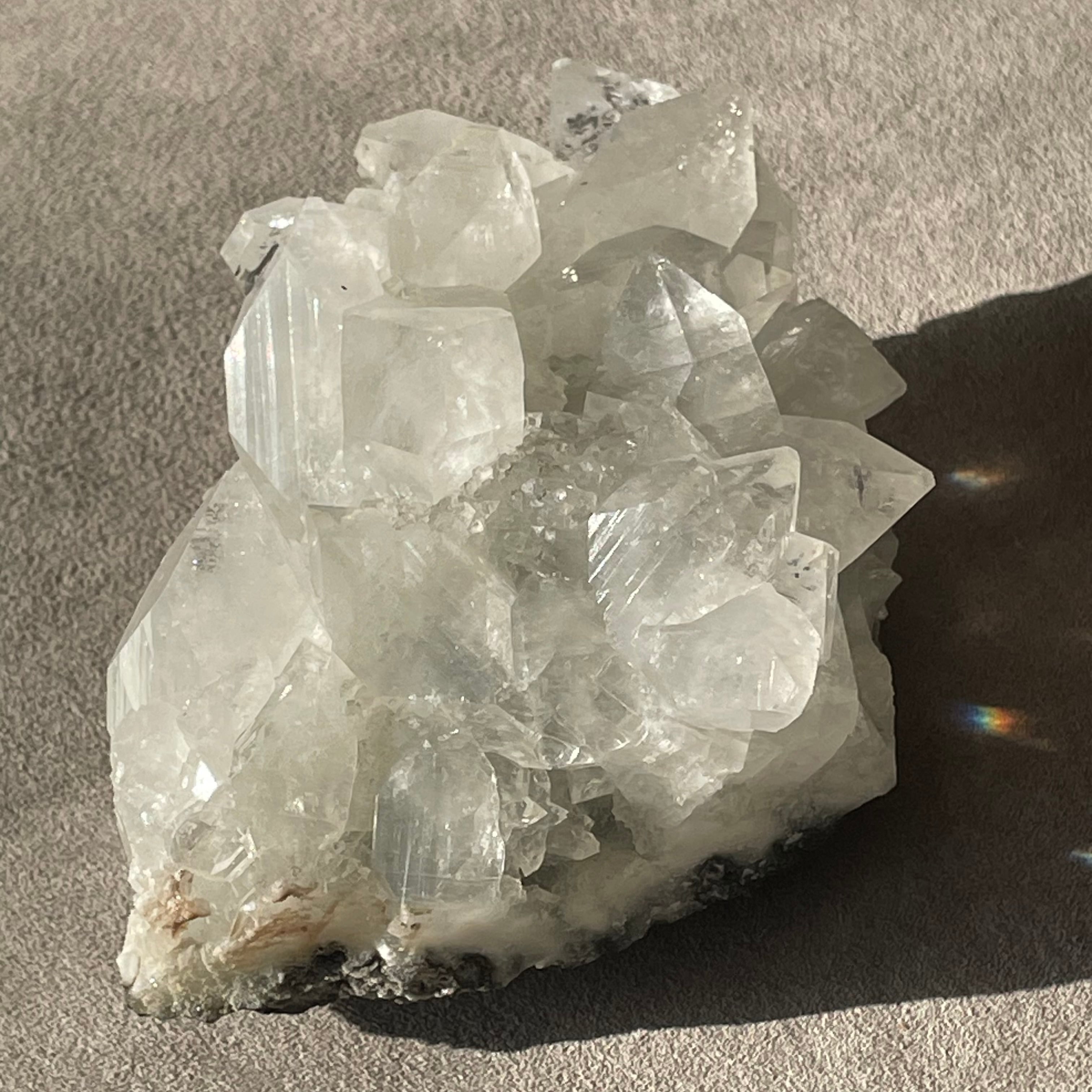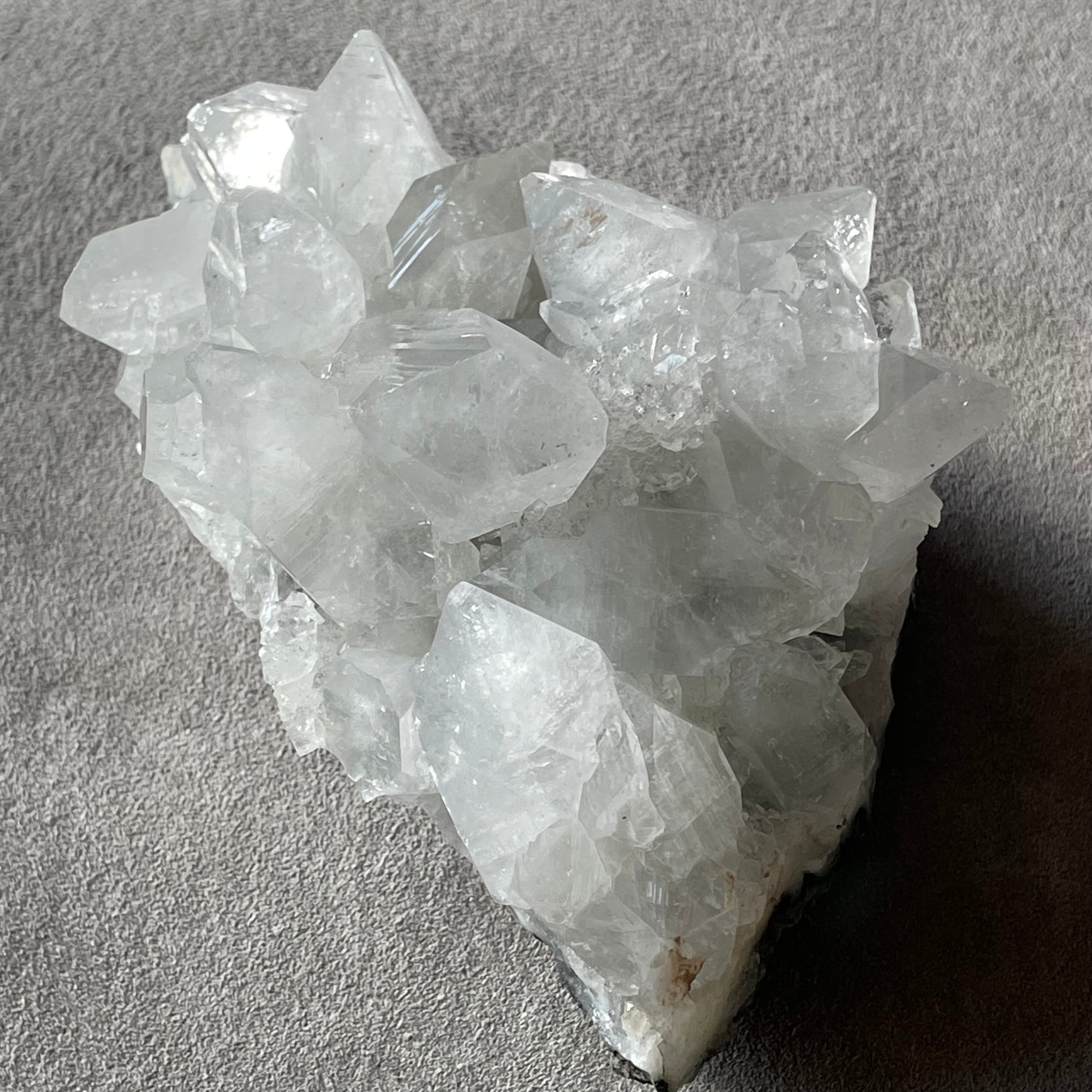 アポフィライトは世界各地で産出される石で、一見水晶に似ていますが輪切りにすると水晶は六角形であるのに対し、アポフィライトは四角形をしています。