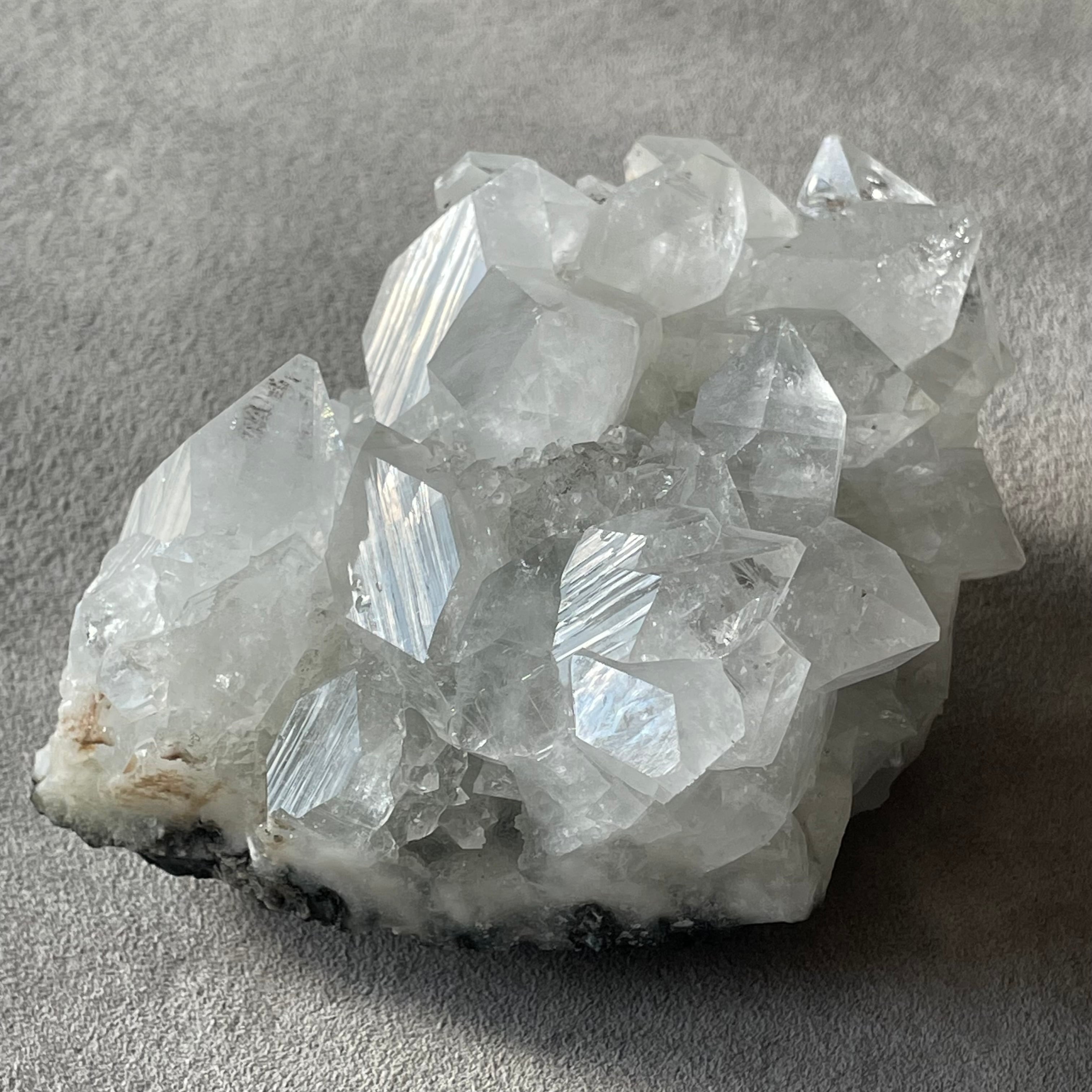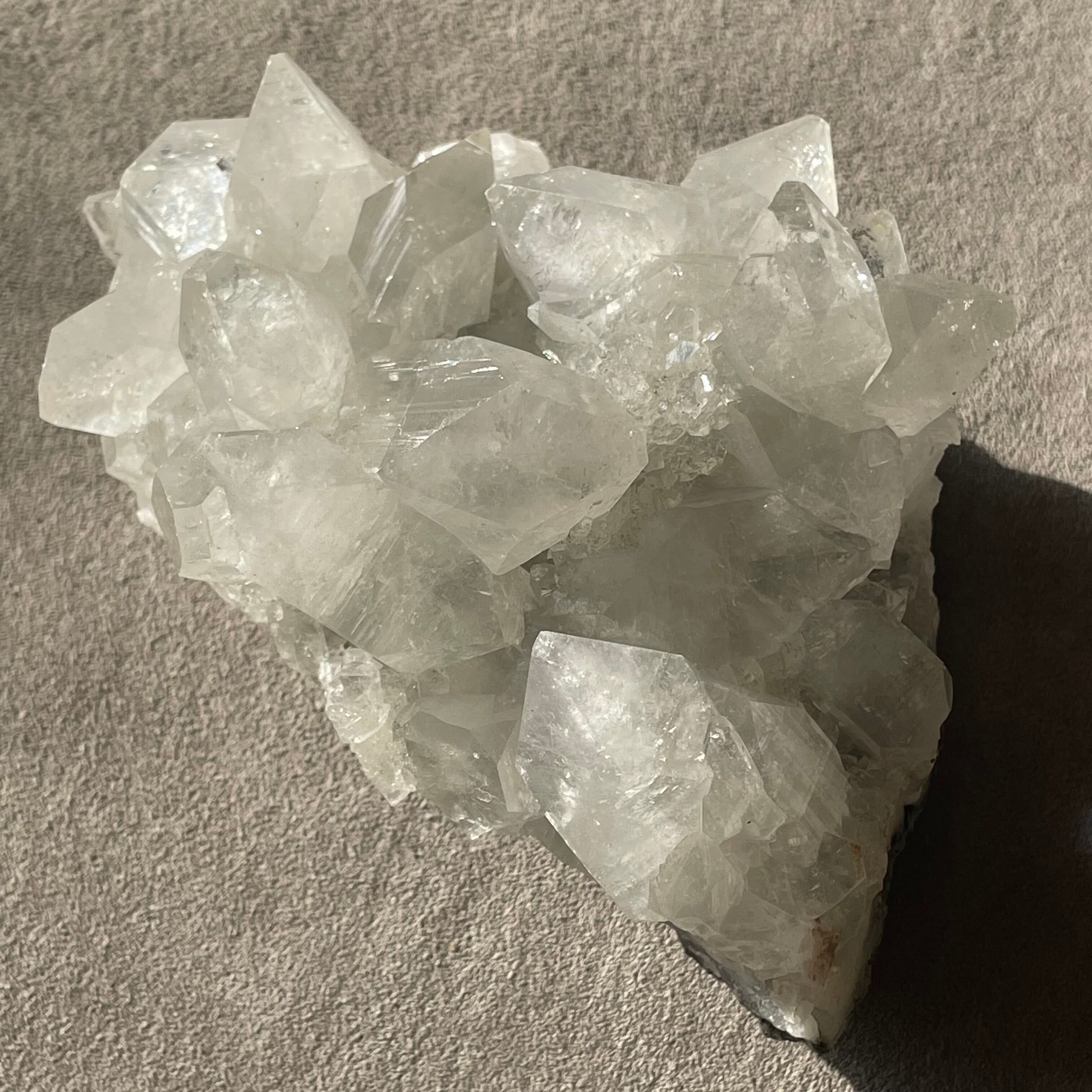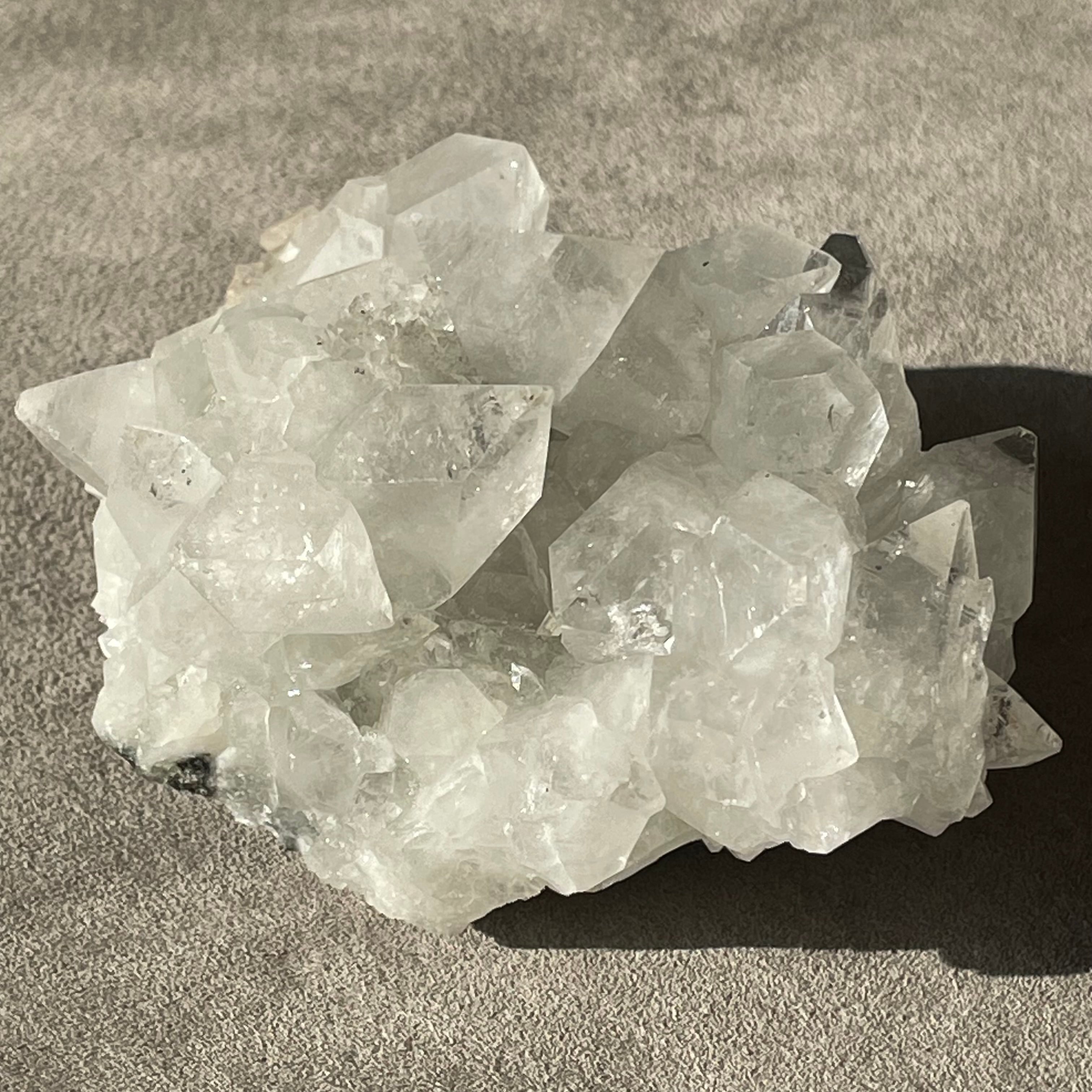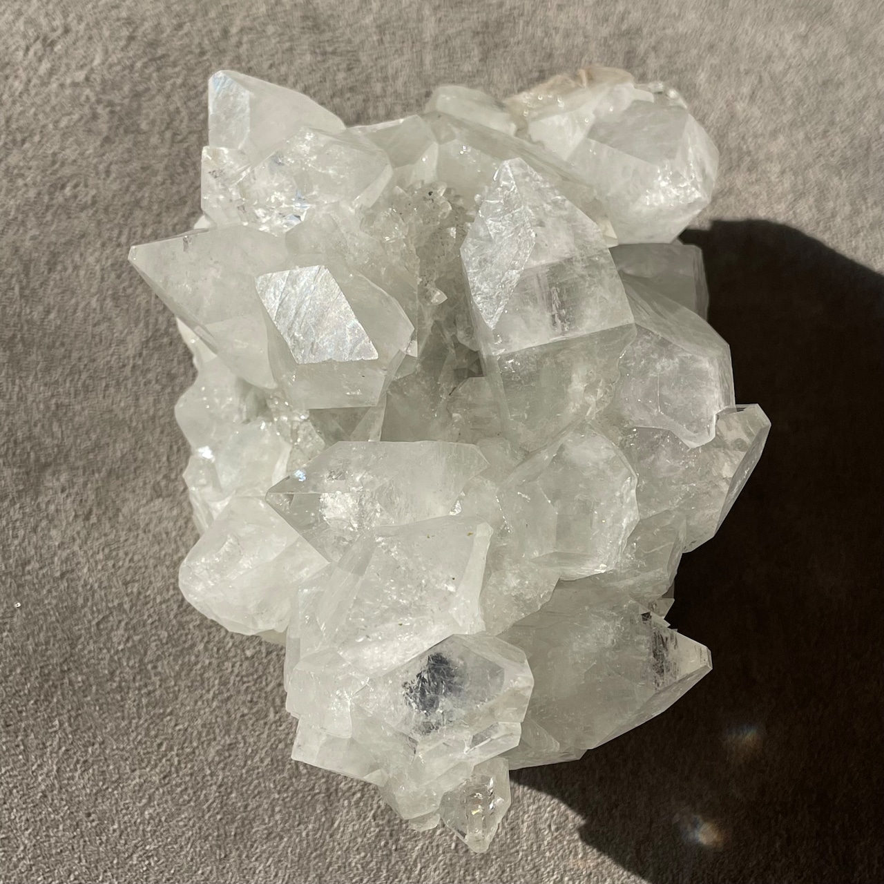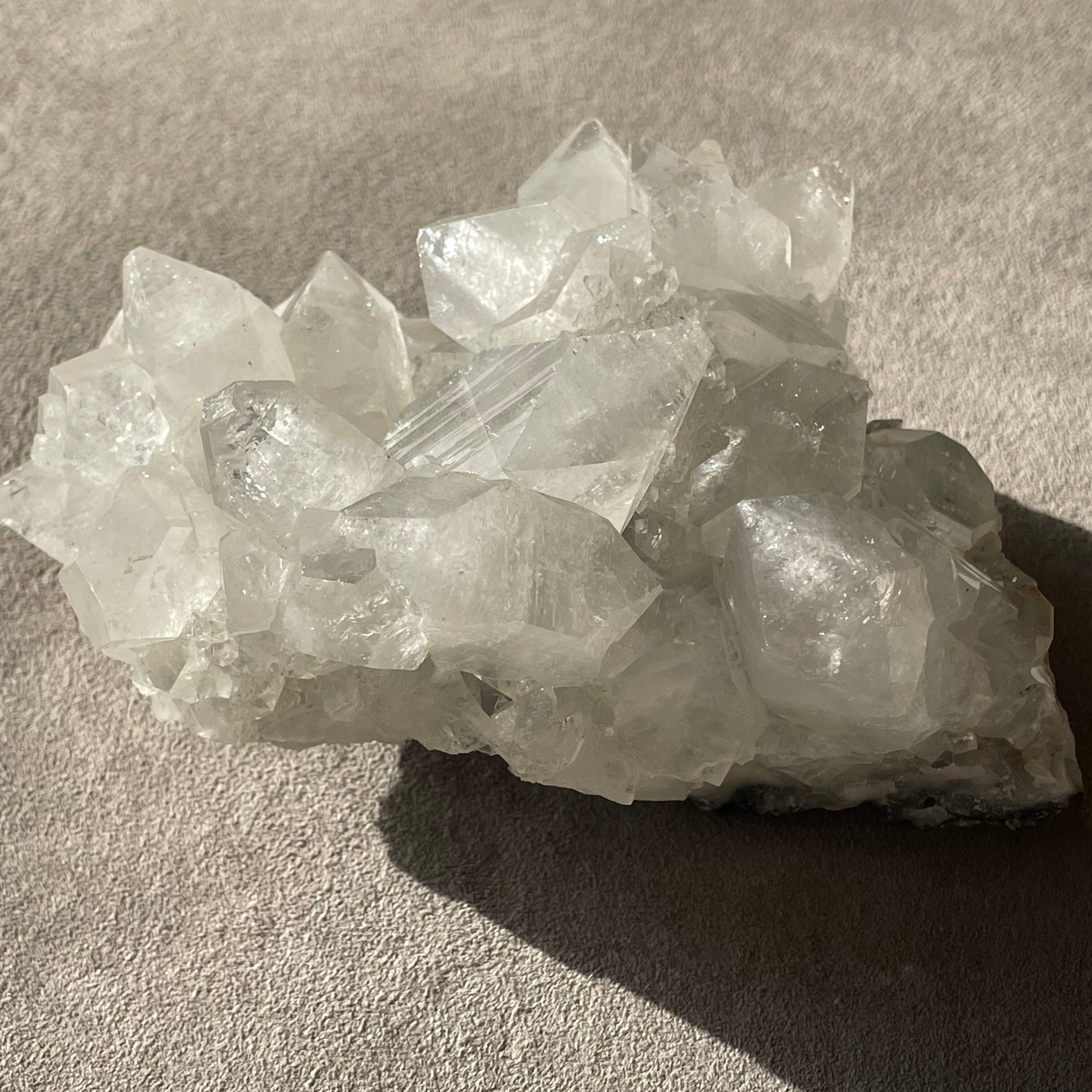 アポフィライトは世界各地で産出される石で、一見水晶に似ていますが輪切りにすると水晶は六角形であるのに対し、アポフィライトは四角形をしています。