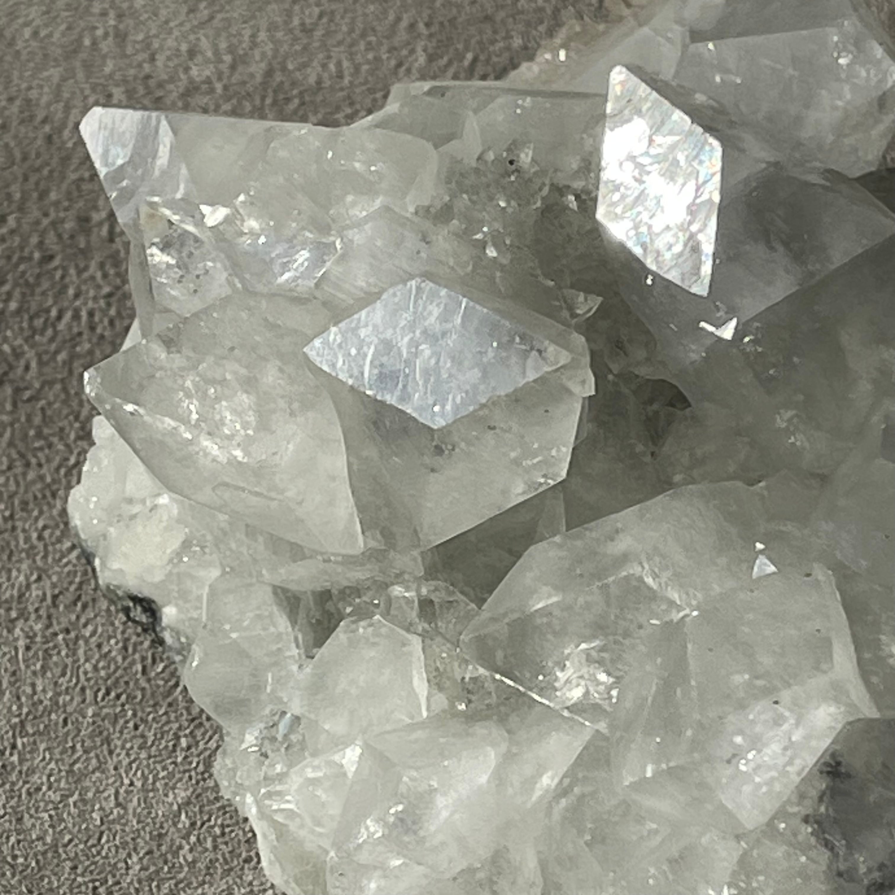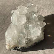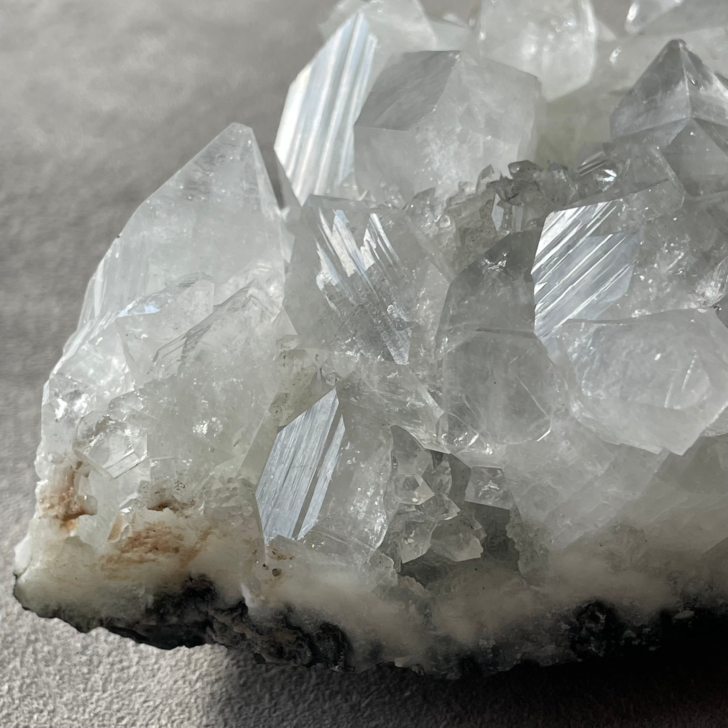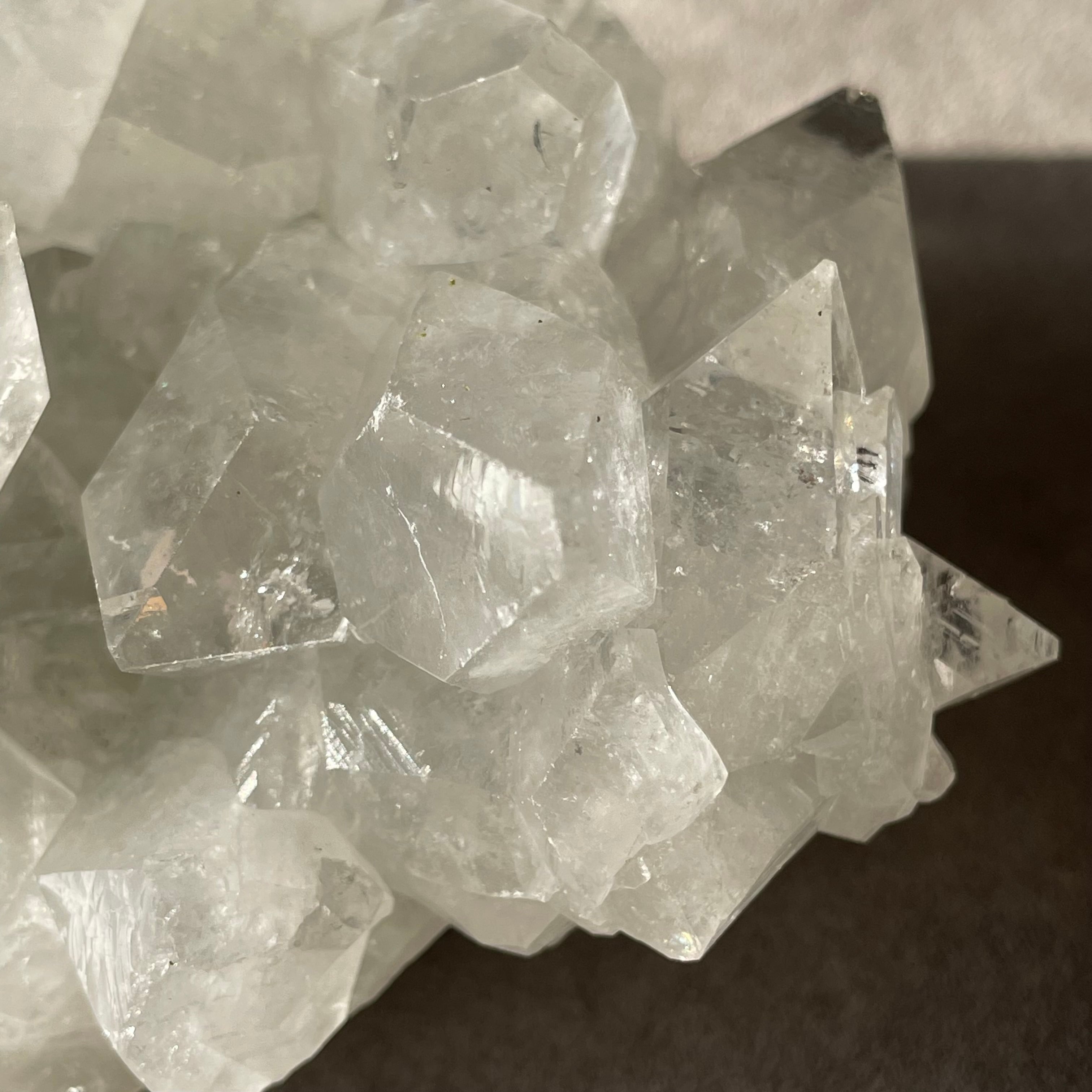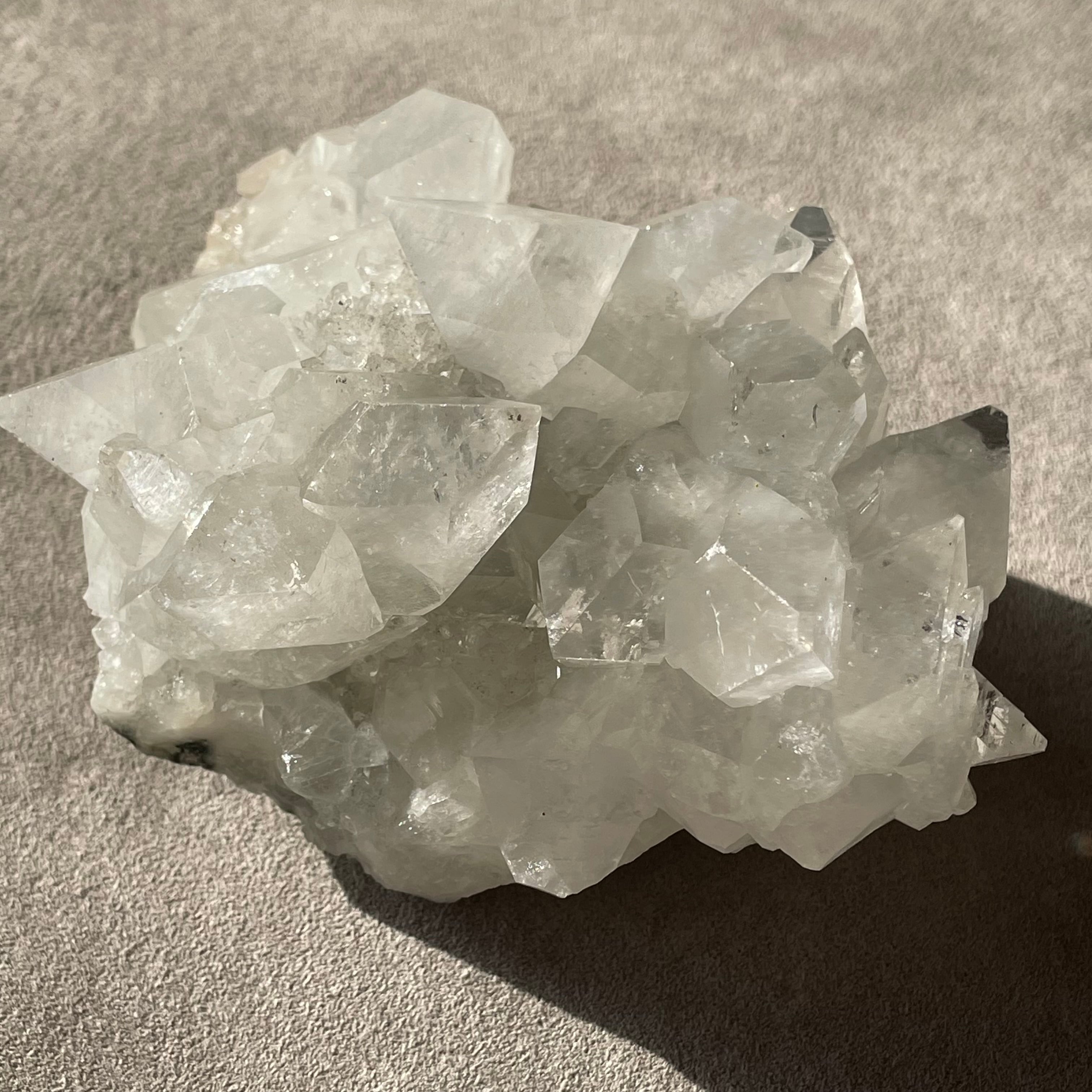 アポフィライトは世界各地で産出される石で、一見水晶に似ていますが輪切りにすると水晶は六角形であるのに対し、アポフィライトは四角形をしています。