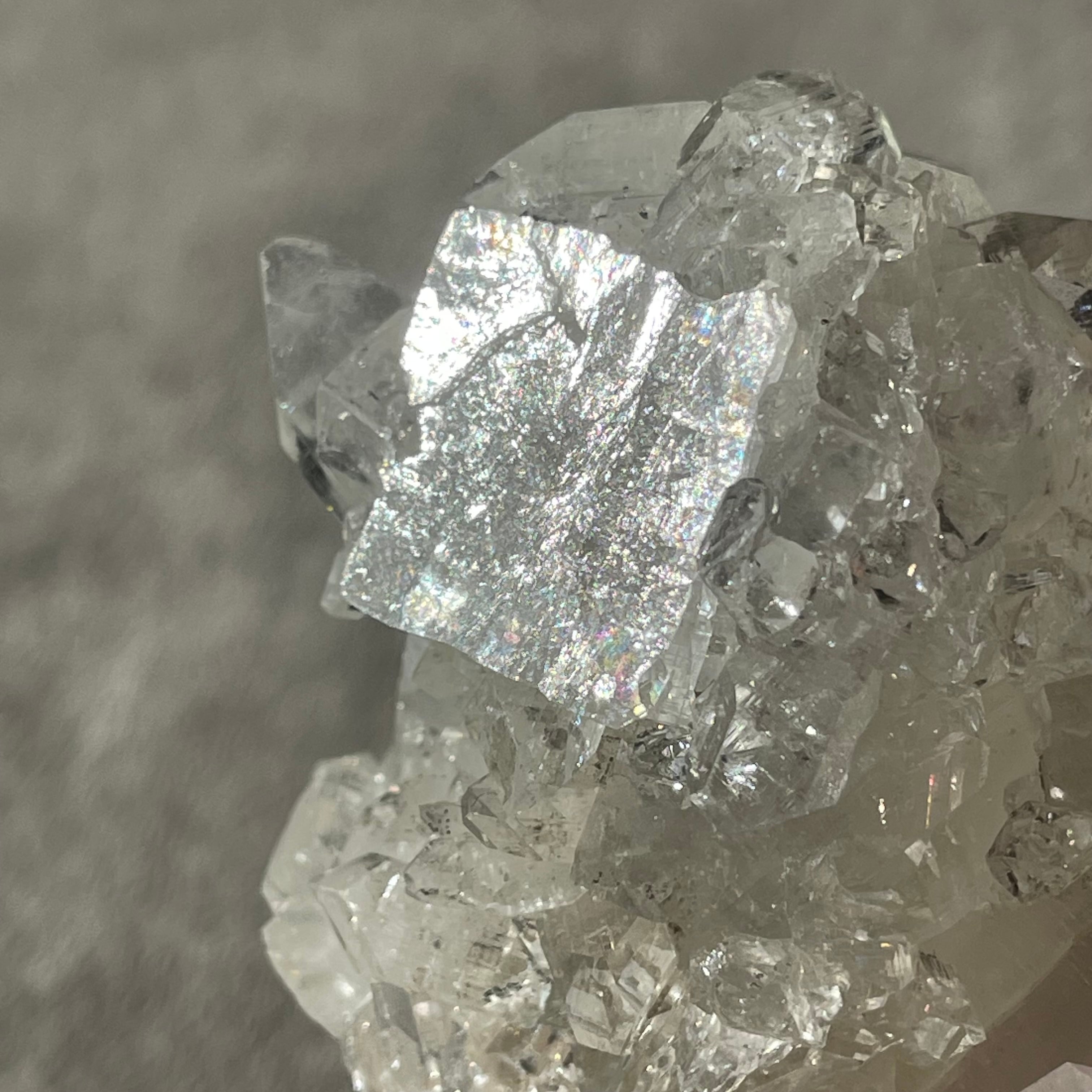 四角いキューブ状の結晶断面には真珠のような輝きが現れます。レインボーも数カ所楽しめるキュートな原石です。