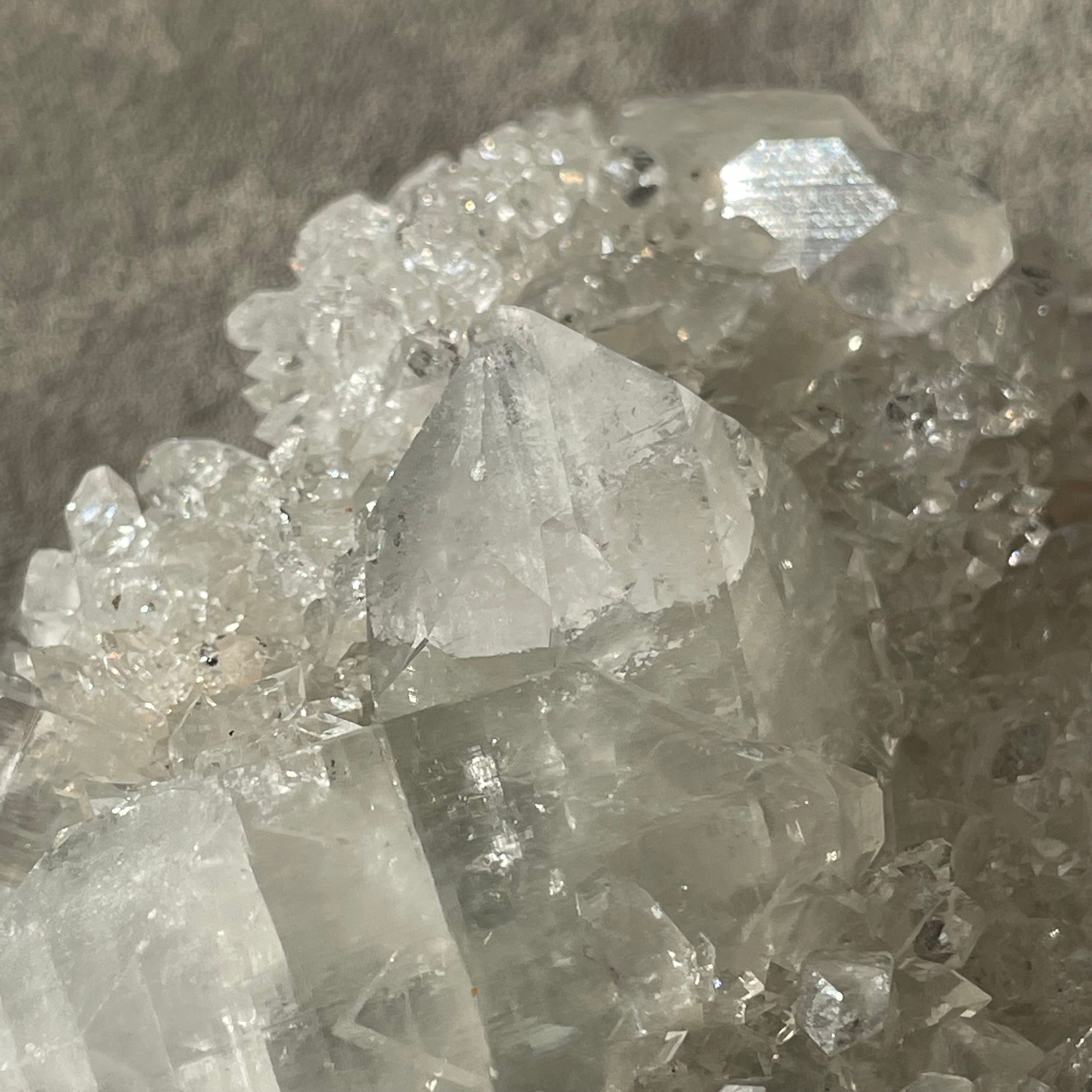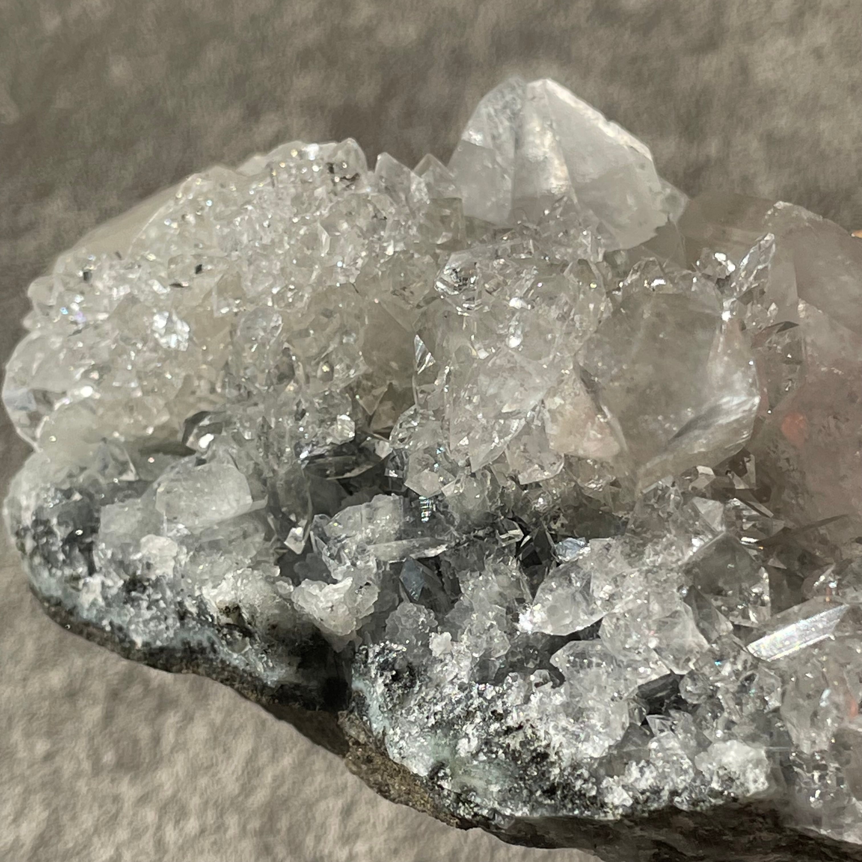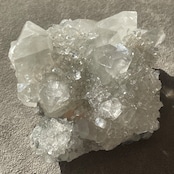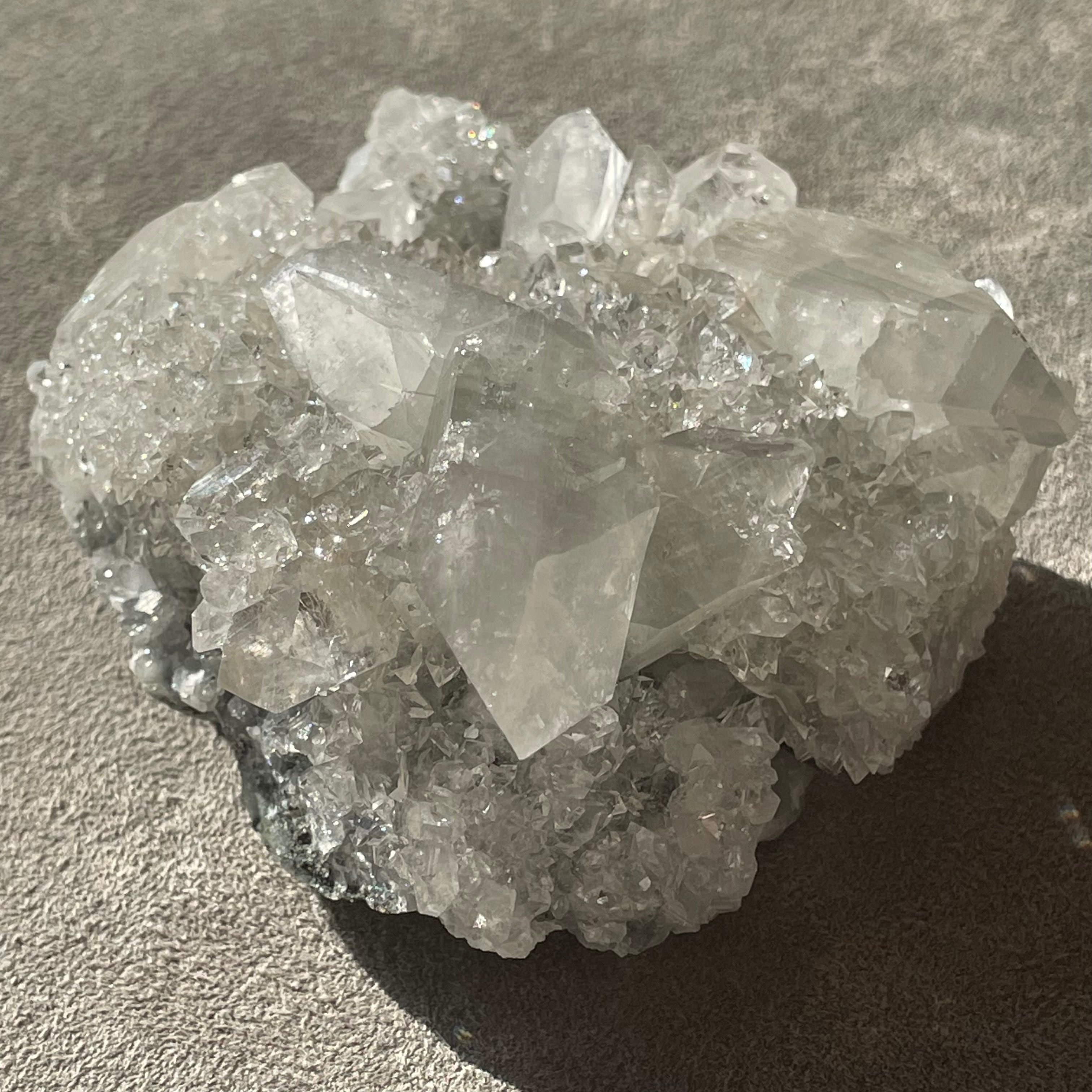 アポフィライトは世界各地で産出される石で、一見水晶に似ていますが輪切りにすると水晶は六角形であるのに対し、アポフィライトは四角形をしています。