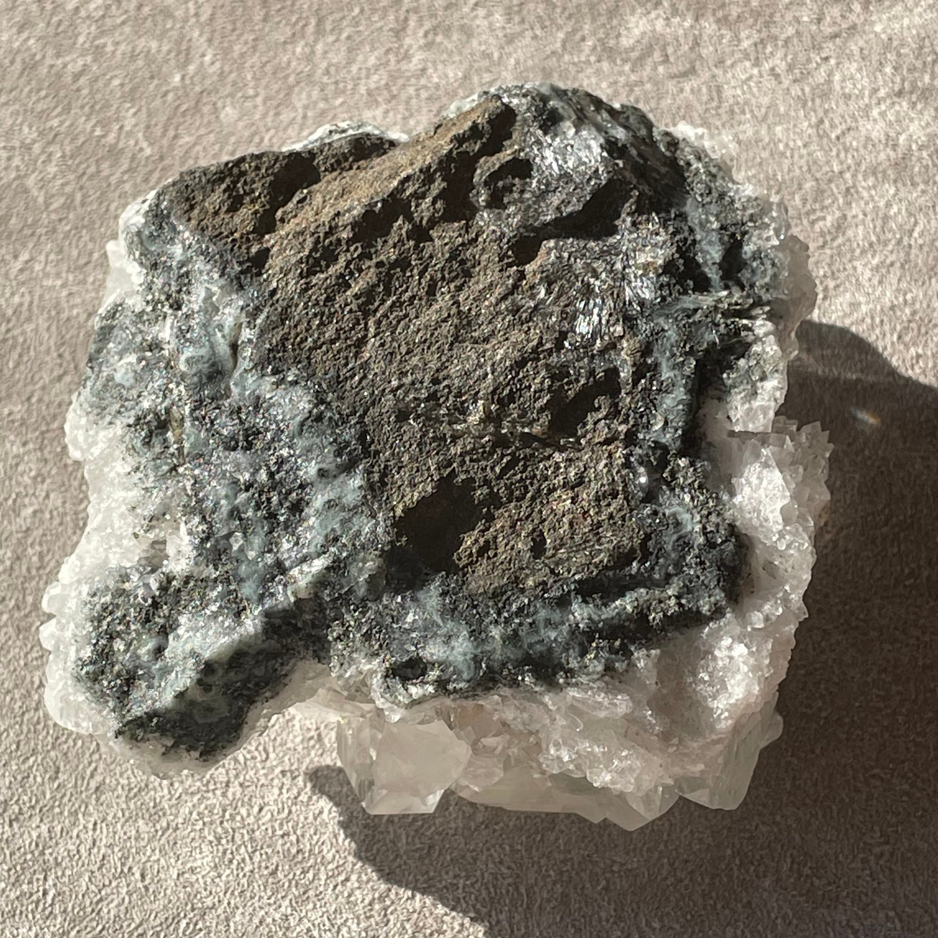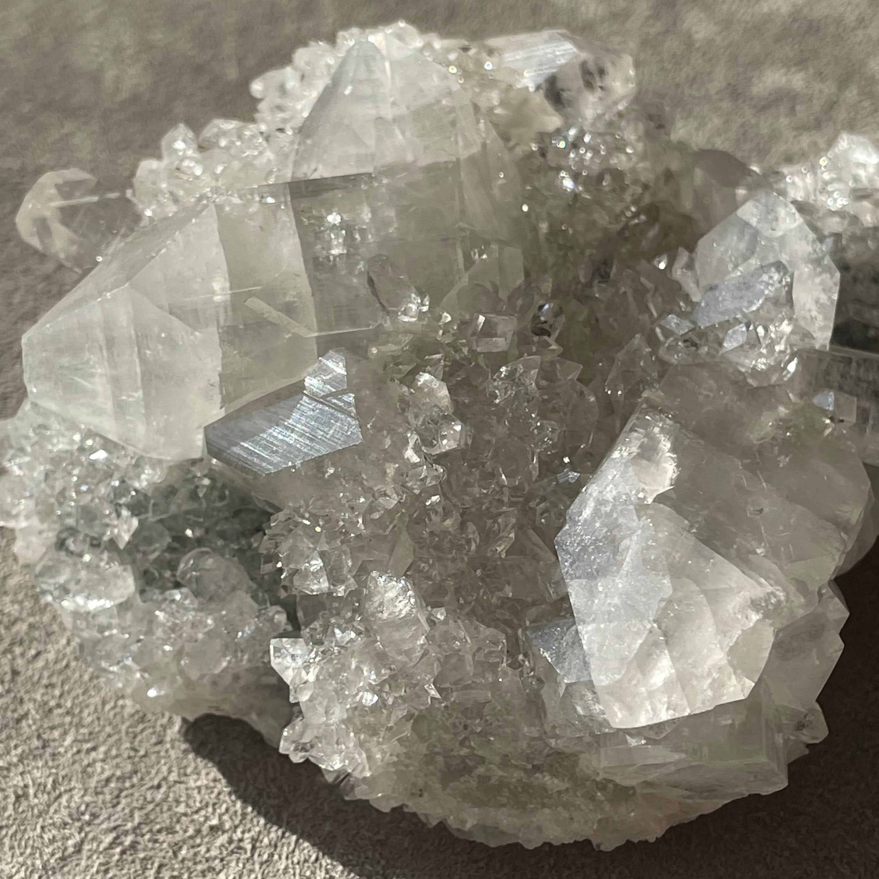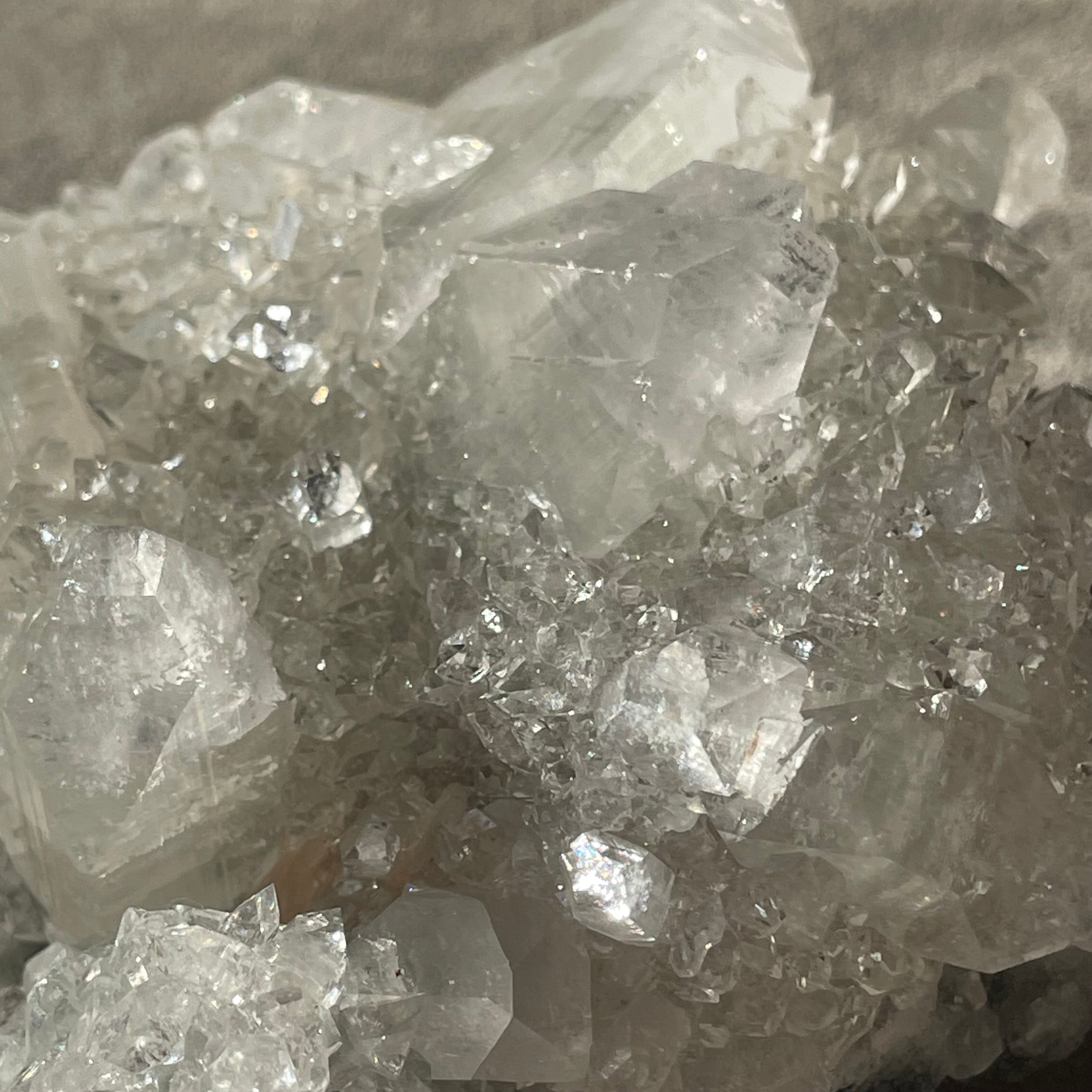 アポフィライトは世界各地で産出される石で、一見水晶に似ていますが輪切りにすると水晶は六角形であるのに対し、アポフィライトは四角形をしています。