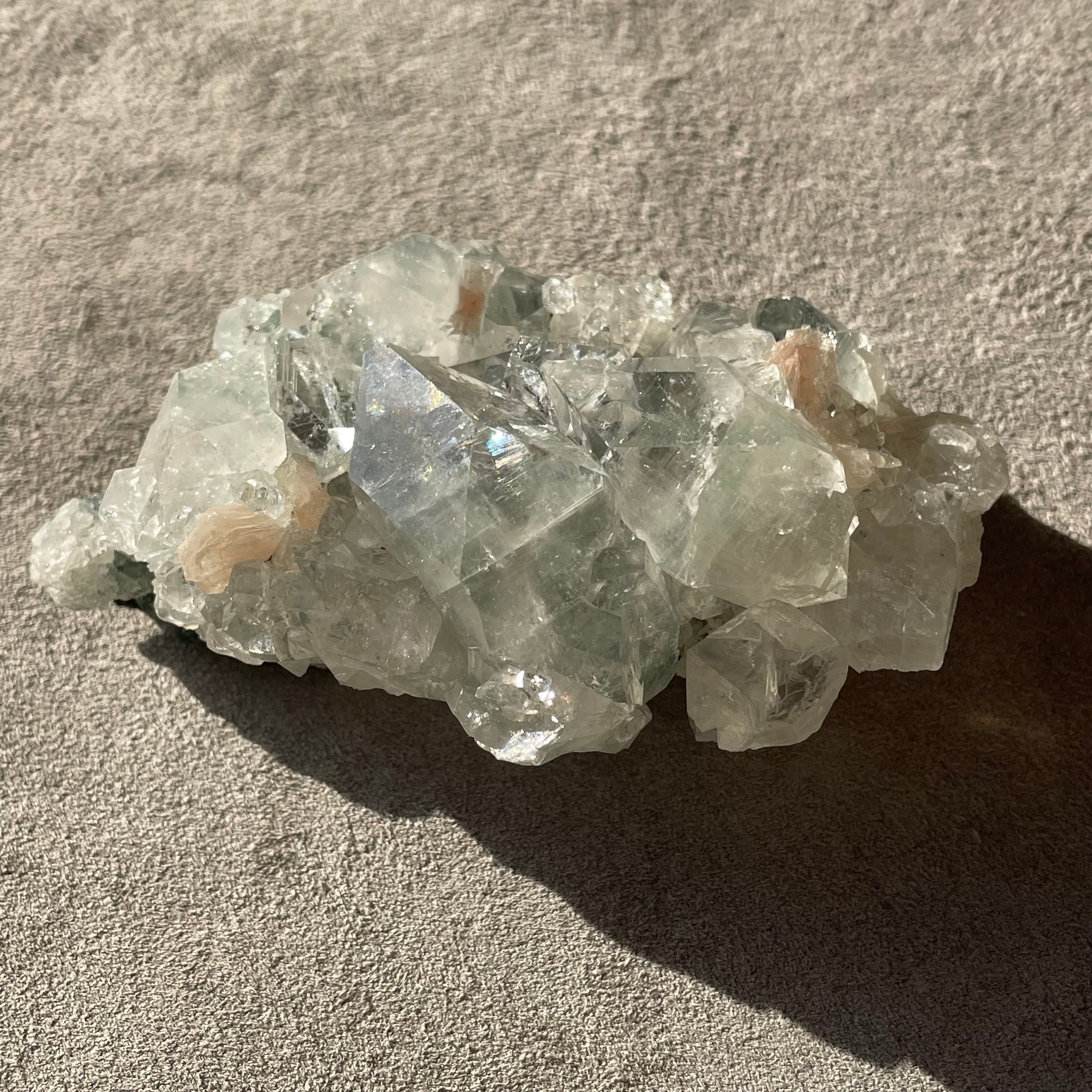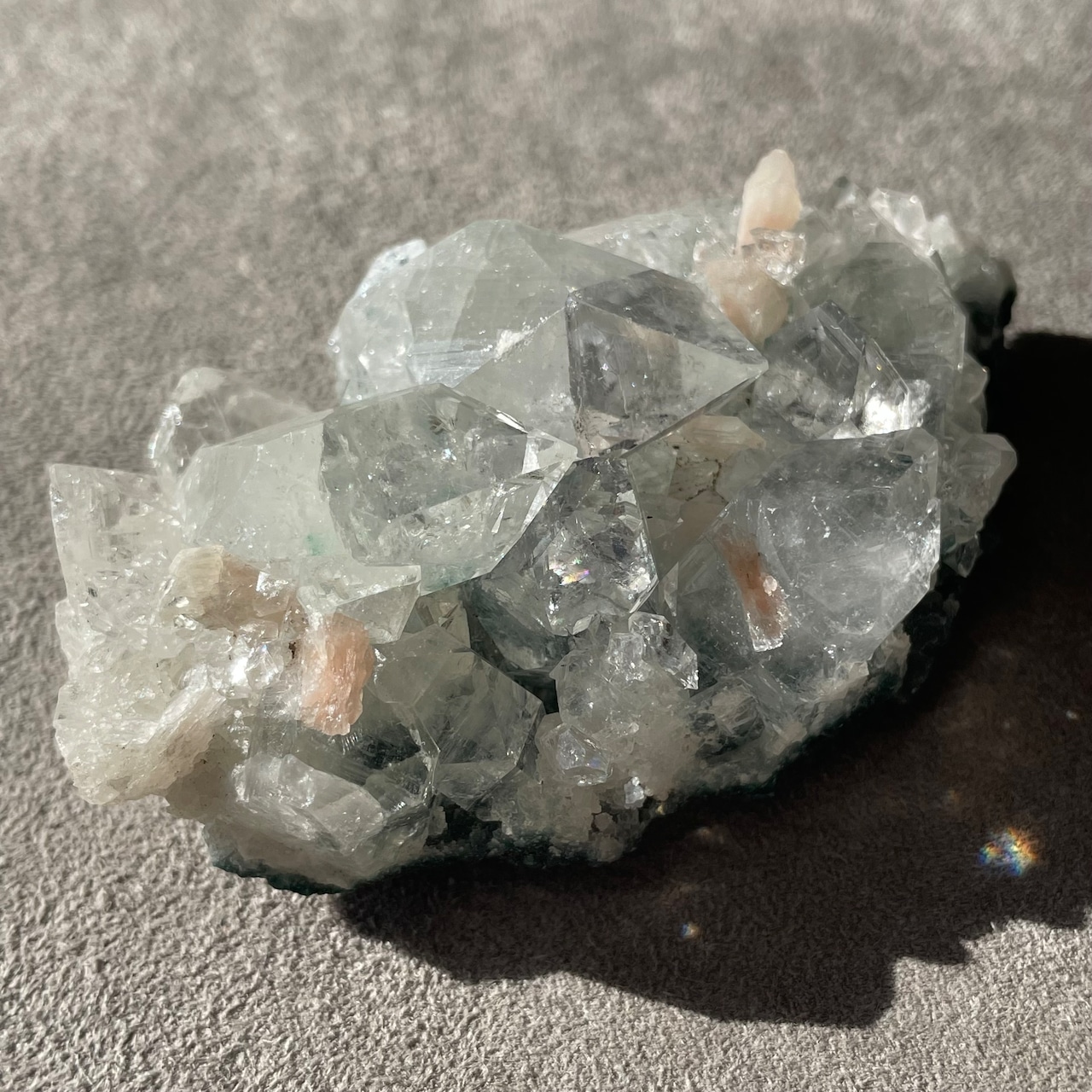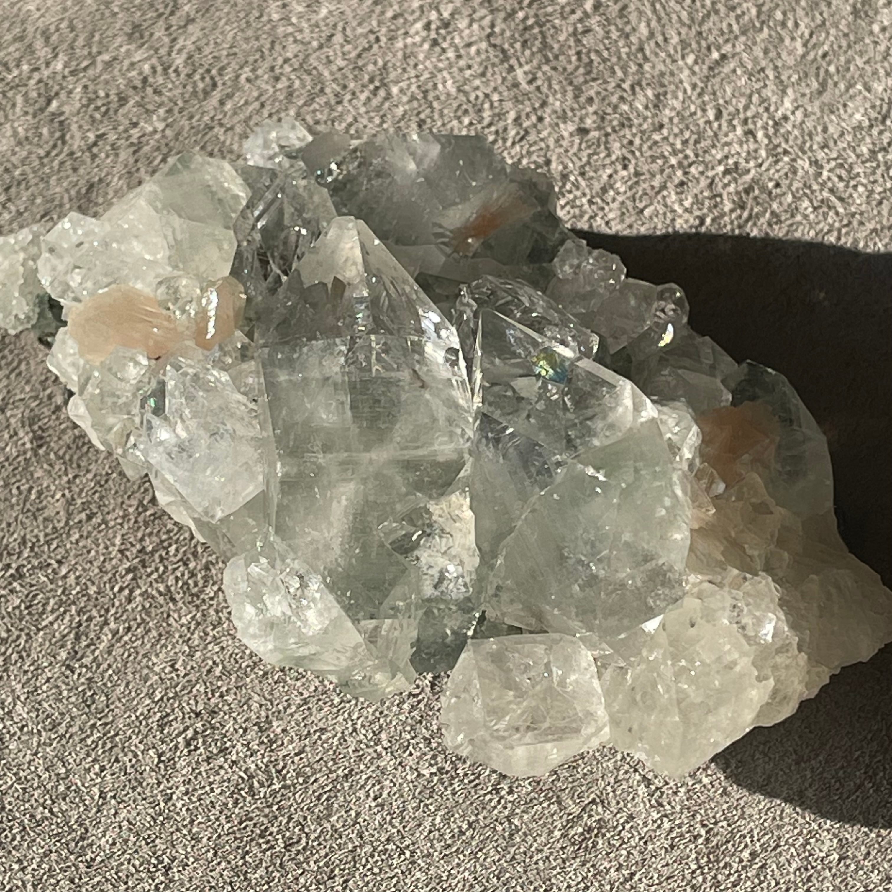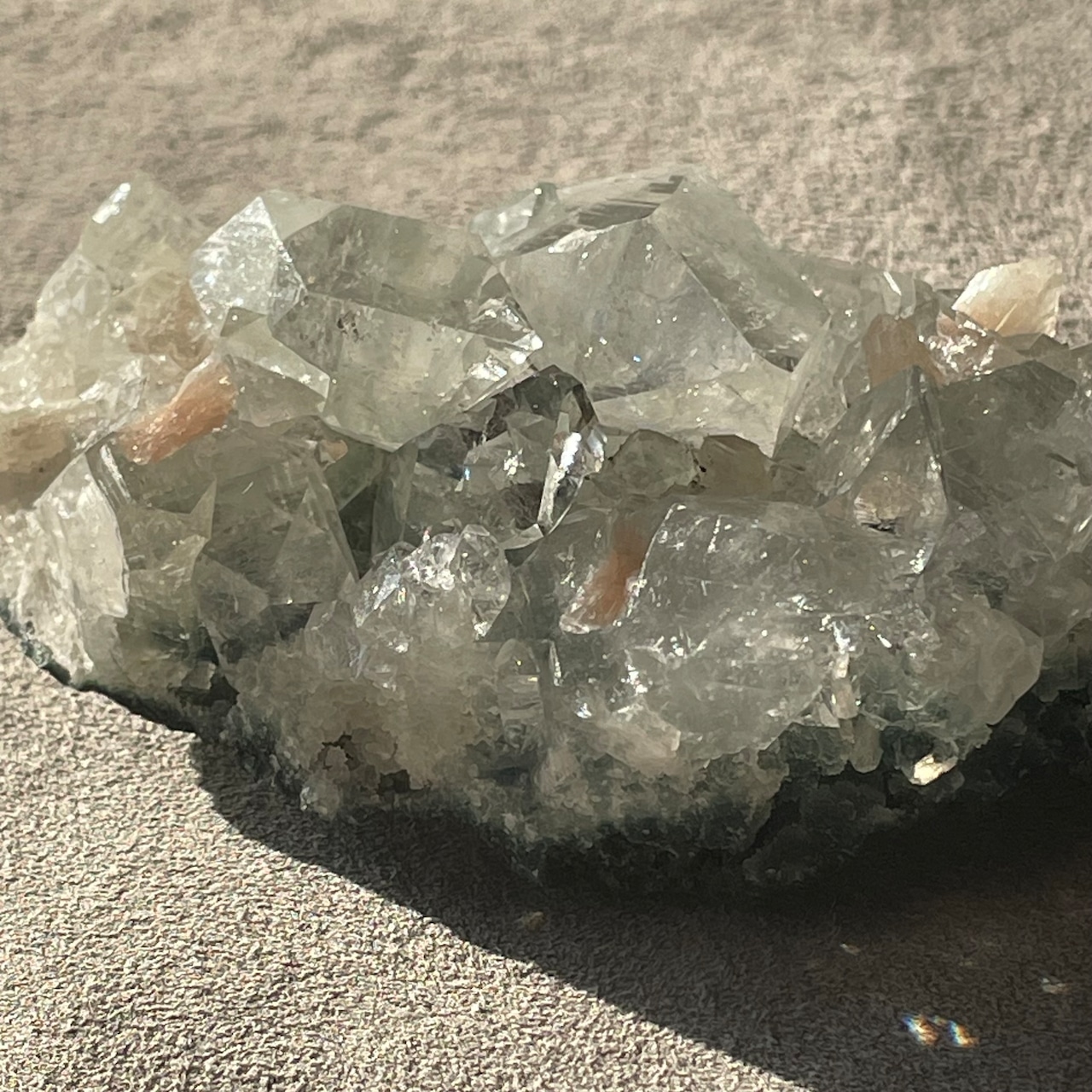 アポフィライトは世界各地で産出される石で、一見水晶に似ていますが輪切りにすると水晶は六角形であるのに対し、アポフィライトは四角形をしています。