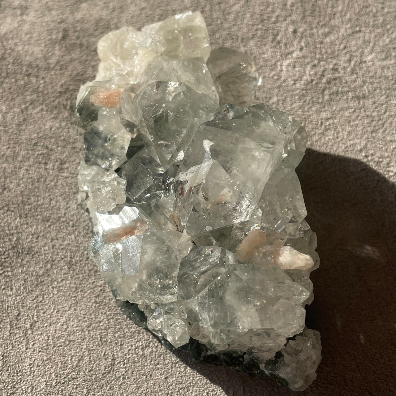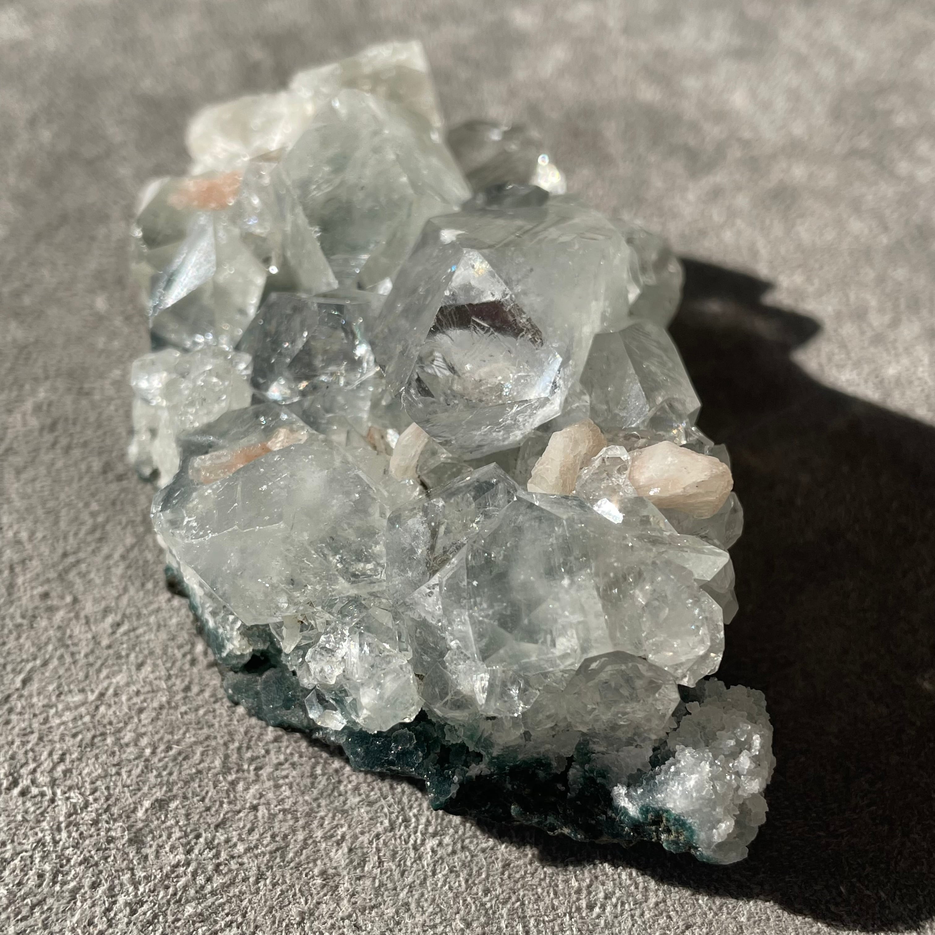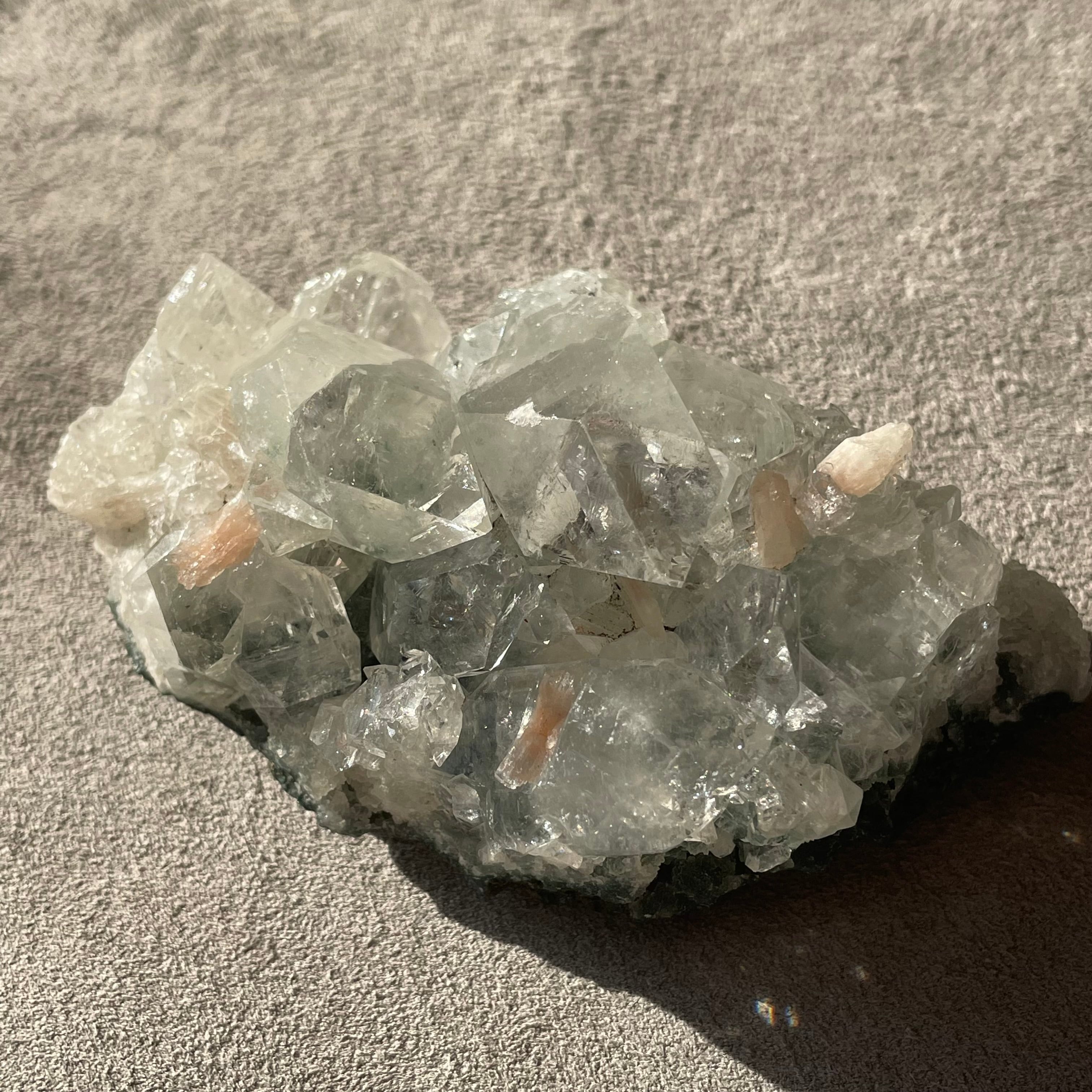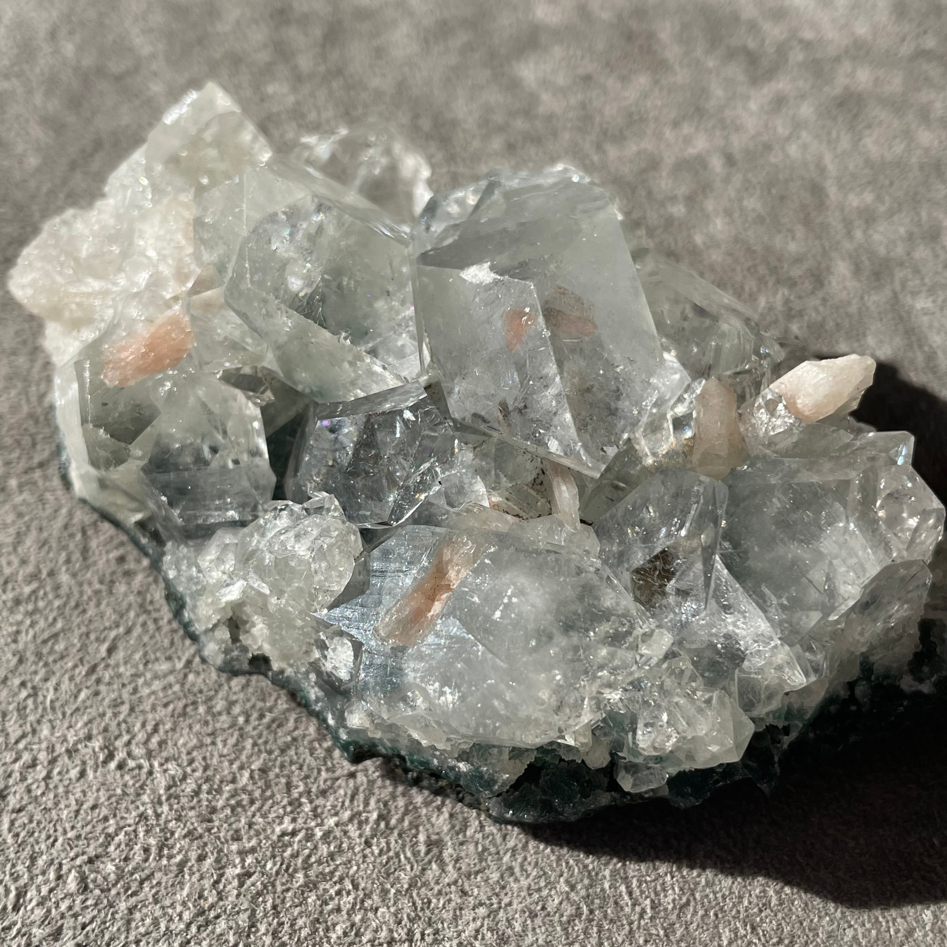 アポフィライトは世界各地で産出される石で、一見水晶に似ていますが輪切りにすると水晶は六角形であるのに対し、アポフィライトは四角形をしています。