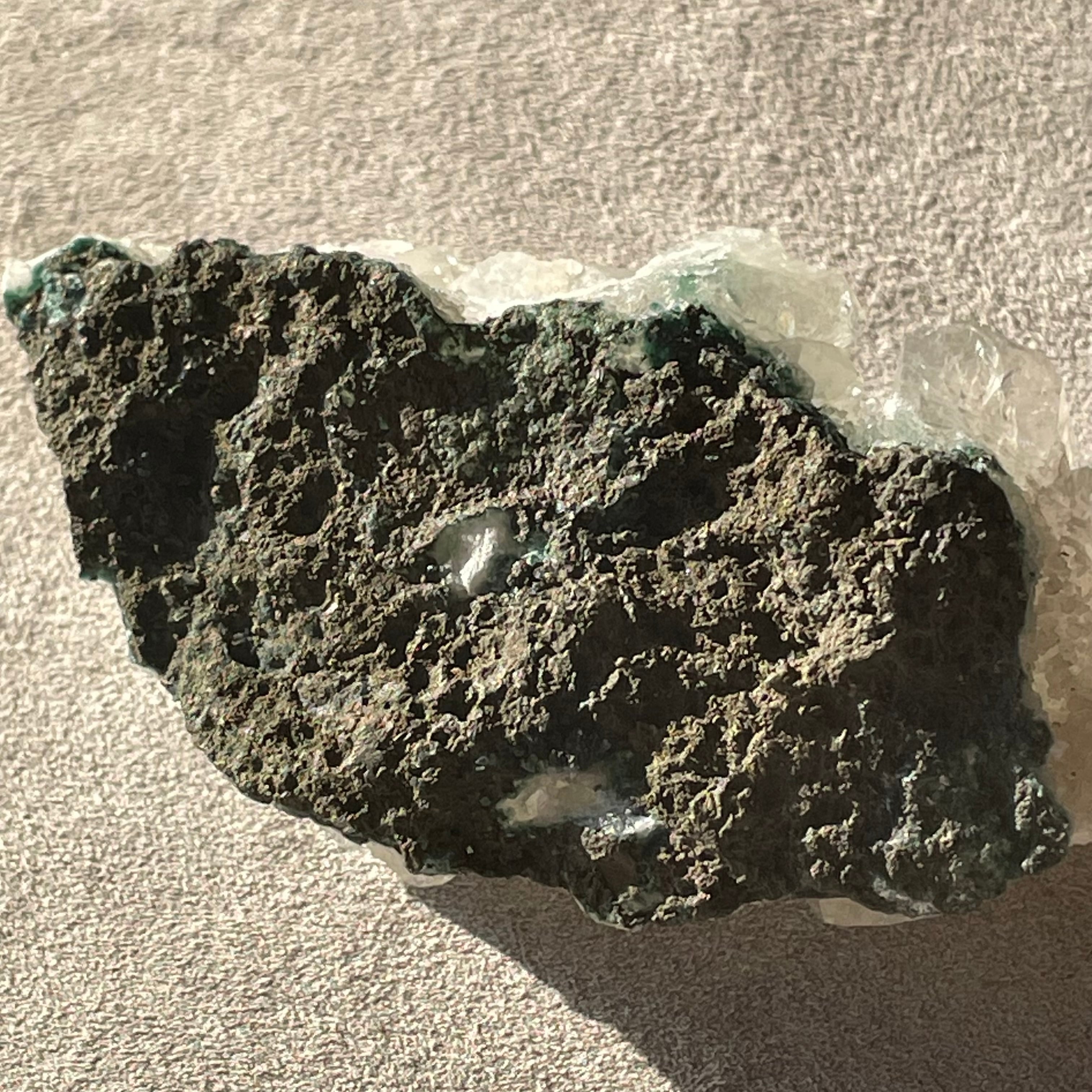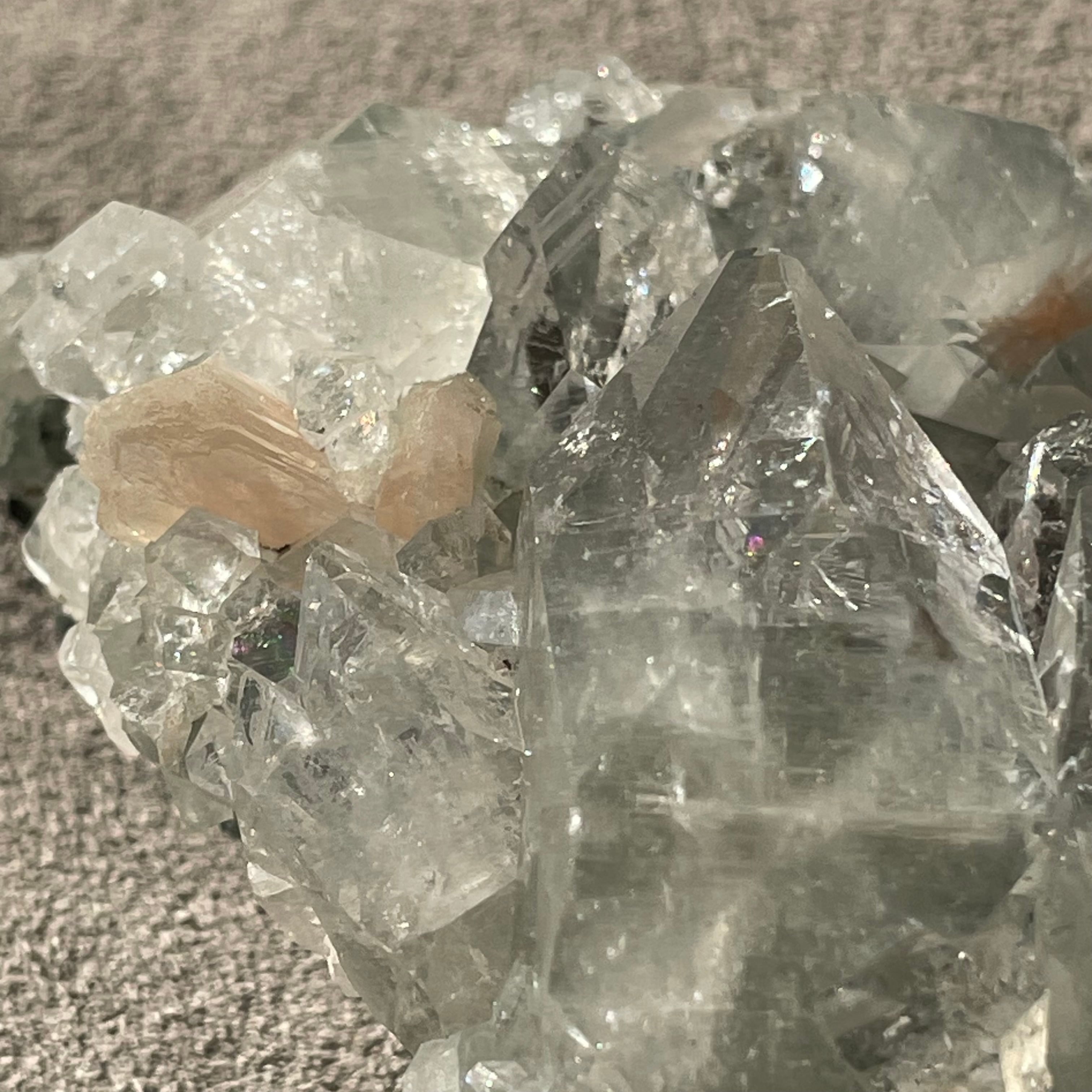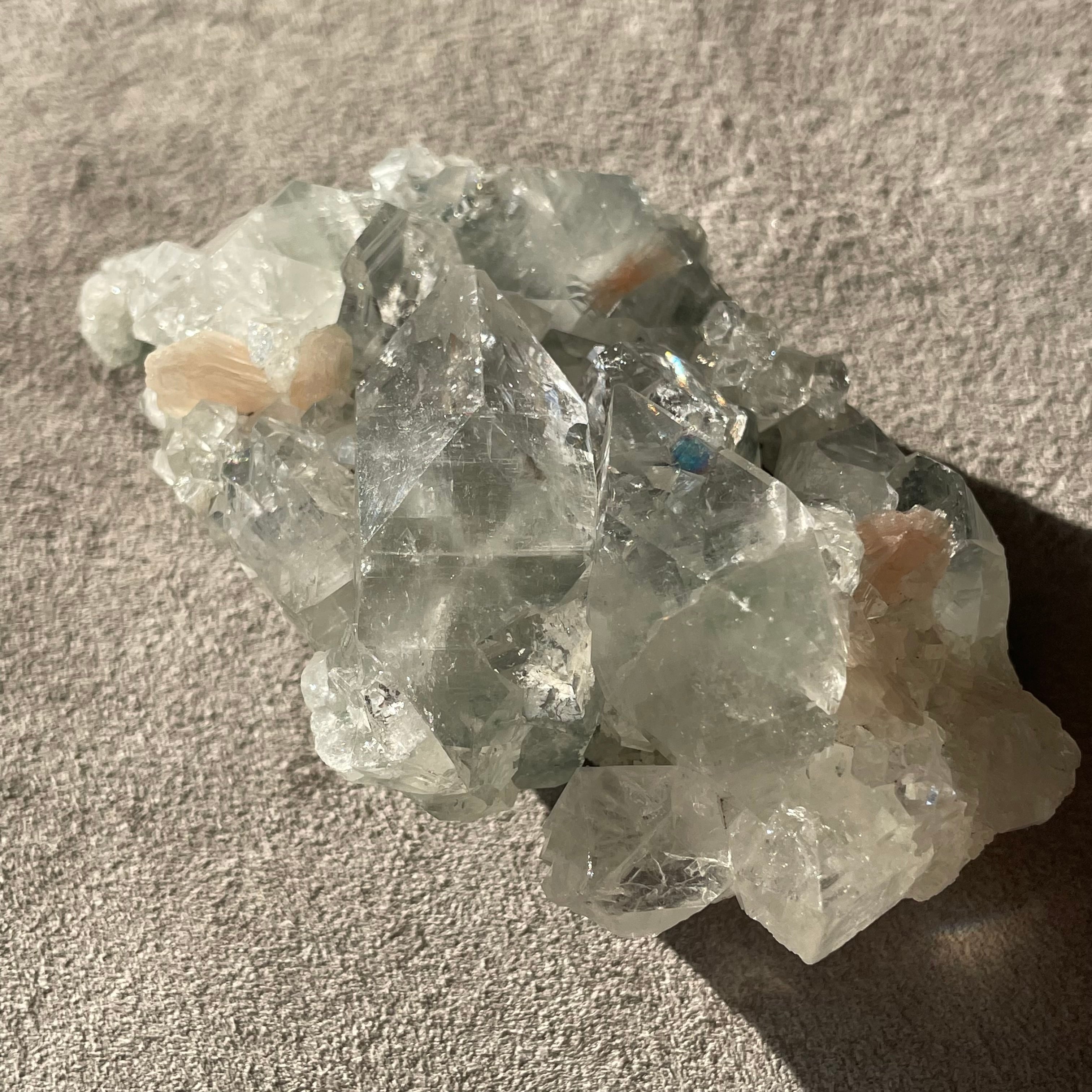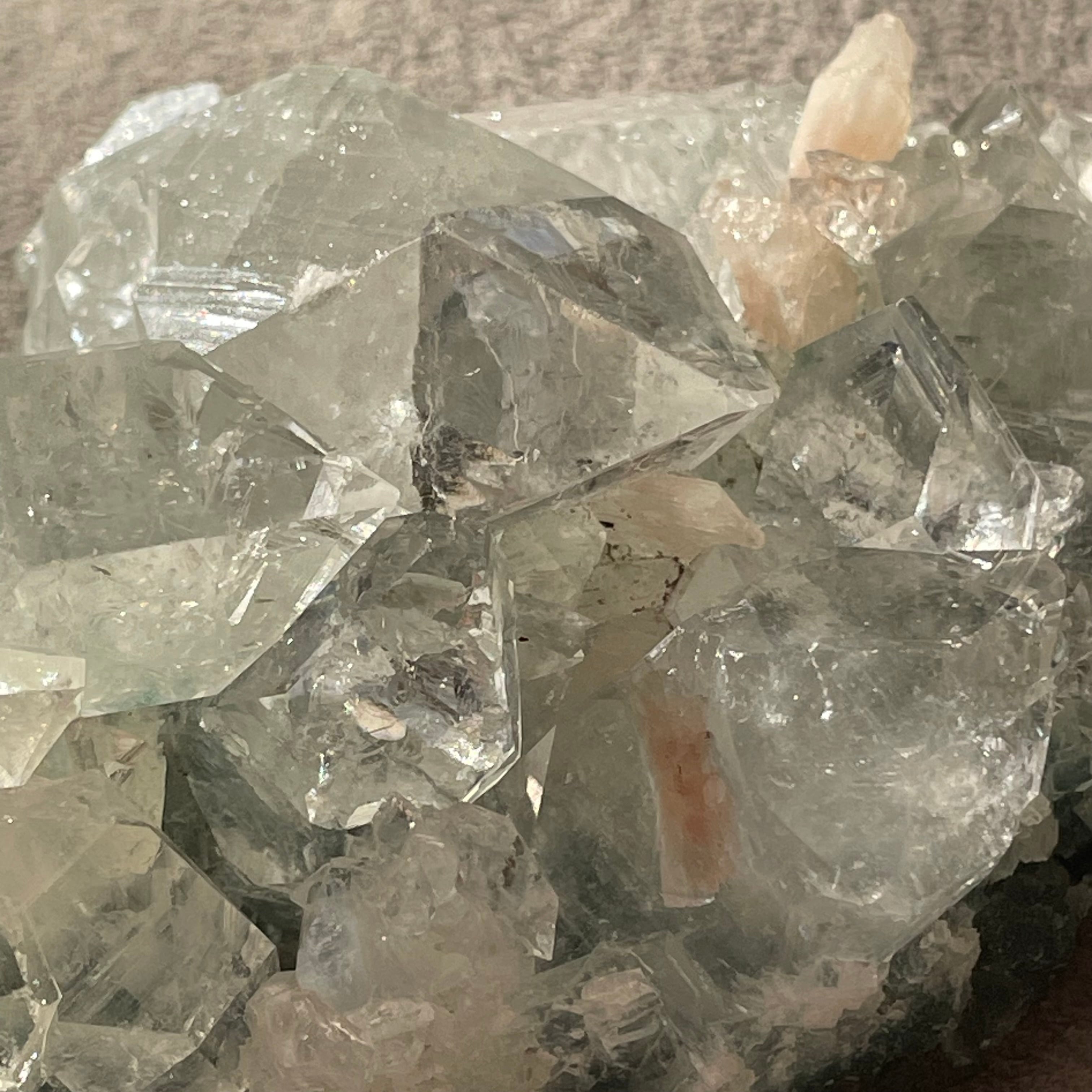 アポフィライトは世界各地で産出される石で、一見水晶に似ていますが輪切りにすると水晶は六角形であるのに対し、アポフィライトは四角形をしています。