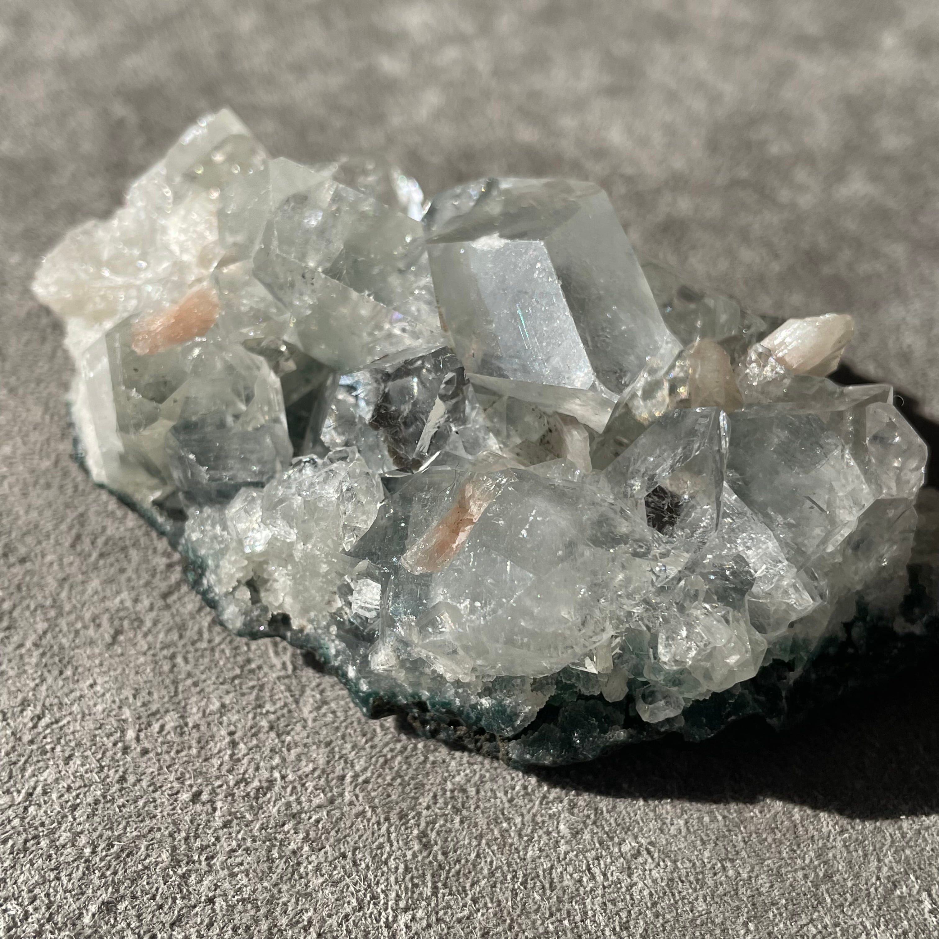 薄い母岩にクリアな結晶が密集して、随所にダイヤ面が綺麗に出ているのが見られます。