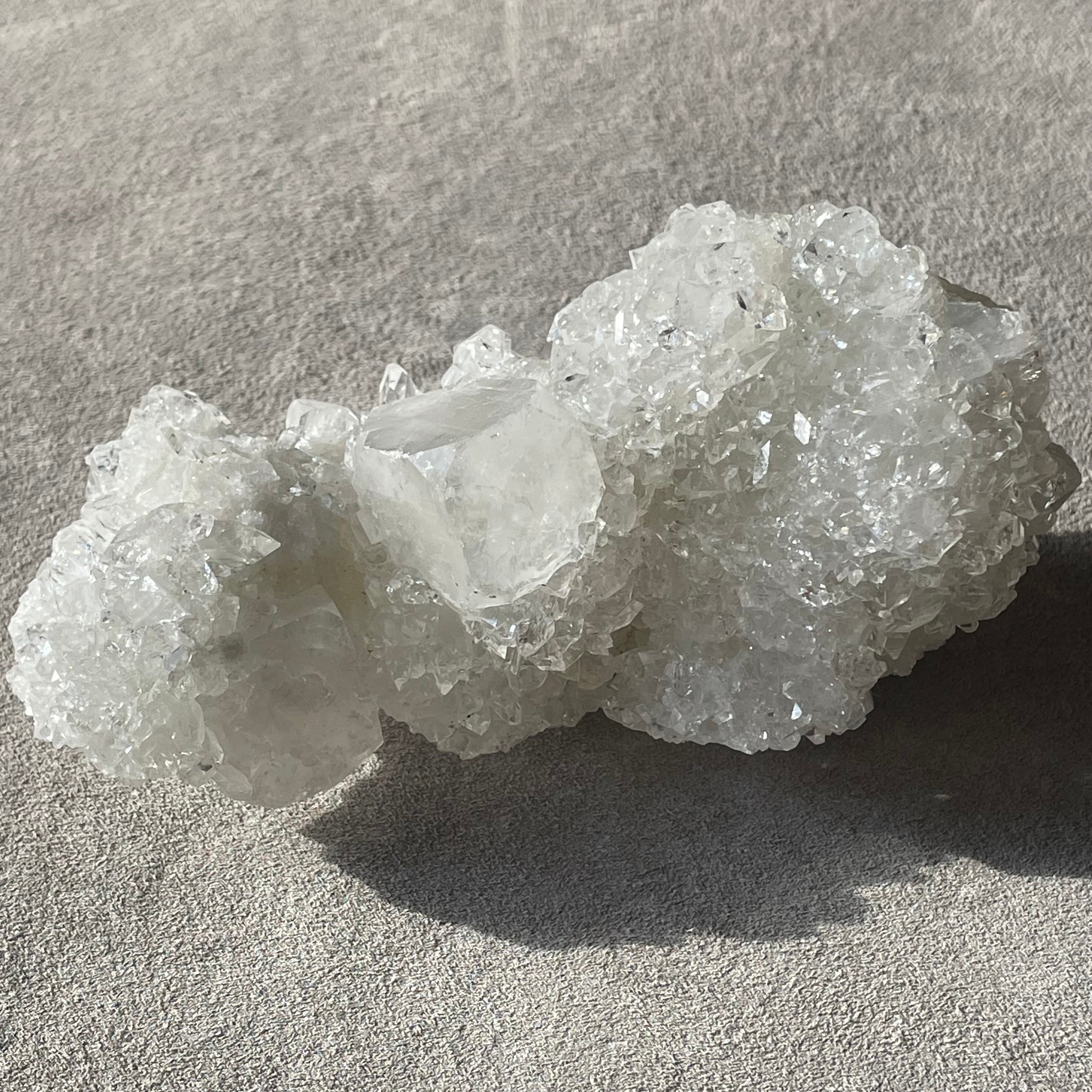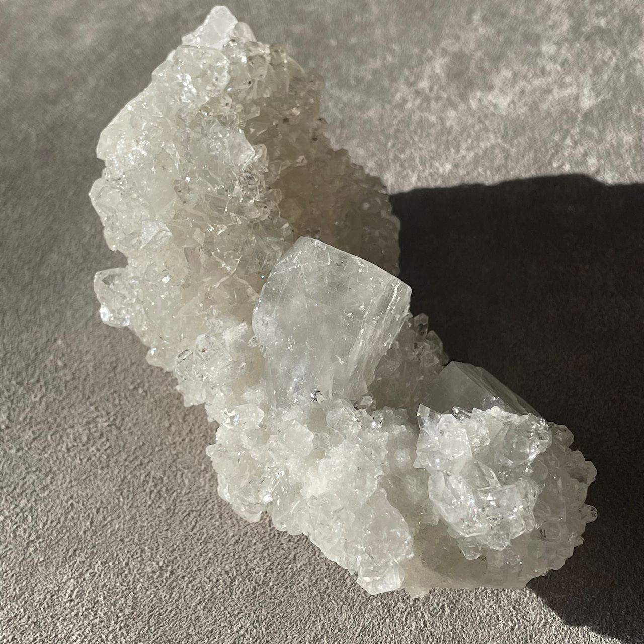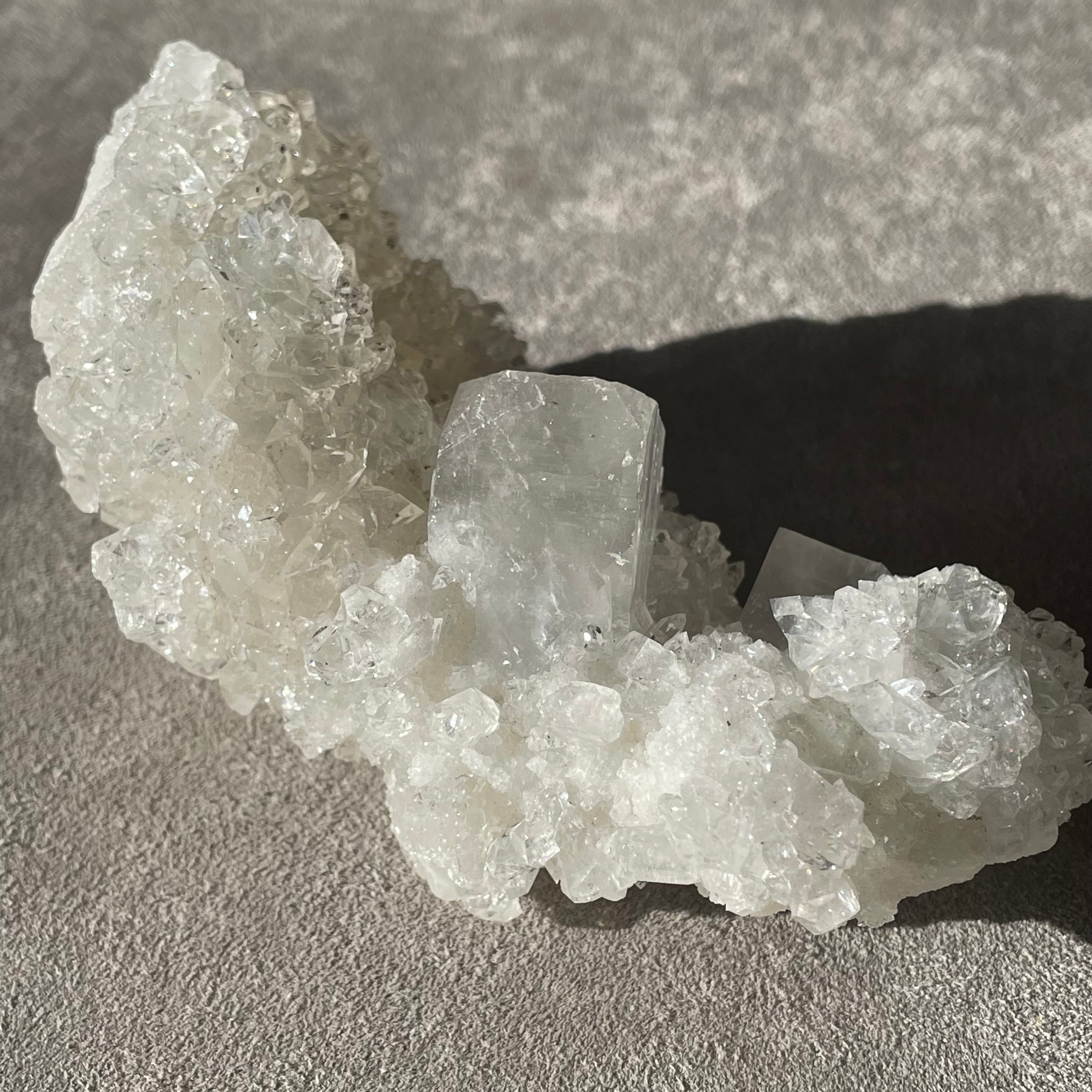 輝きのあるアポフィライトの中央にひときわ大きく成長した短柱状のアポフィライトが存在感を出しています。