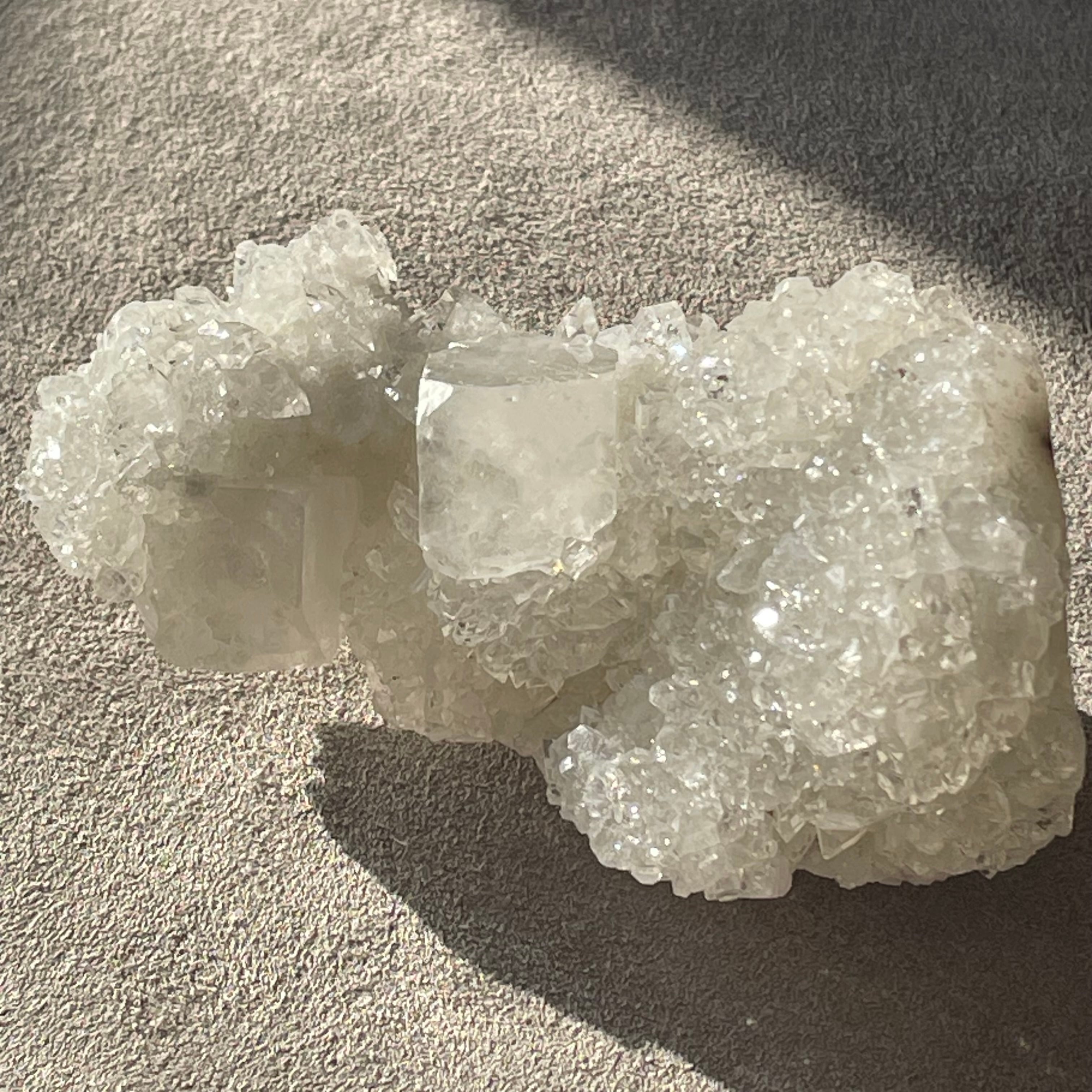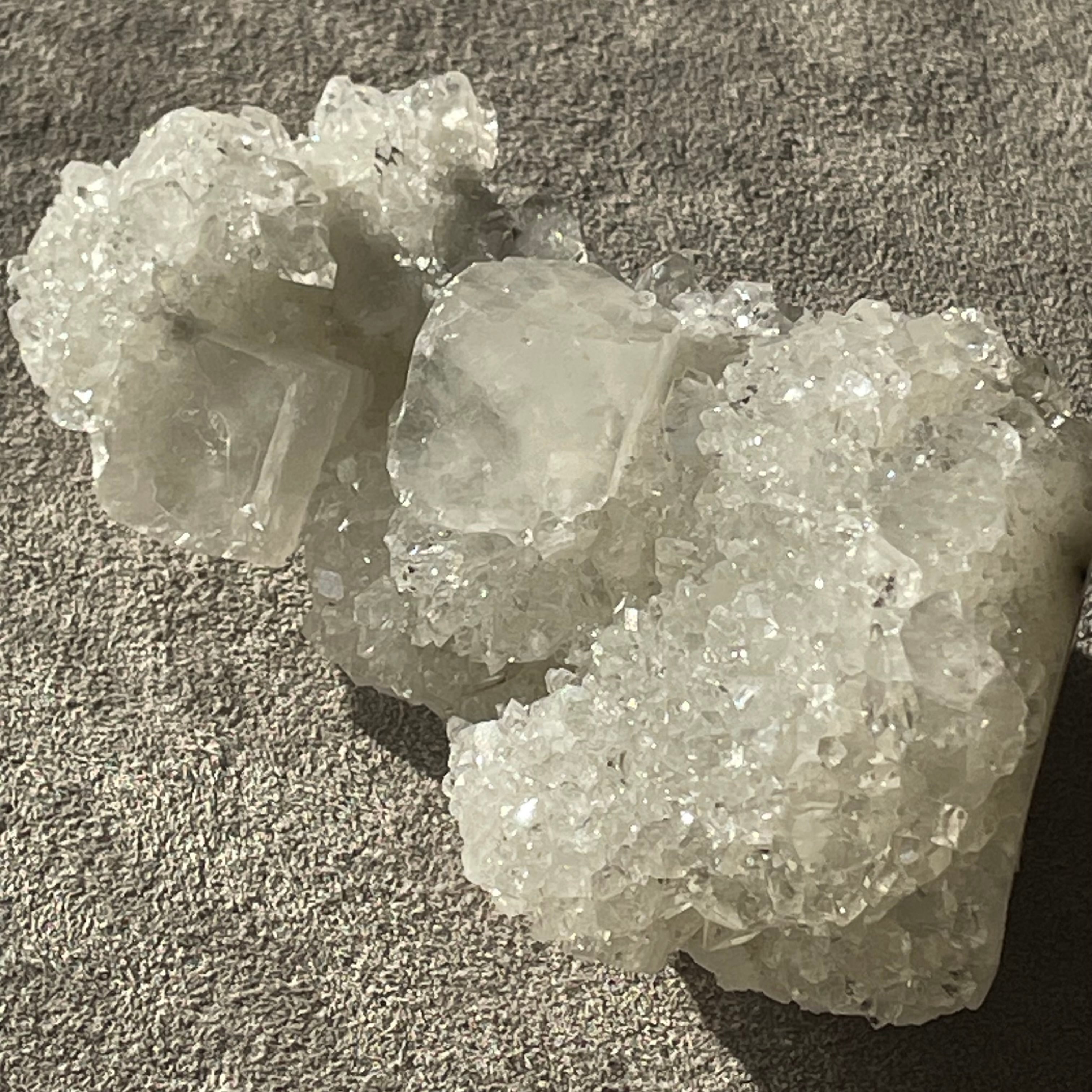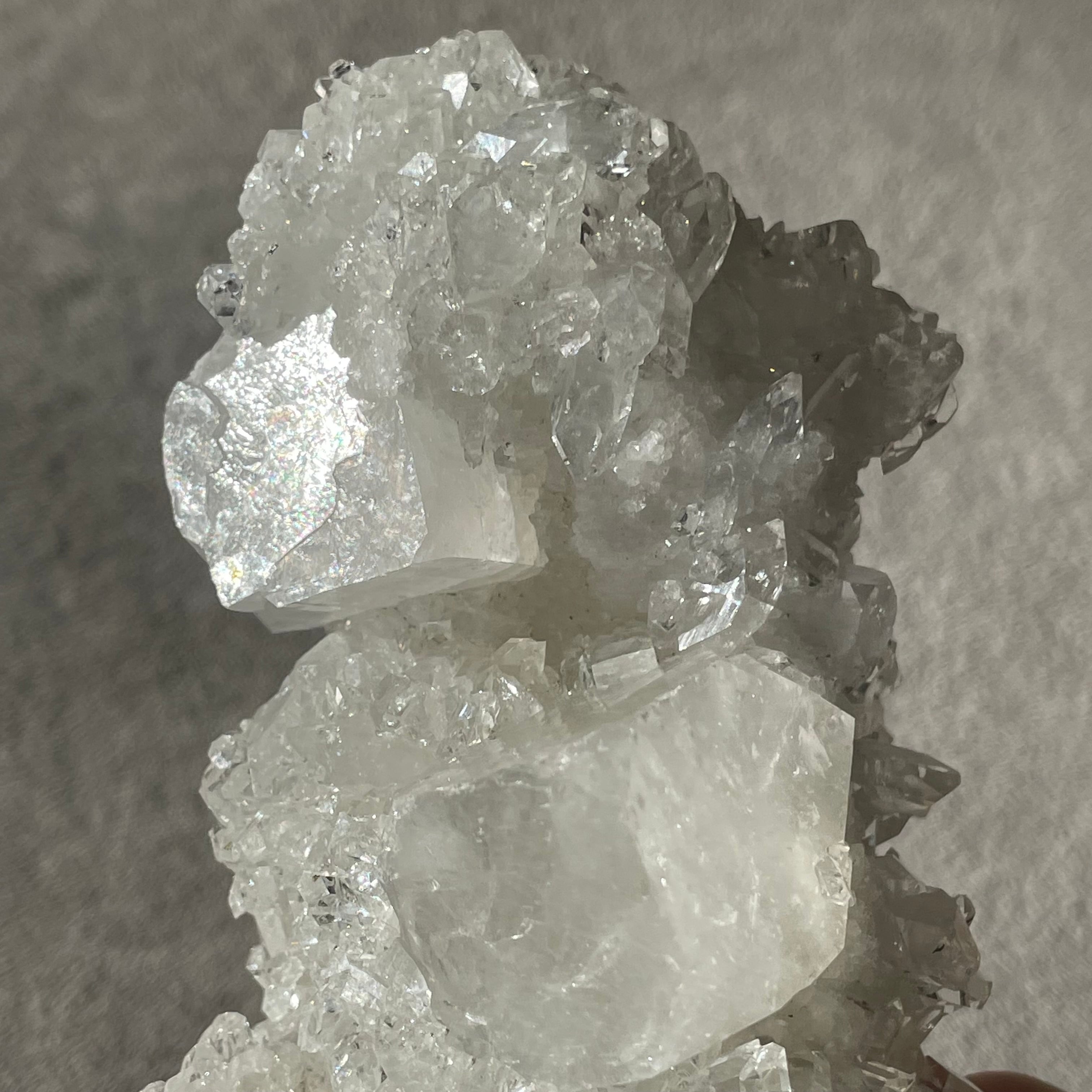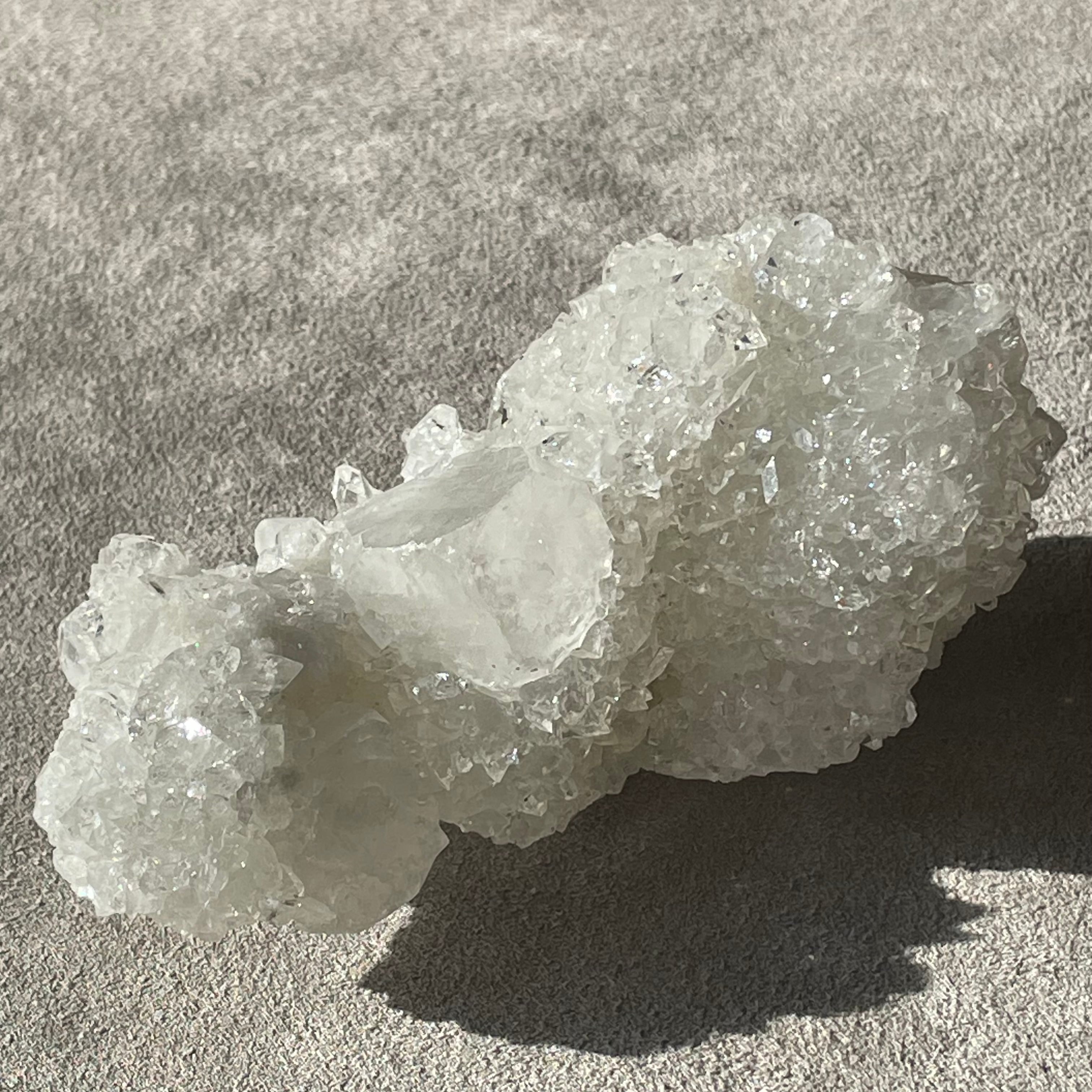 輝きのあるアポフィライトの中央にひときわ大きく成長した短柱状のアポフィライトが存在感を出しています。