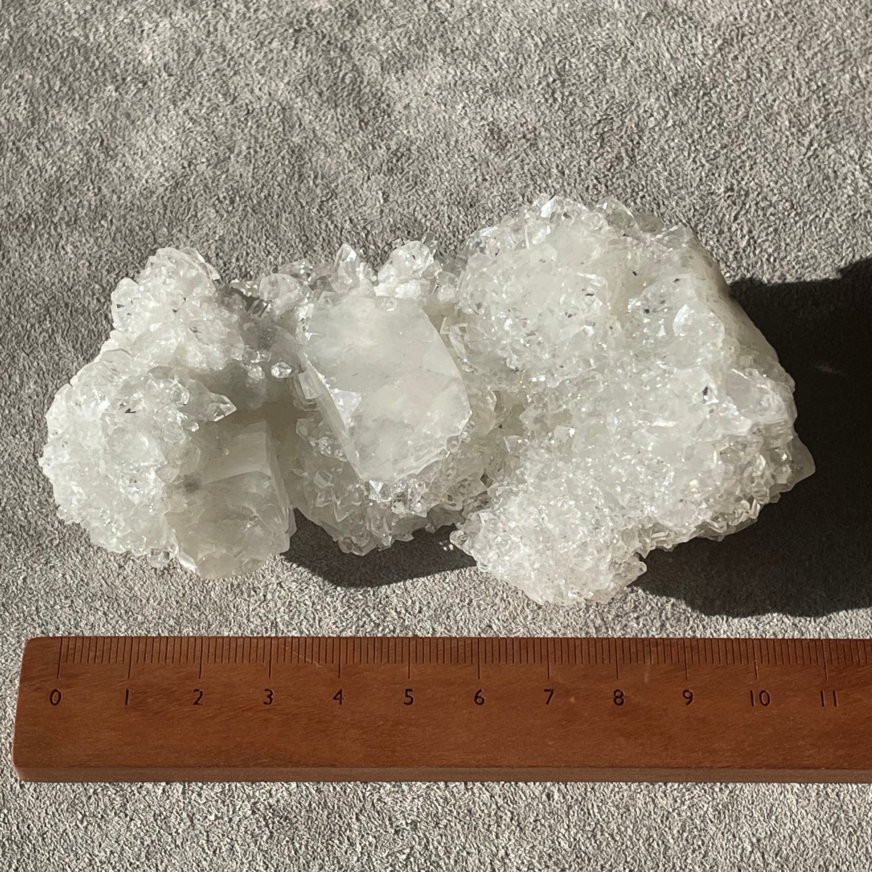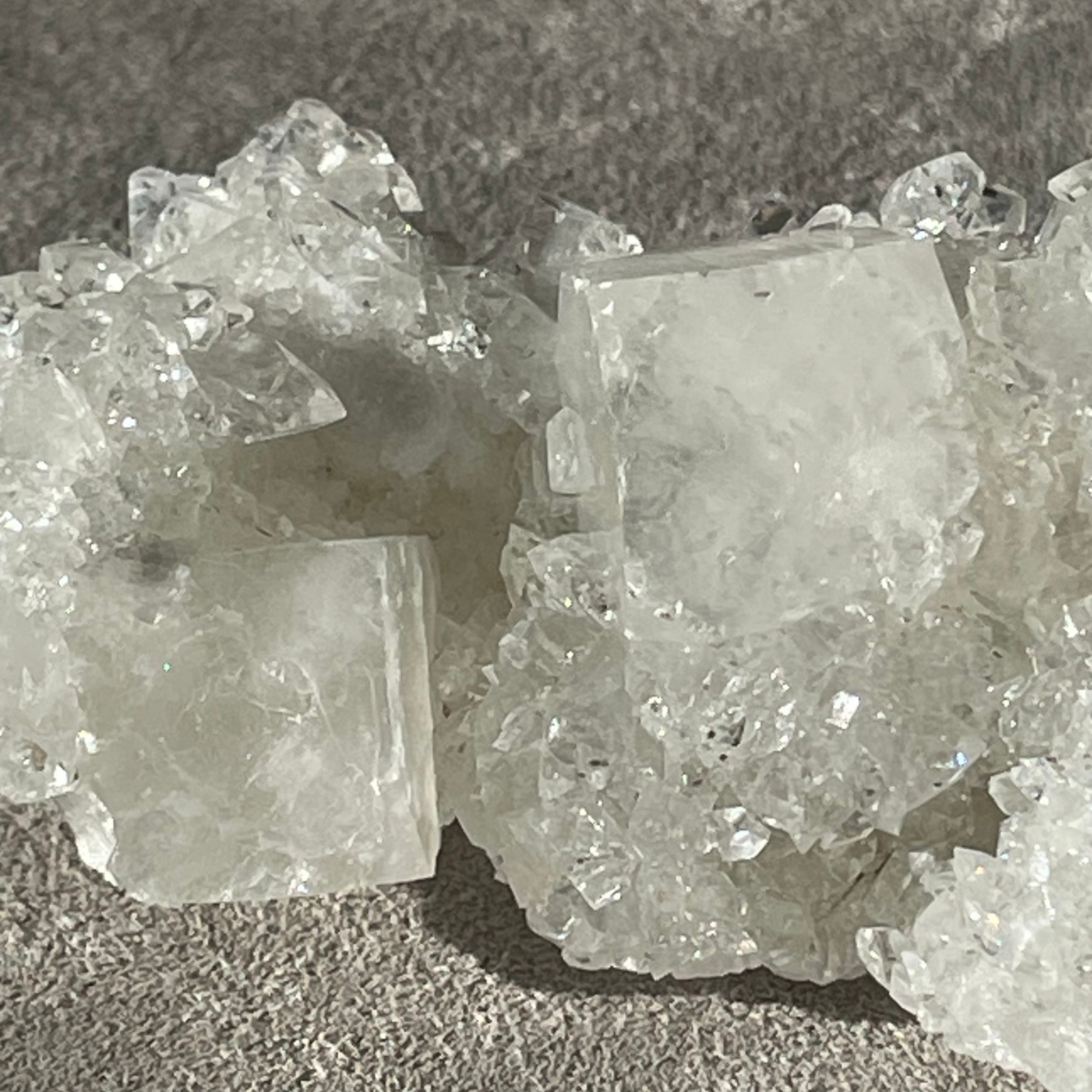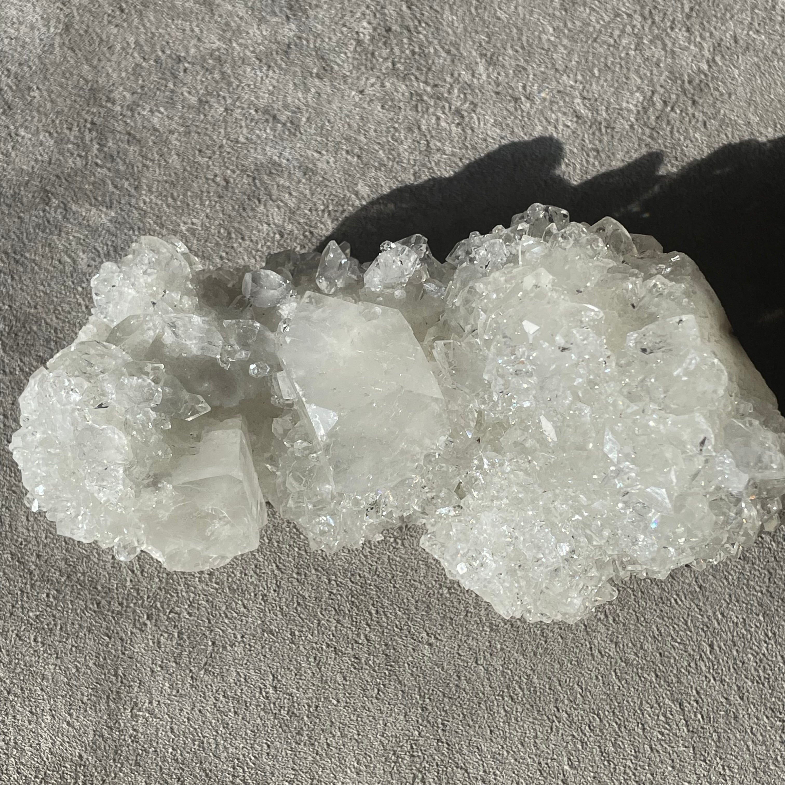 アポフィライトは世界各地で産出される石で、一見水晶に似ていますが輪切りにすると水晶は六角形であるのに対し、アポフィライトは四角形をしています。