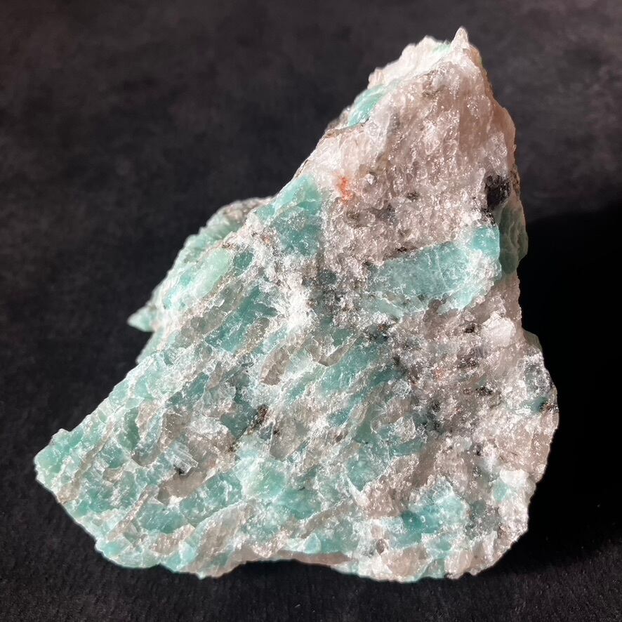 アマゾナイトは長石グループのマイクロクリン(微斜長石)に属する石で爽やかな青緑色の発色は微量の鉛イオンによるものです。