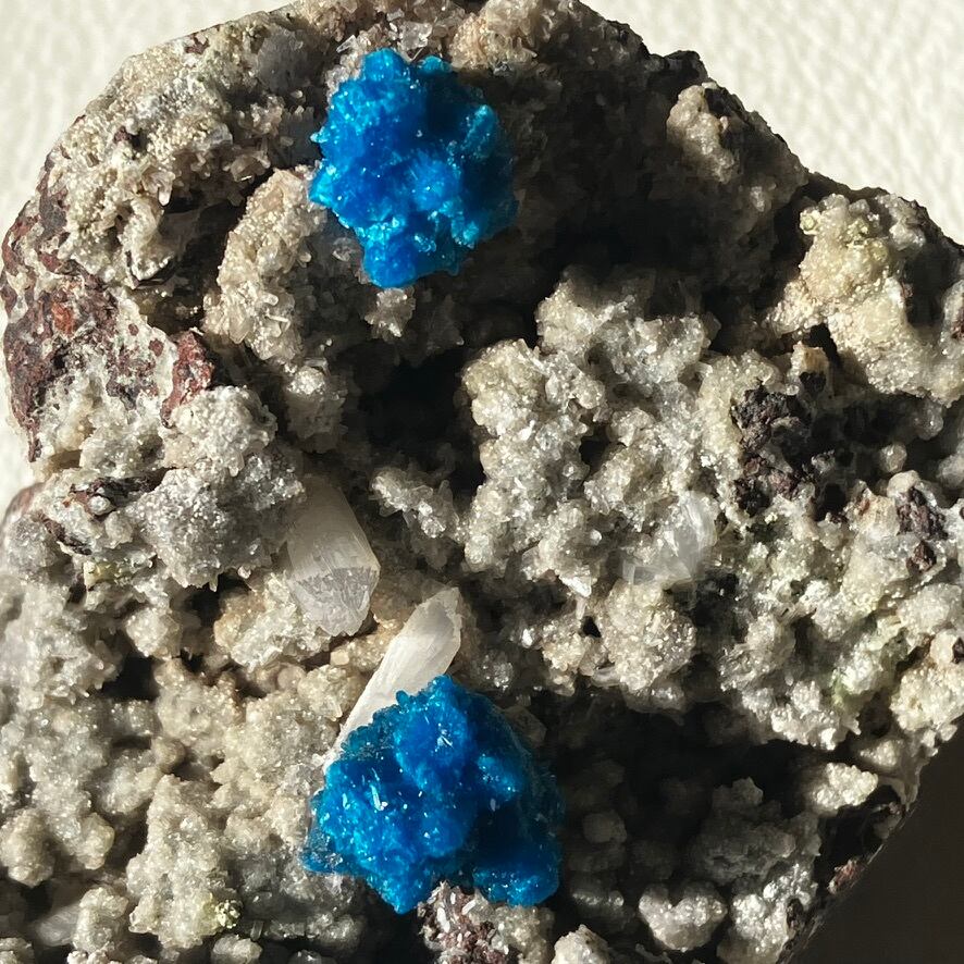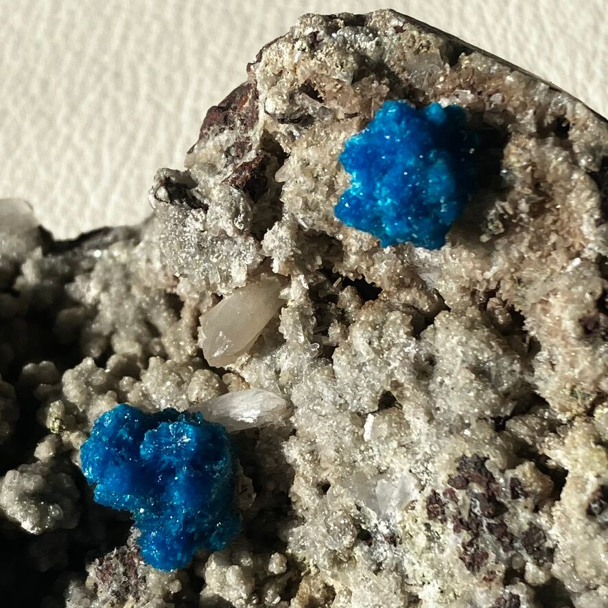 一目を引く鮮やかな青色はバナジウムによりものです。色の濃さはバナジウムの濃度に影響しており、濃度が高いほど青みが強くなり、針のような結晶が放射線状に成長します。