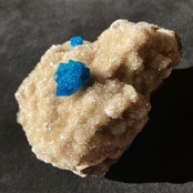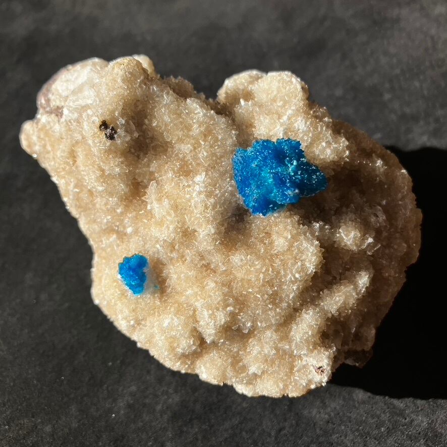一目を引く鮮やかな青色はバナジウムによりものです。色の濃さはバナジウムの濃度に影響しており、濃度が高いほど青みが強くなり、針のような結晶が放射線状に成長します。